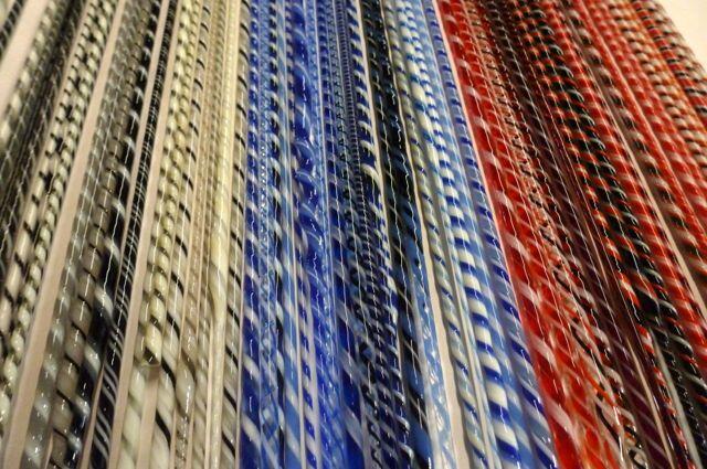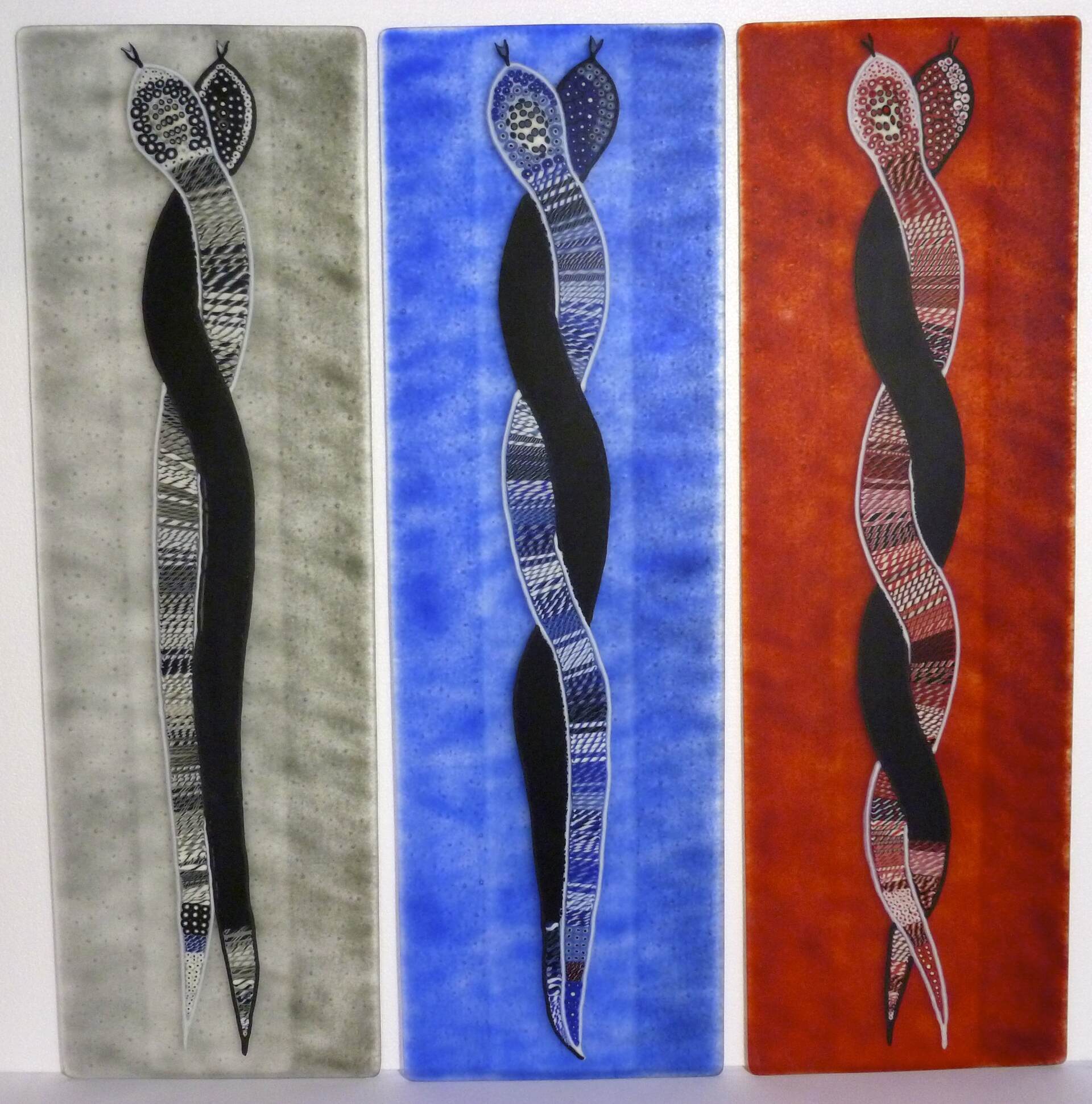 A Twisted Embrace. Kiln-formed, lamp-worked glass. Triptych wall hanging. Each piece measures approx. 875mm H x 275mm W x 7-9mm thick. Wall fittings included. Overall hanging size including spaces is 875mm H x 1000mm W.