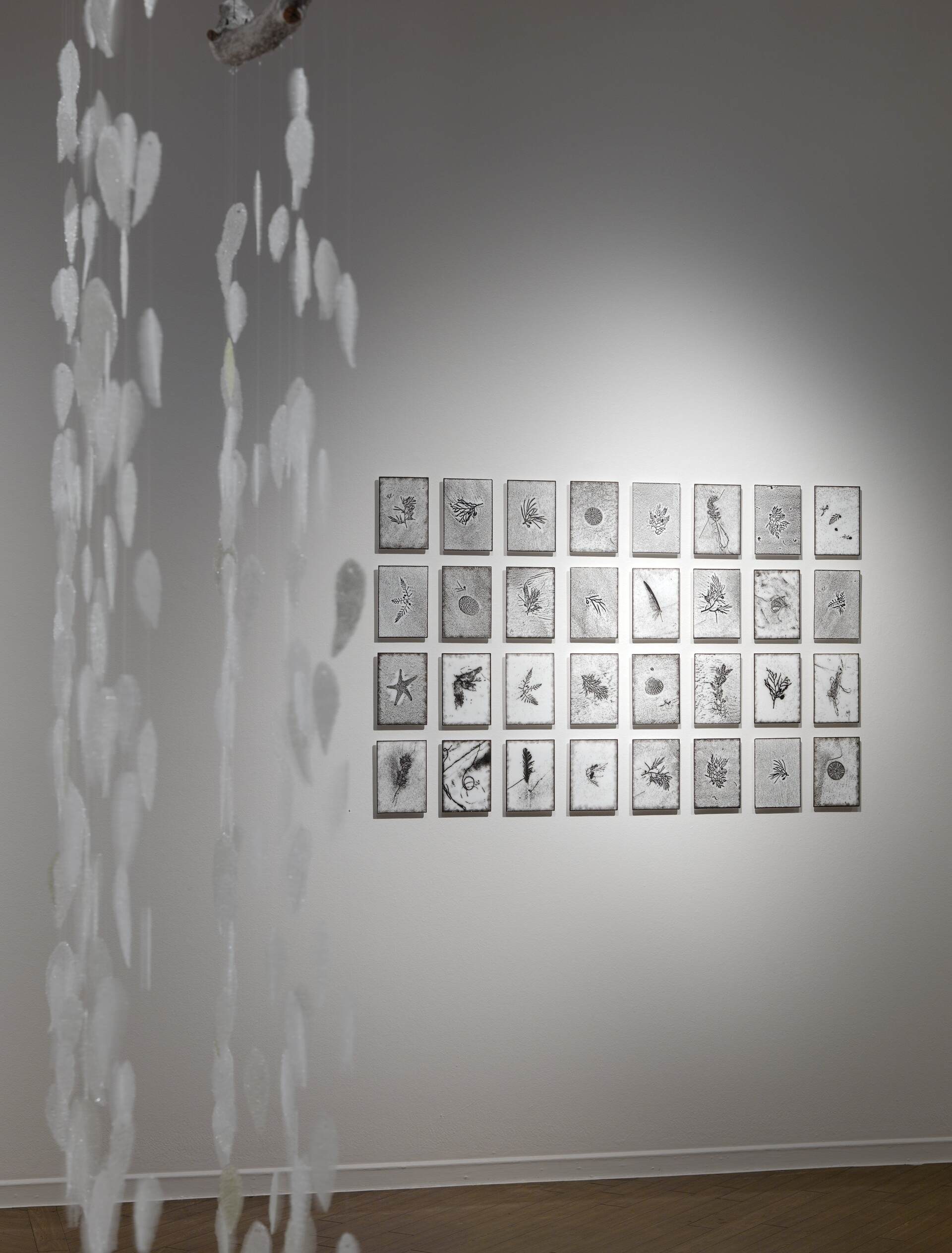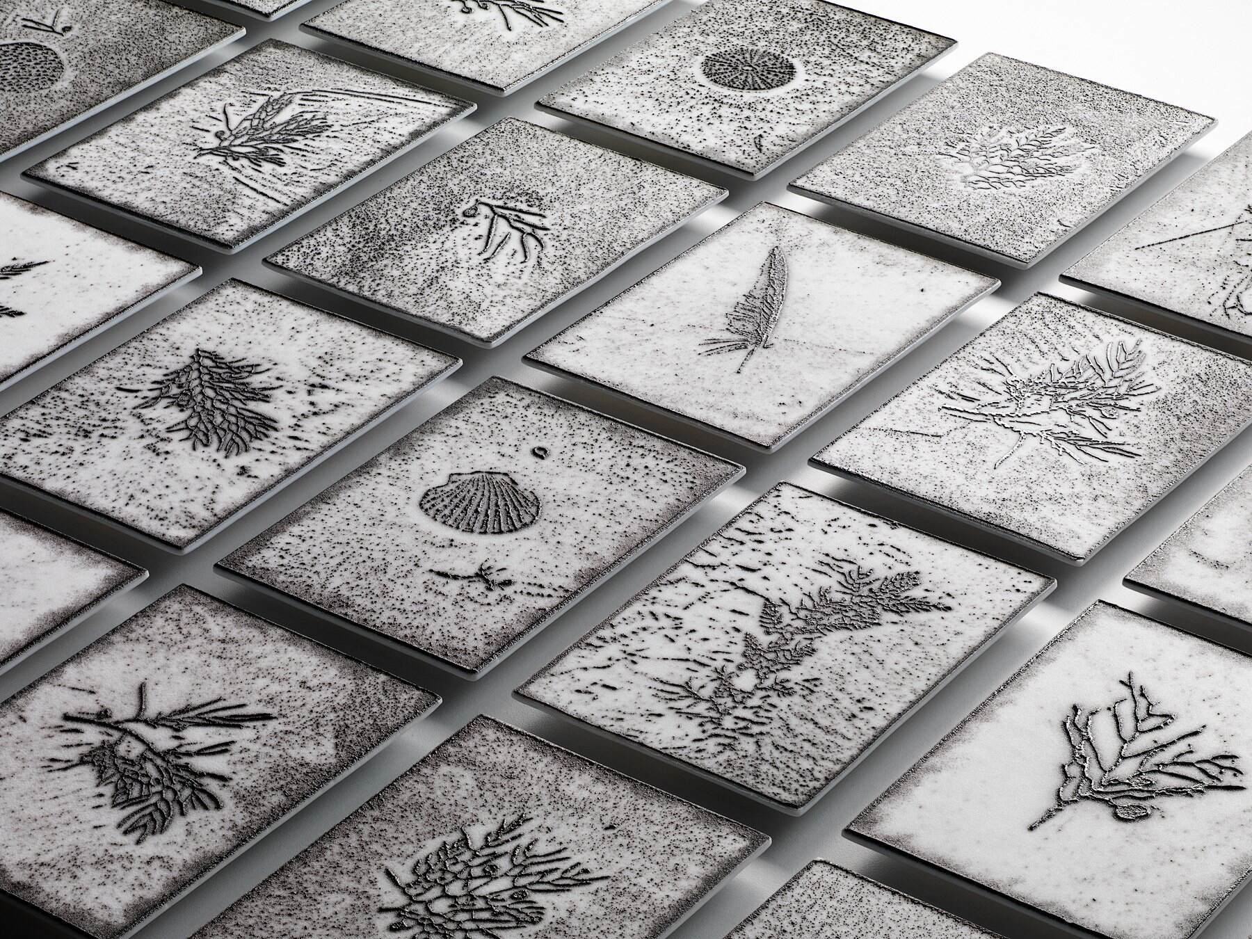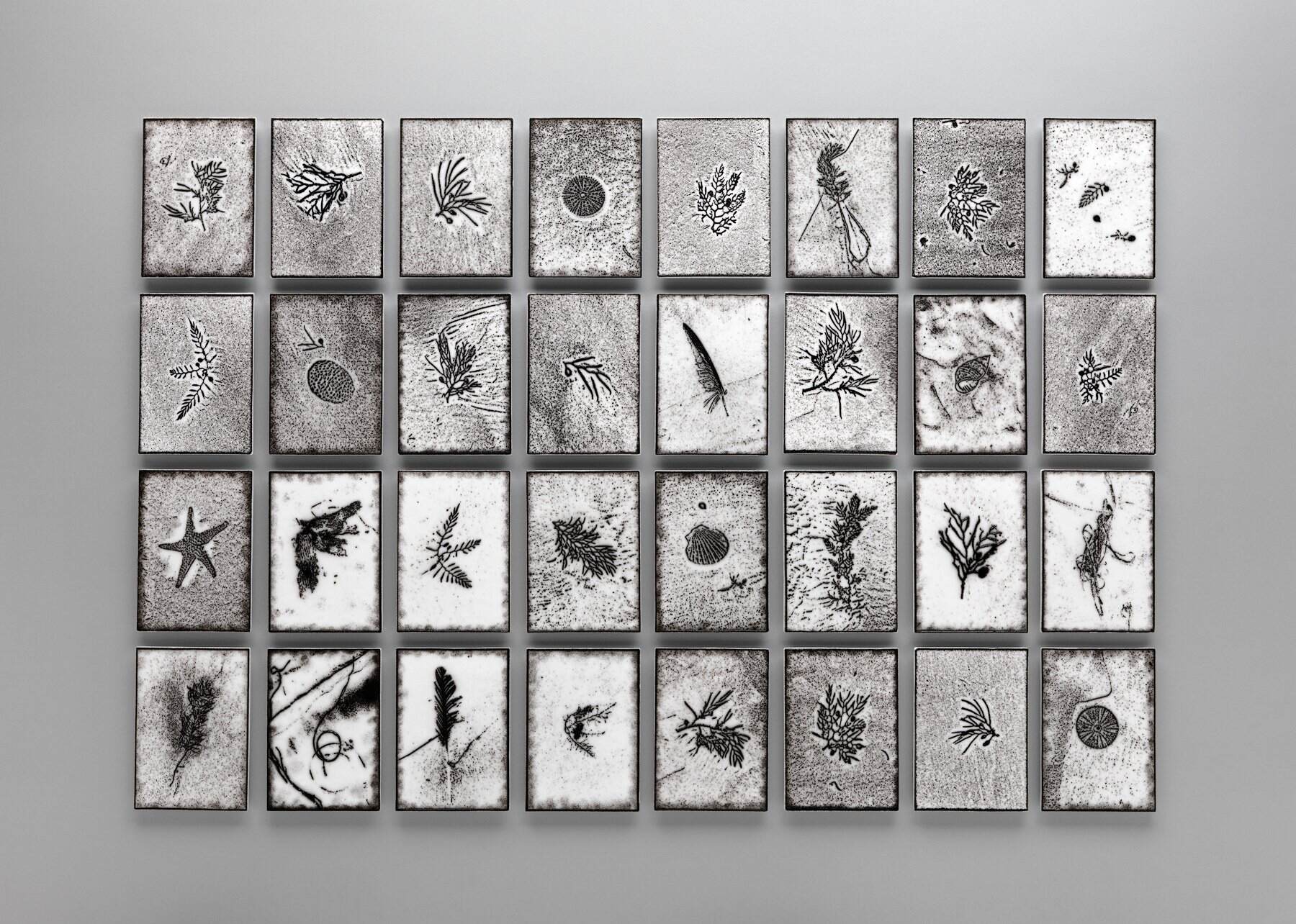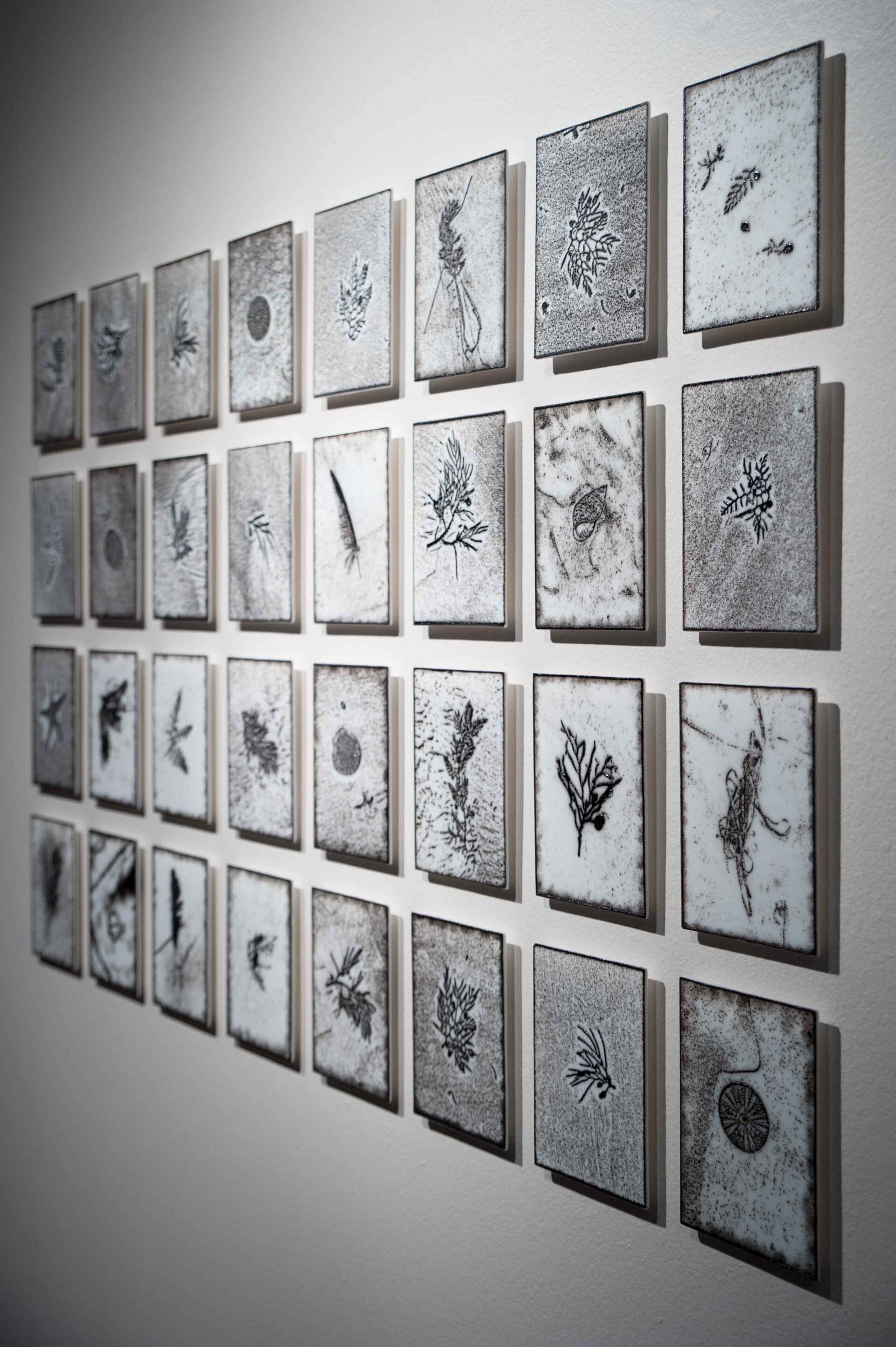 Beach; kiln-formed textural printed glass. 32 pieces of glass each measuring; 140mm x 200 mm x 5mm thick each. Fittings on back 10mm thick. Overall size if hung in shown configuration of four rows of 8 columns including