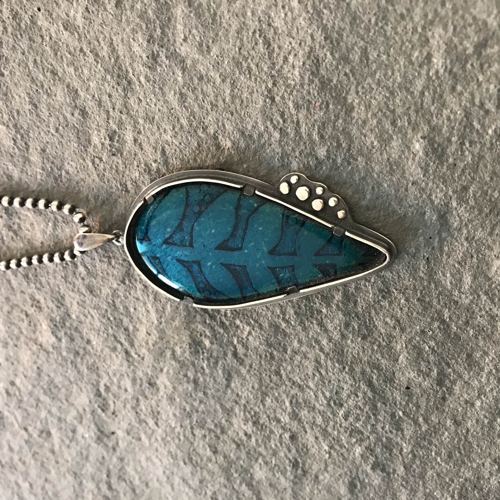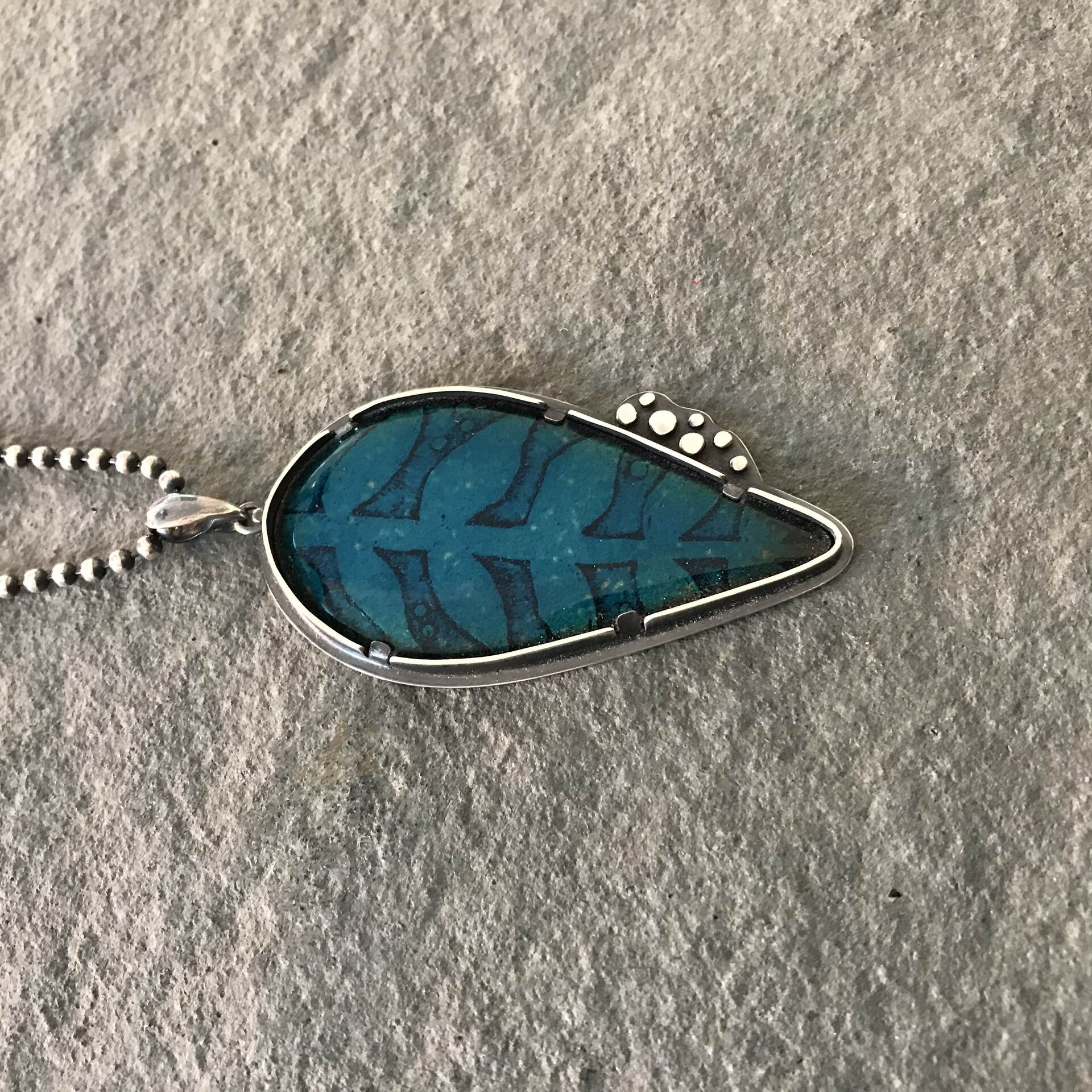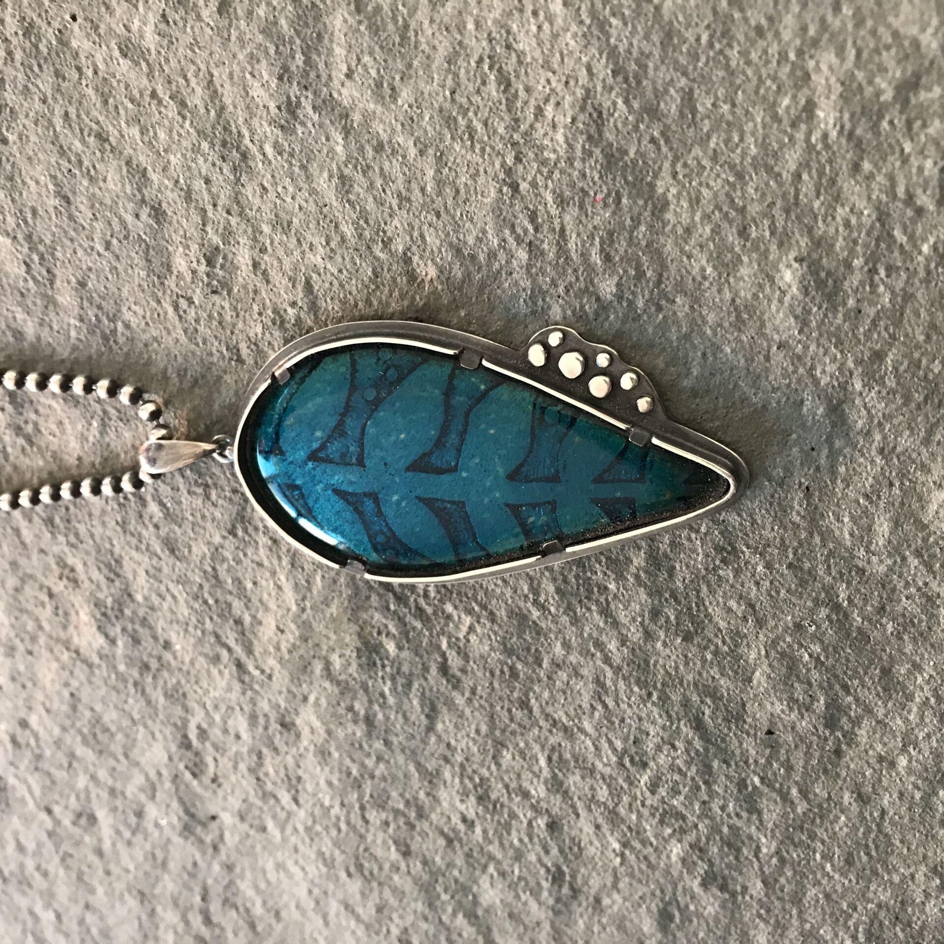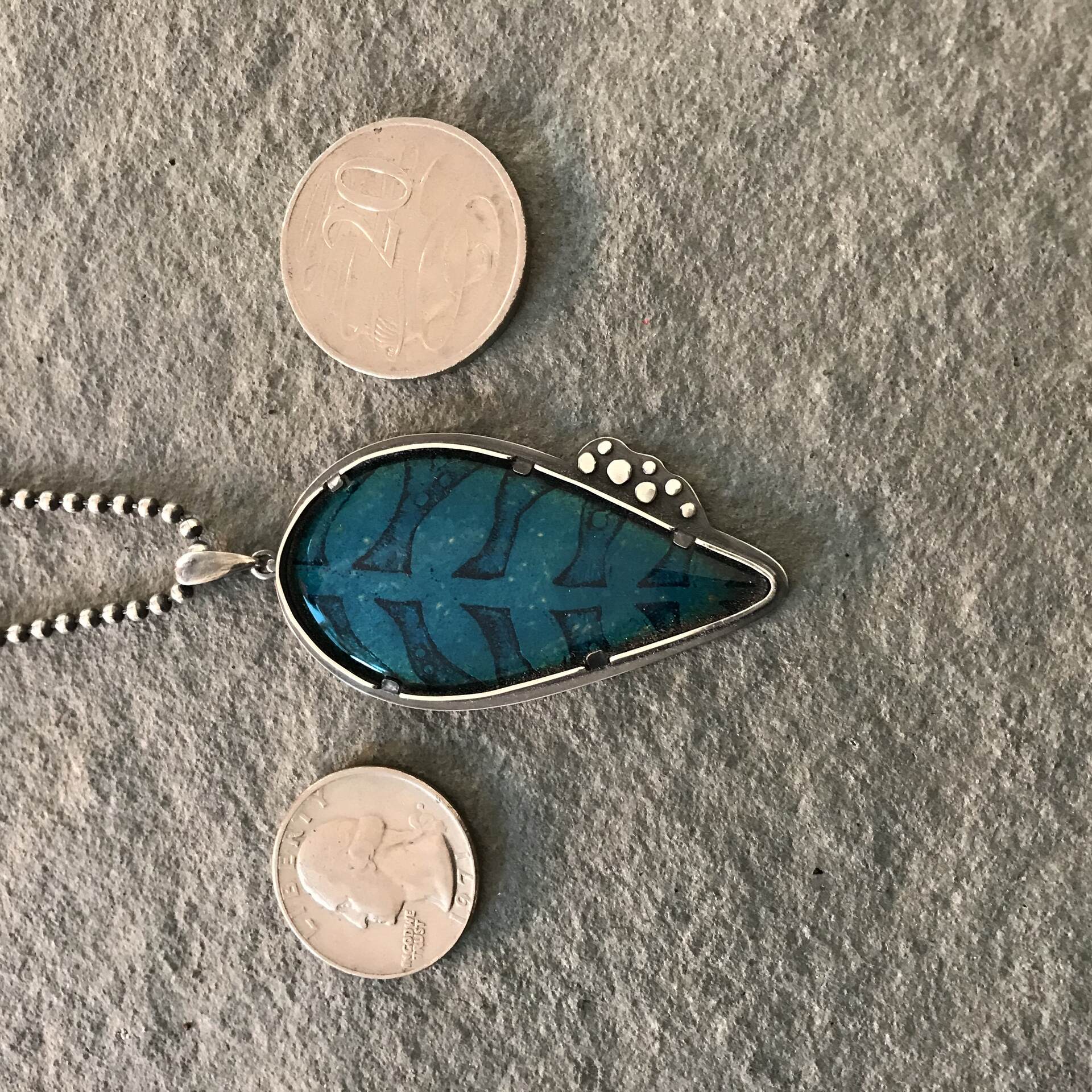Blue Leaf Pendant; Transparent Vitreous enamel on etched copper. Set in hand fabricated Sterling Silver setting. Sterling Silver chain to your requirements. Please mention your preferred chain length with your purchase. Measurement includes bail at top of pendant for the chain.