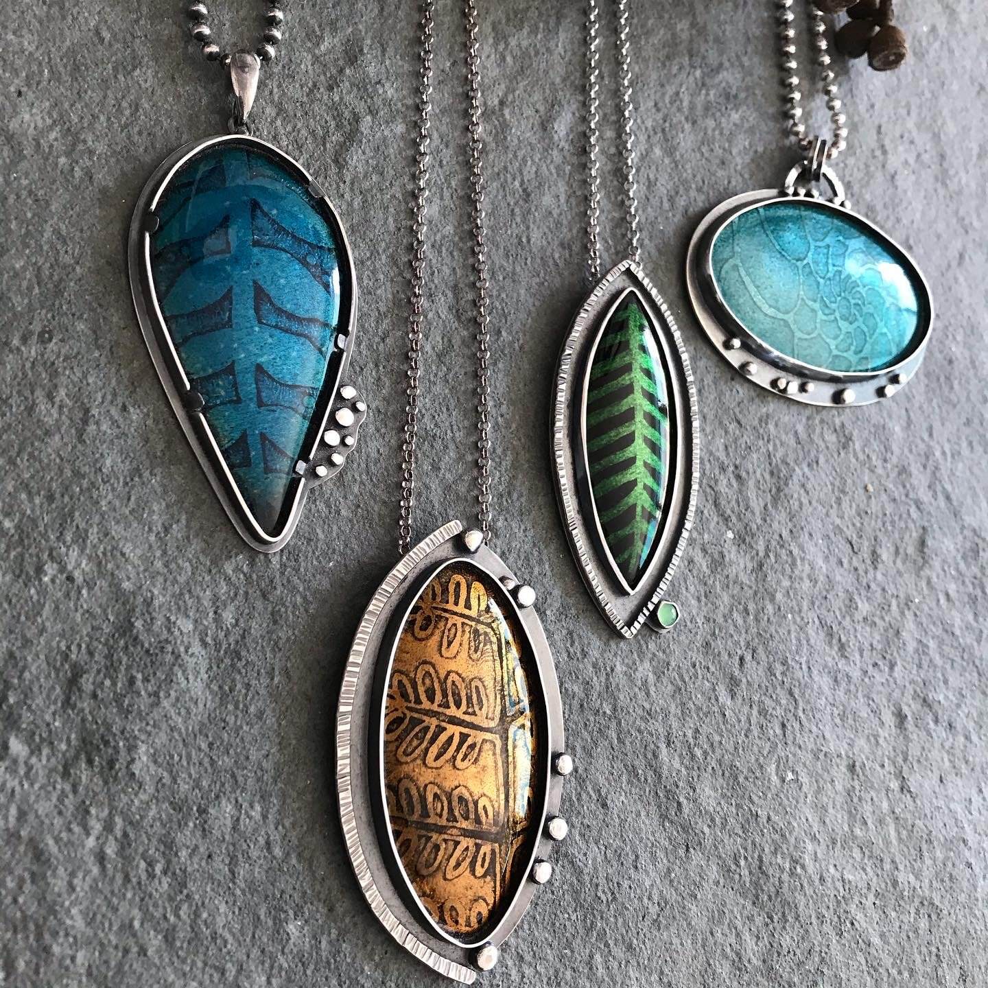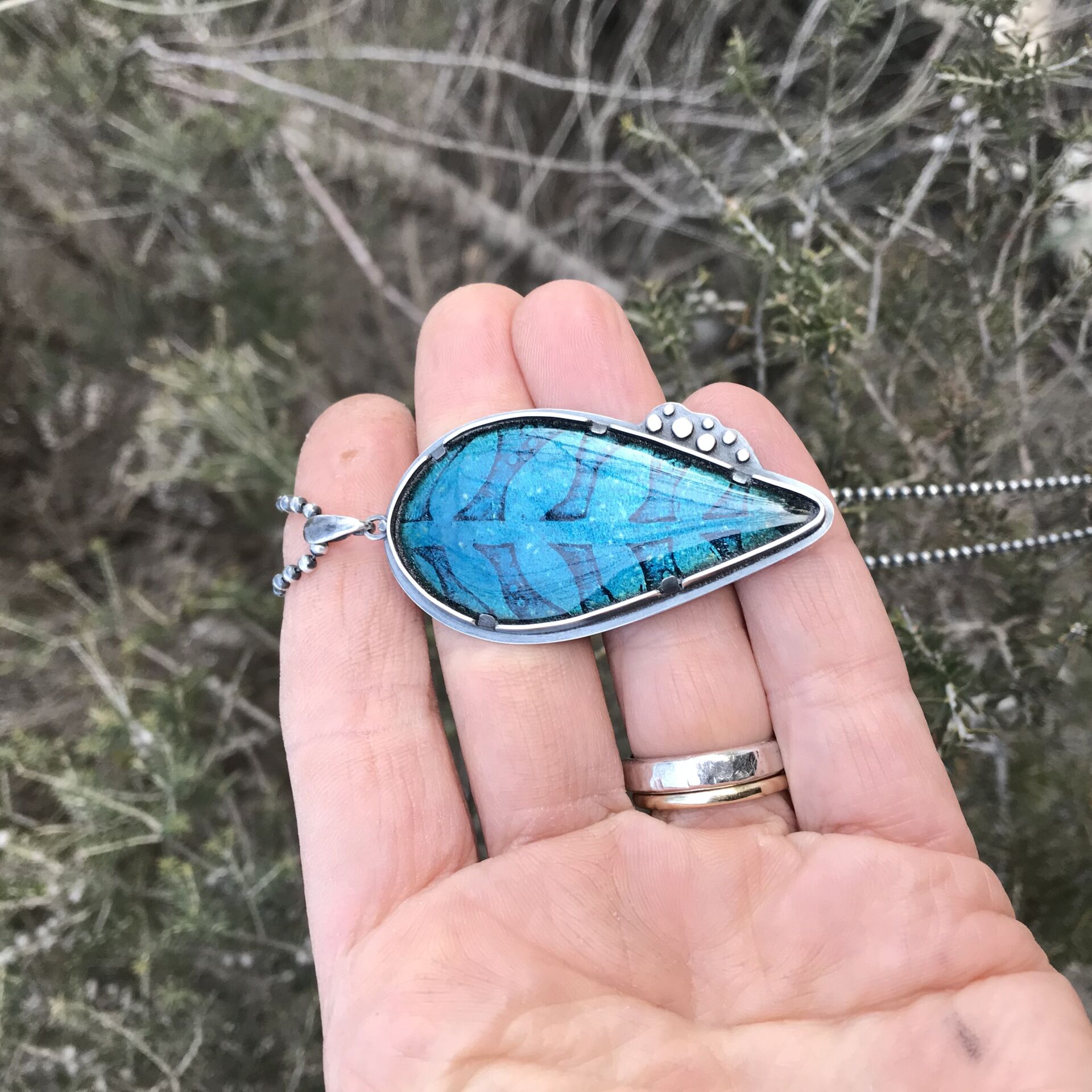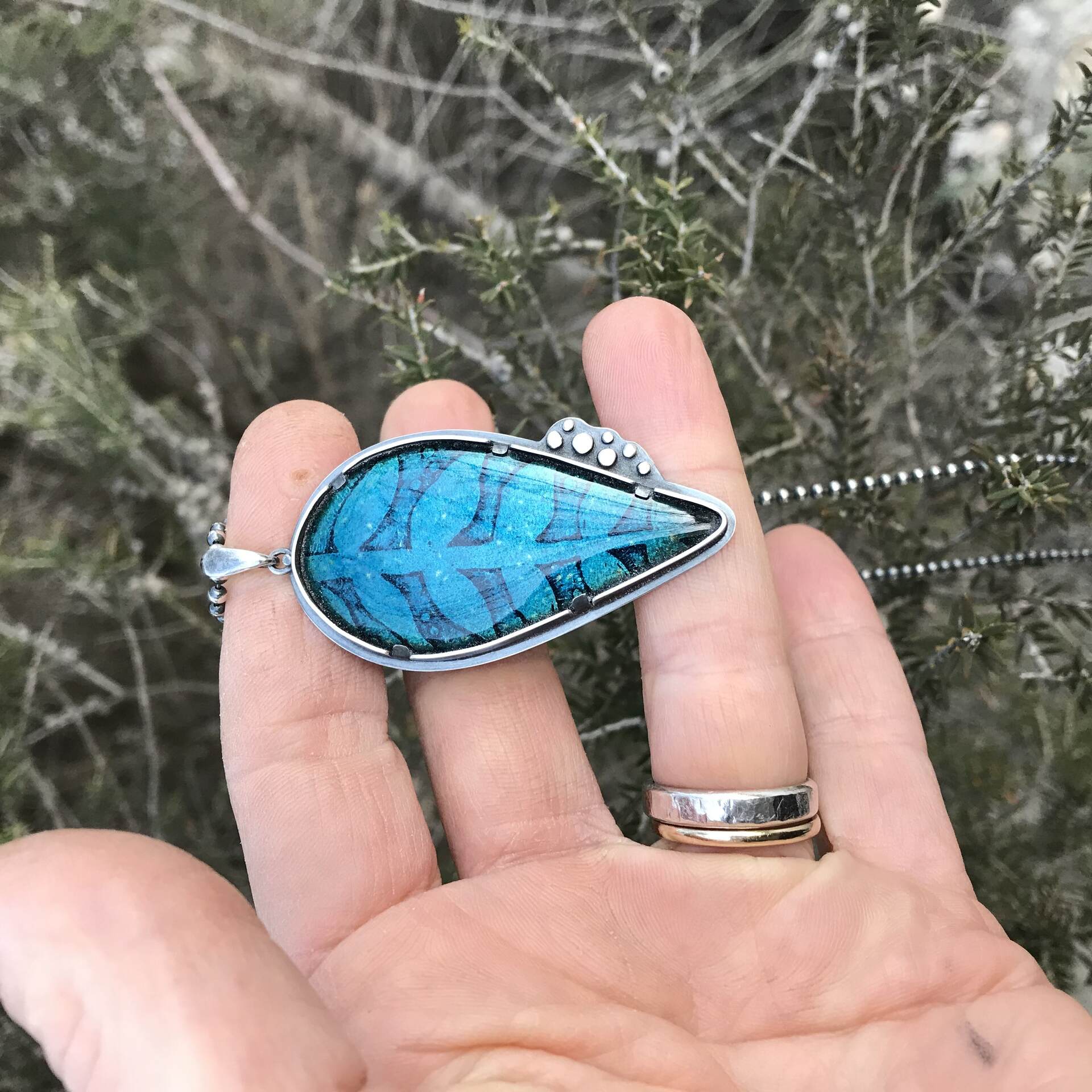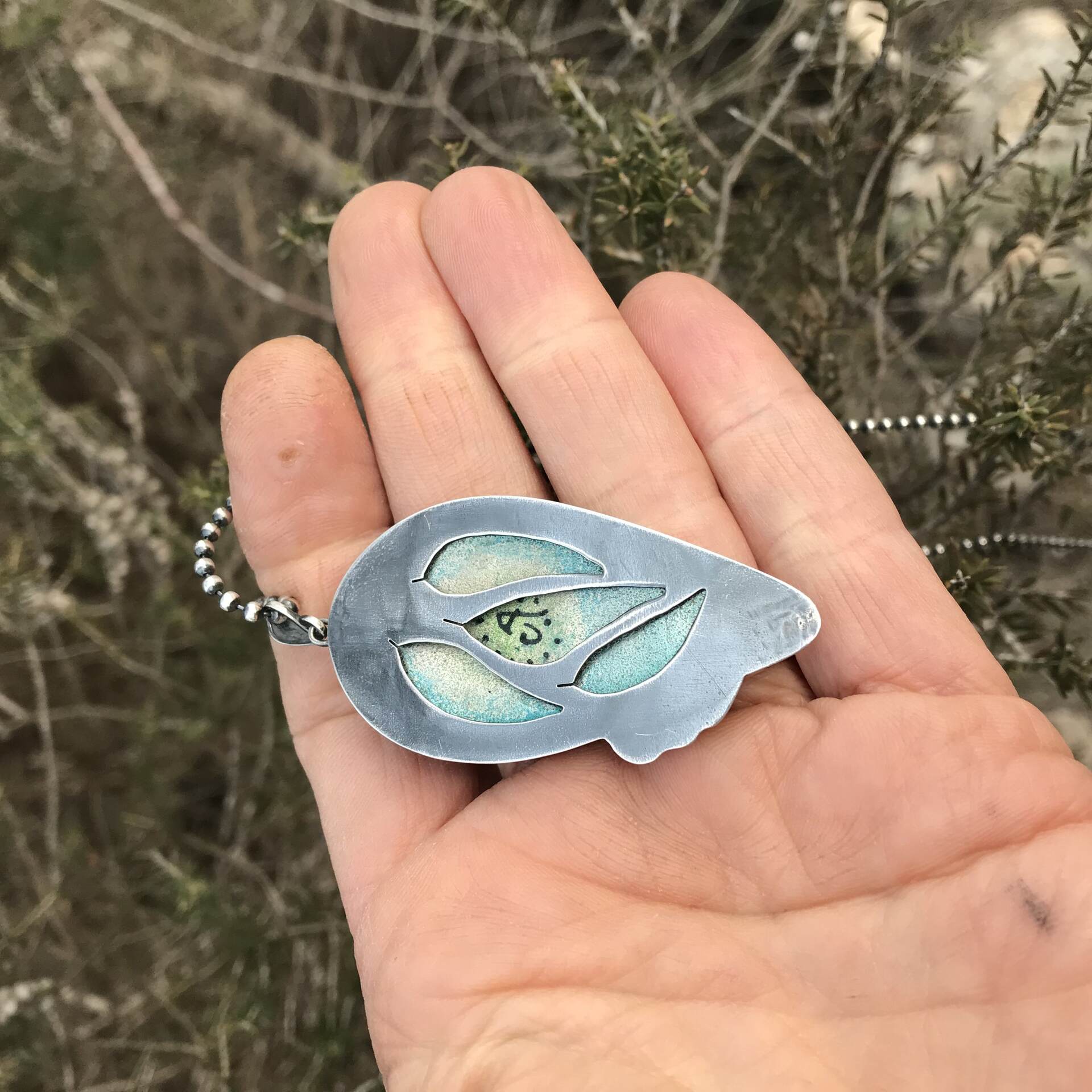 Blue Leaf Pendant; Transparent Vitreous enamel on etched copper. Set in hand fabricated Sterling Silver setting. Sterling Silver chain to your requirements. Please mention your preferred chain length with your purchase. Measurement includes bail at top of pendant for the chain.