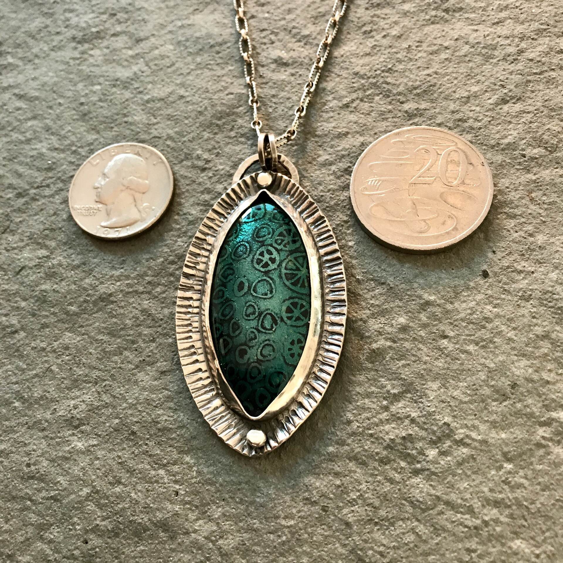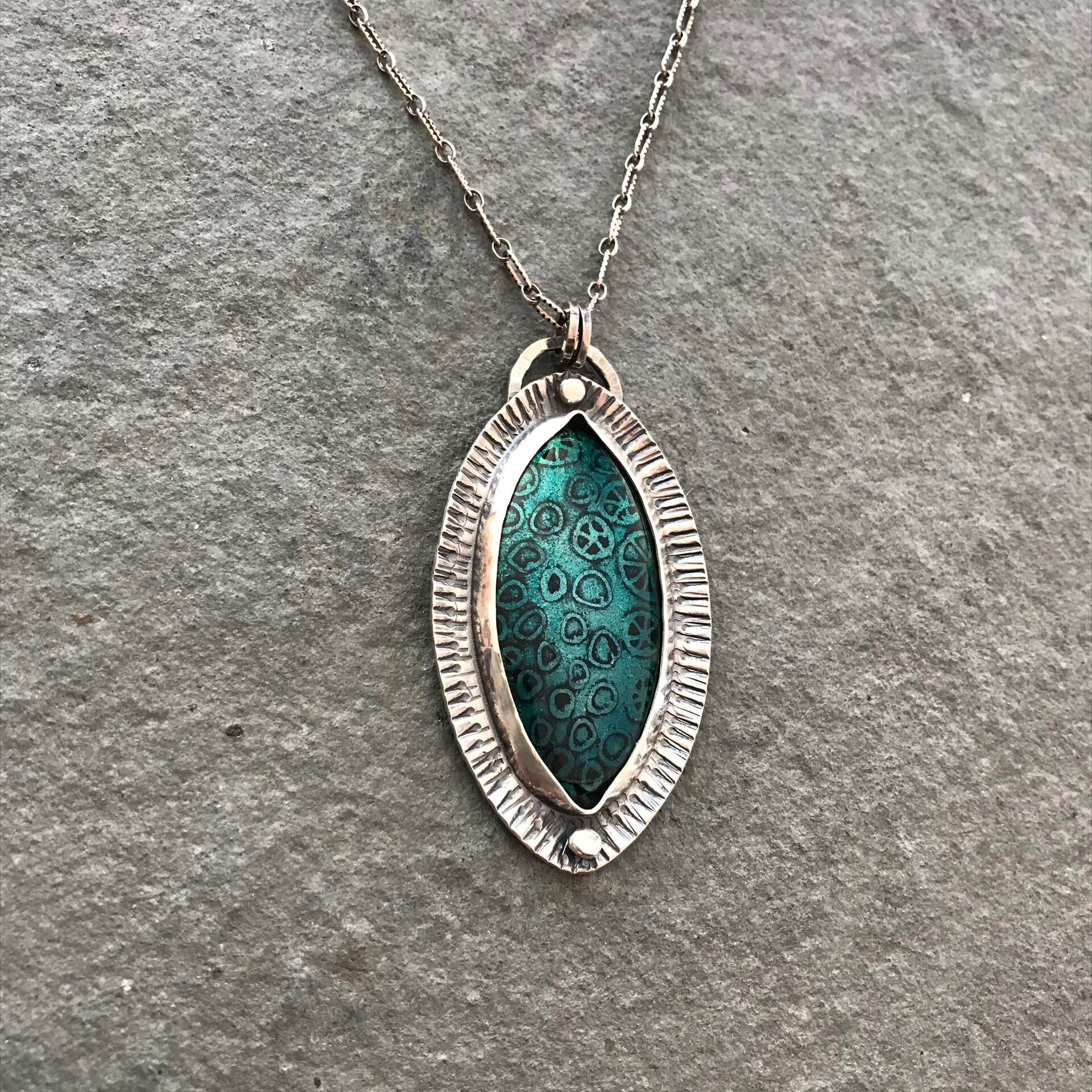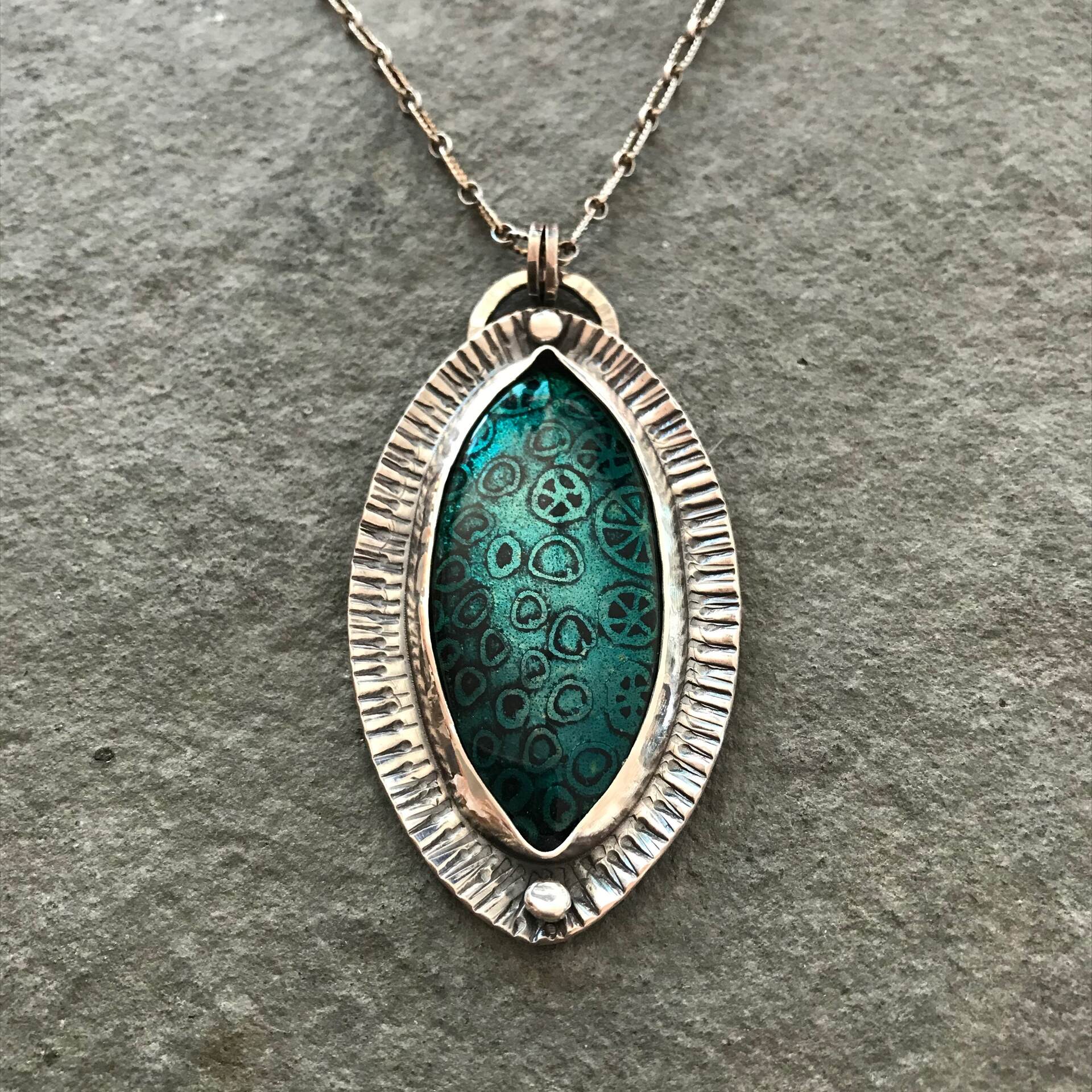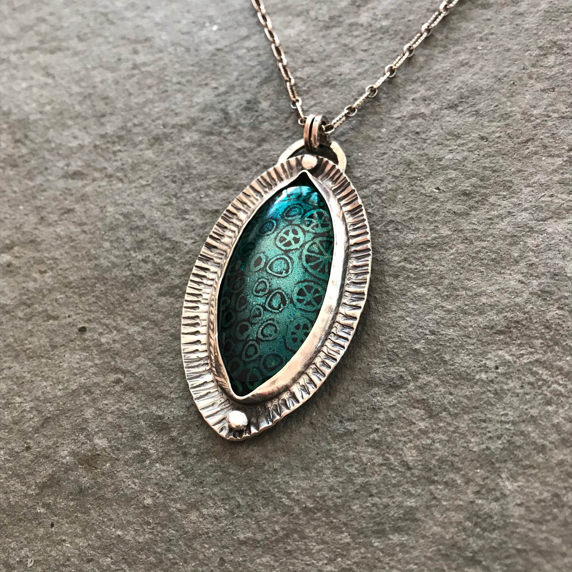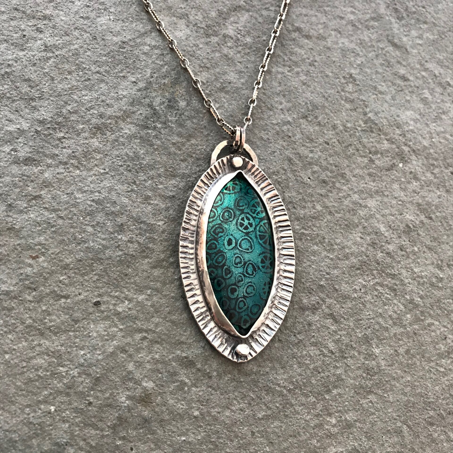Coral Blue Pendant; Transparent Vitreous enamel on etched copper, Sterling silver hand fabricated setting. Sterling silver chain to your requirements. Please comment lenght of chain with your purchase.