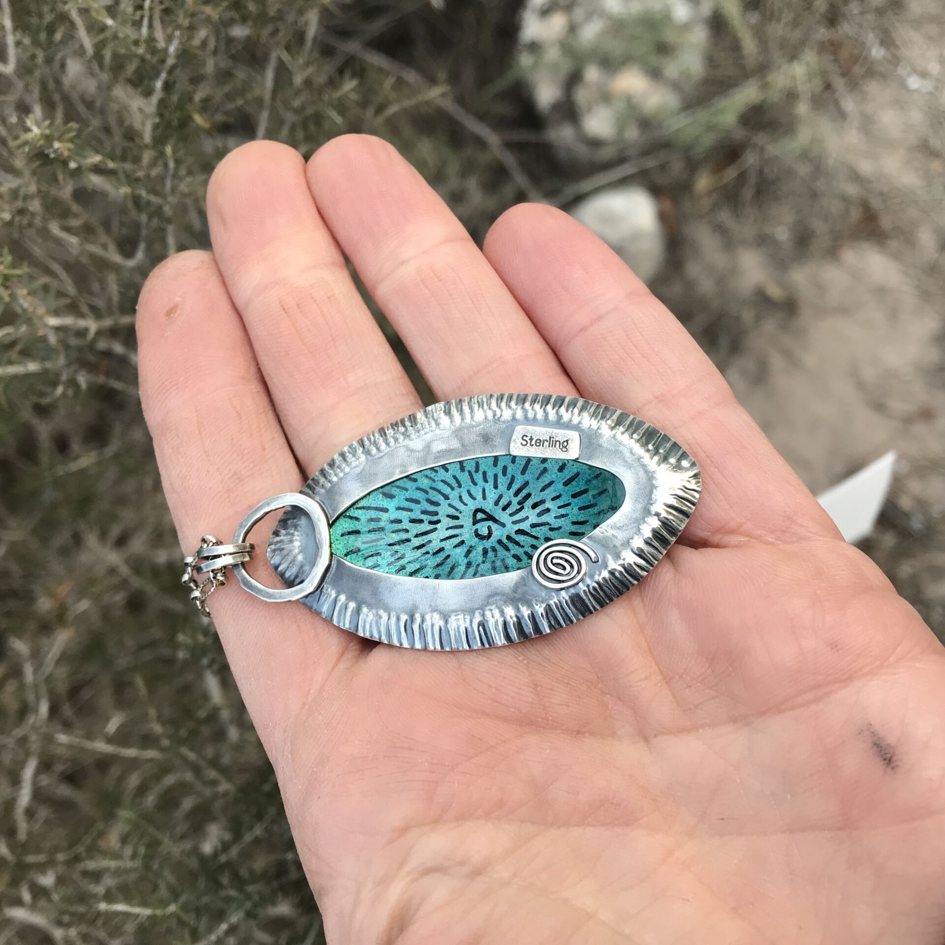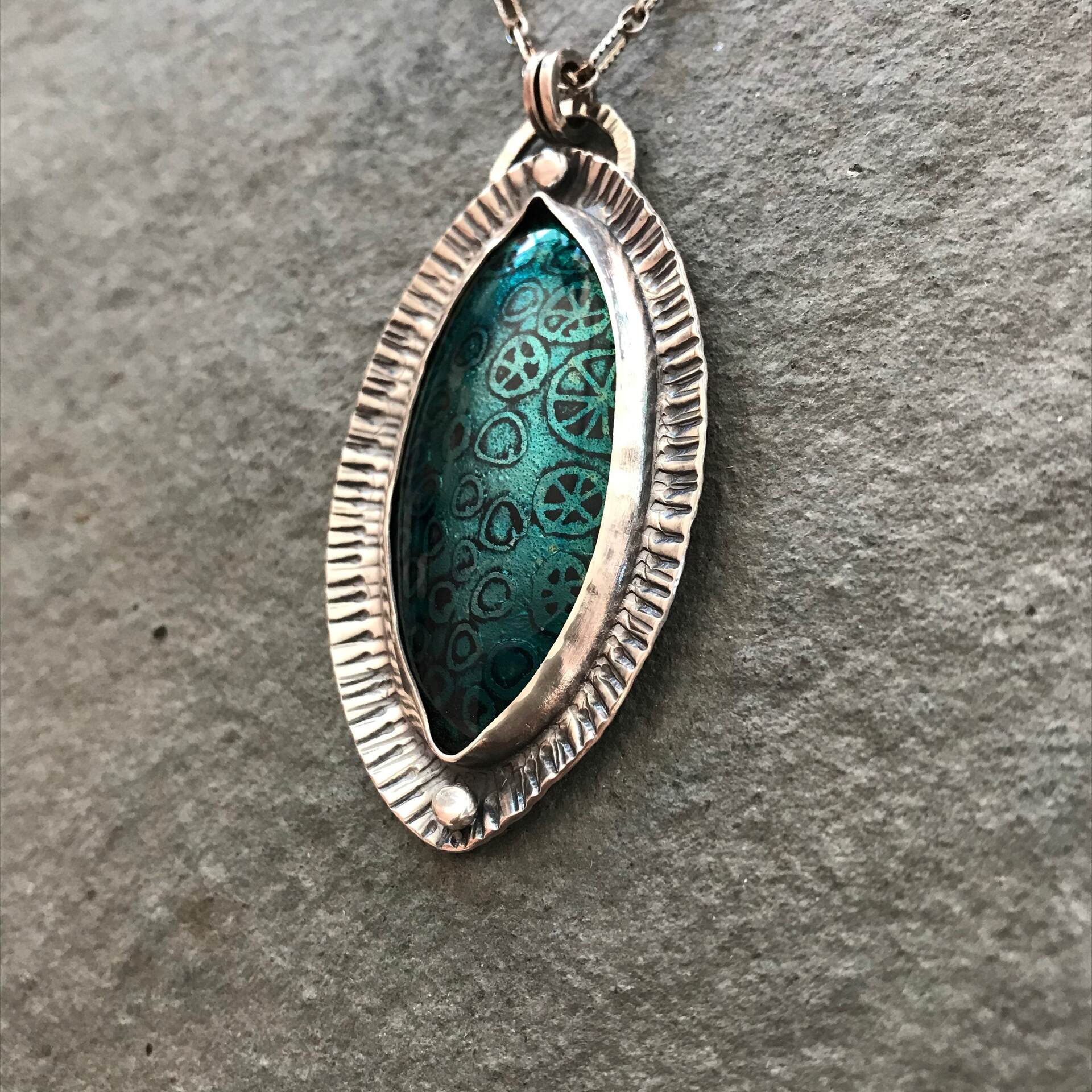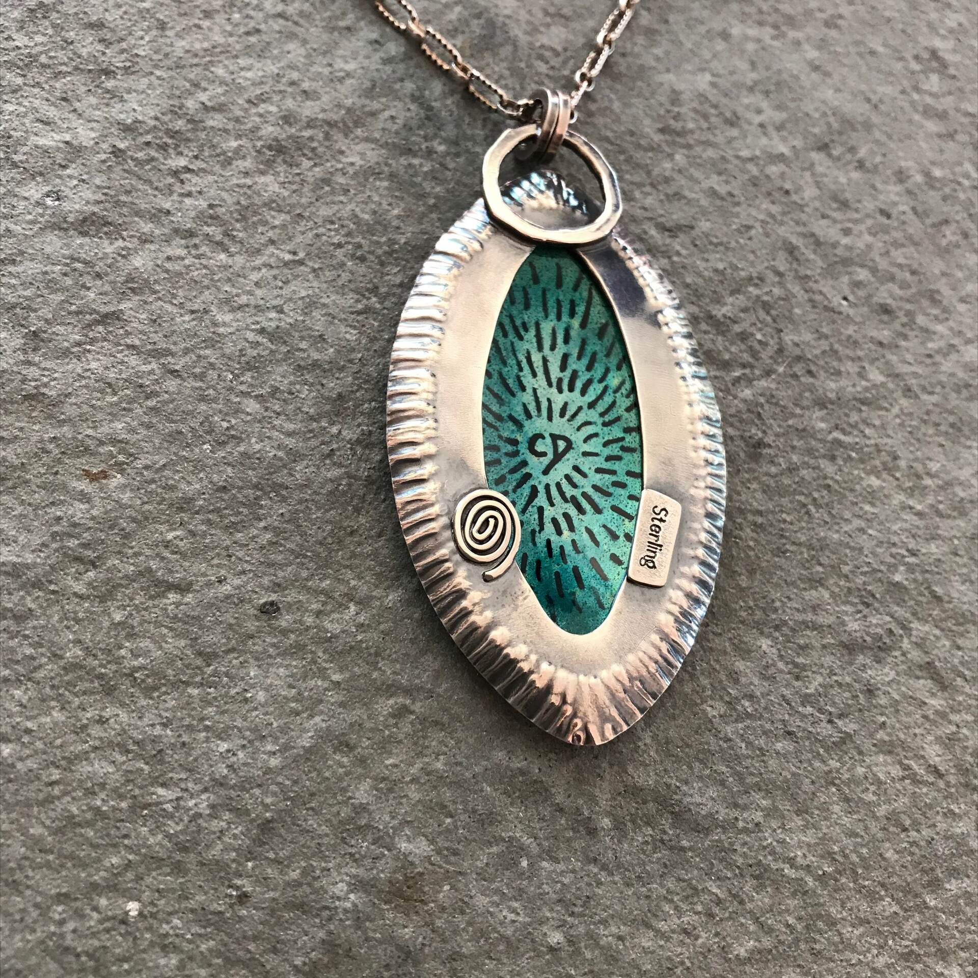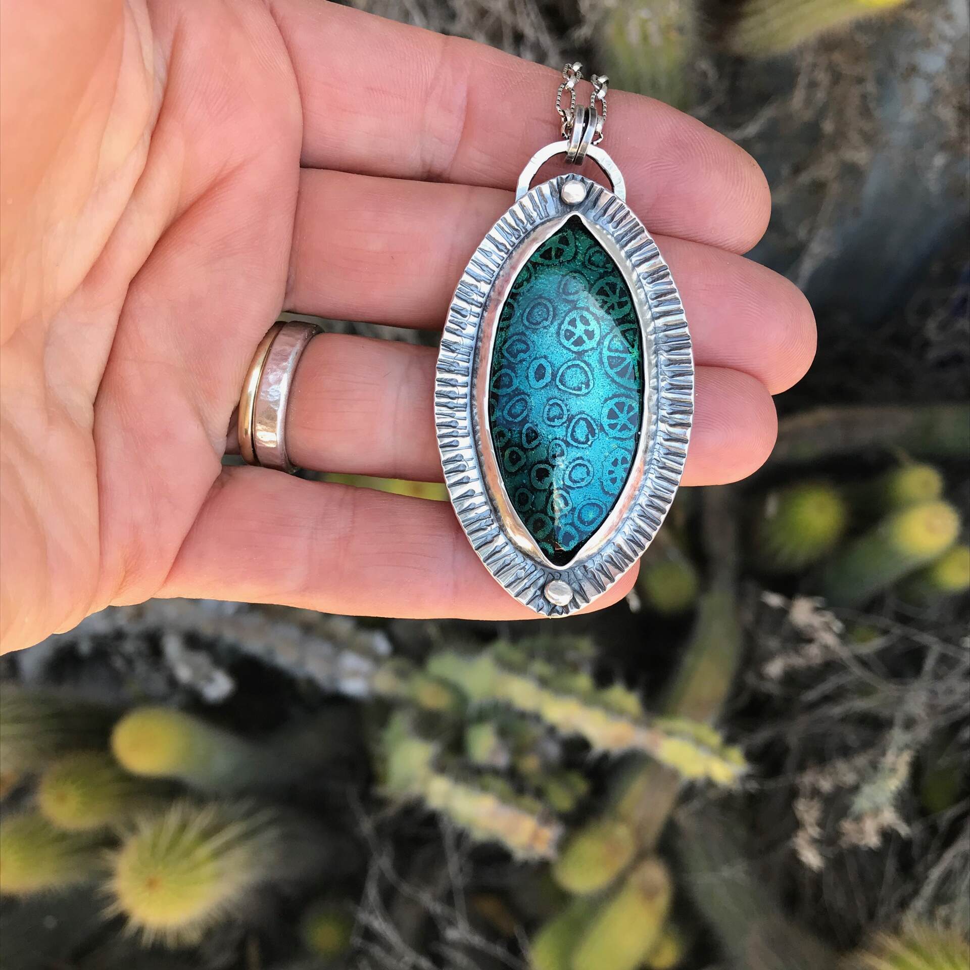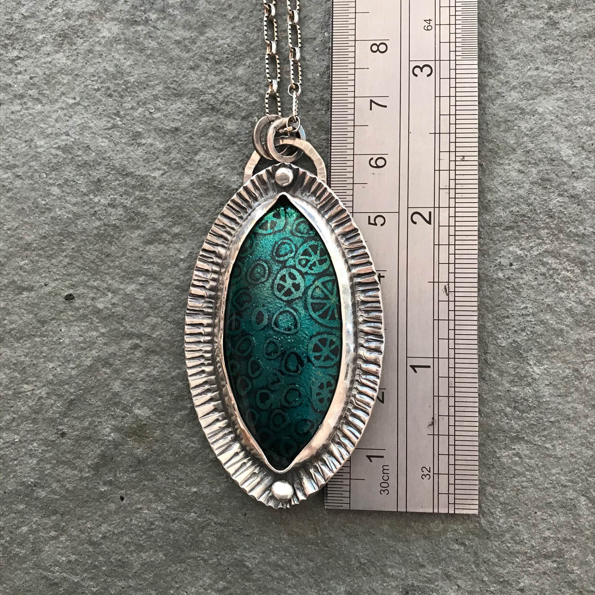 Coral Blue Pendant; Transparent Vitreous enamel on etched copper, Sterling silver hand fabricated setting. Sterling silver chain to your requirements. Please comment lenght of chain with your purchase.