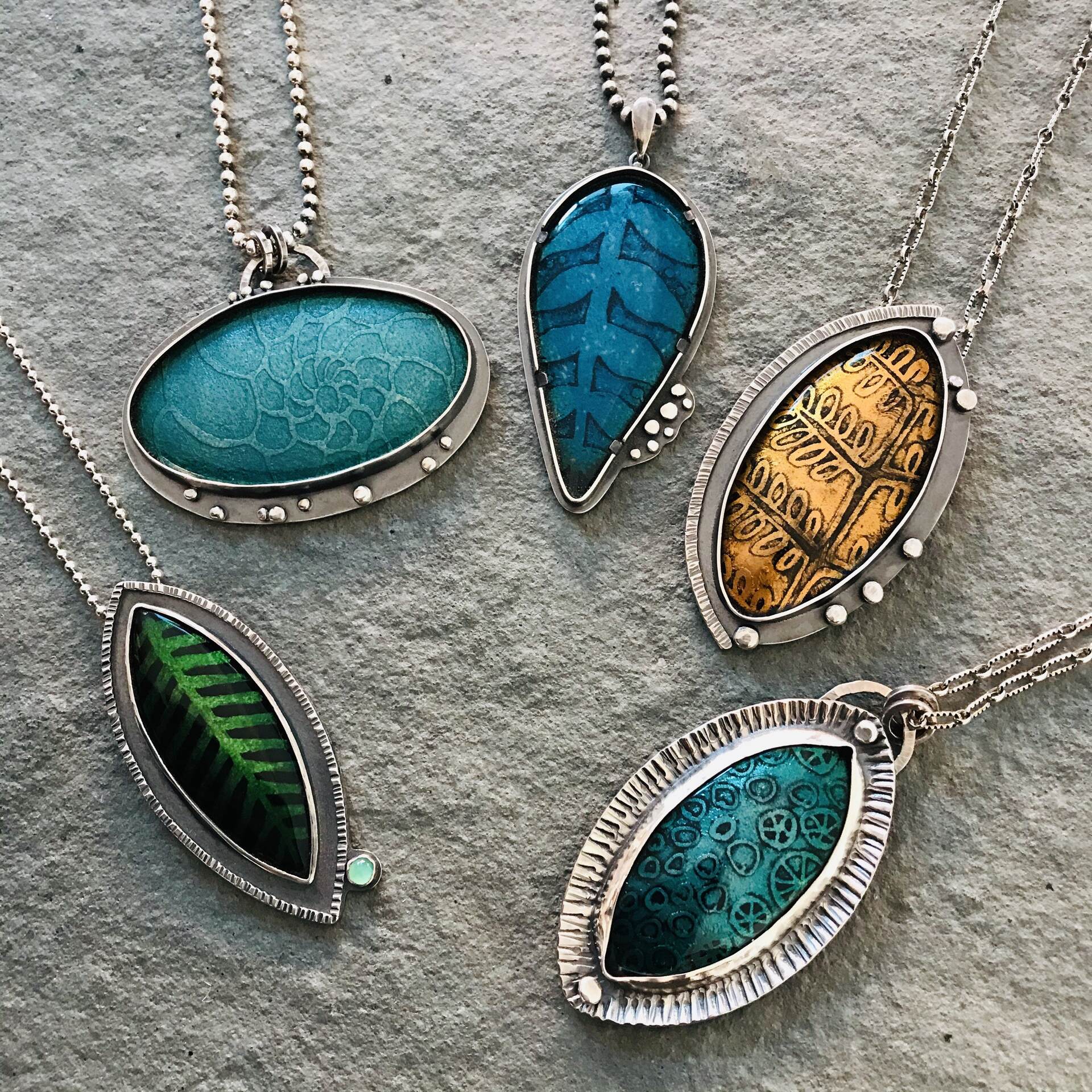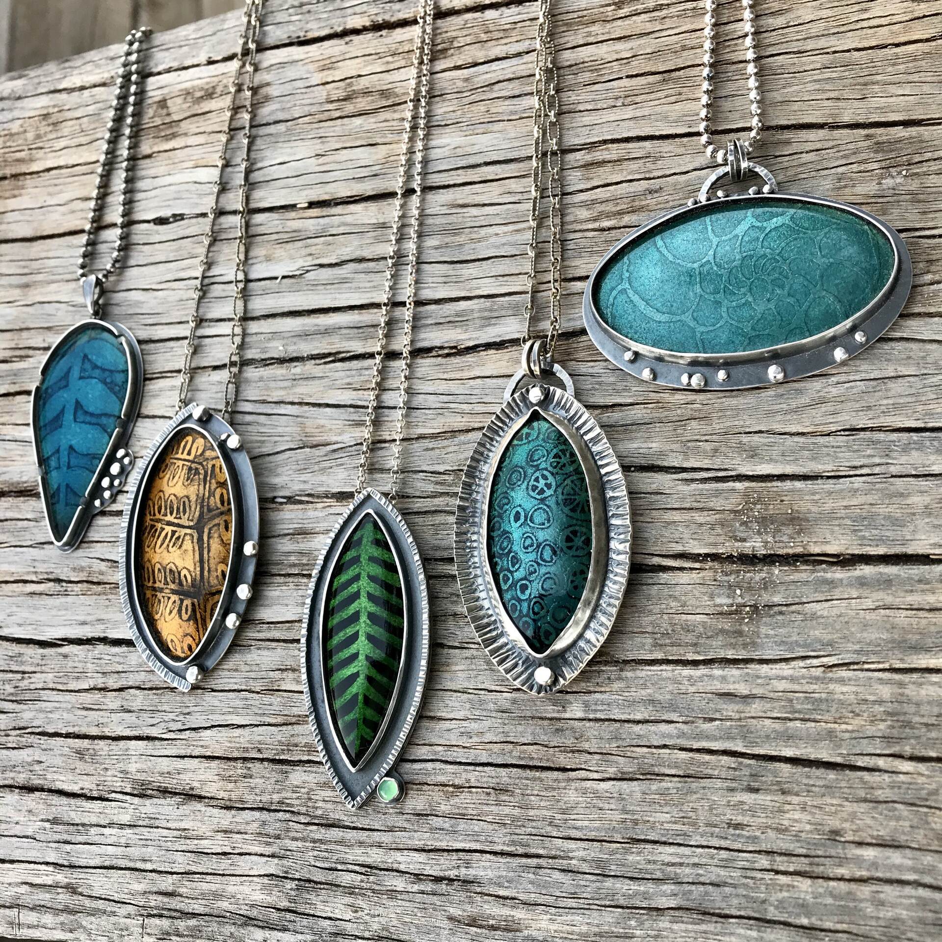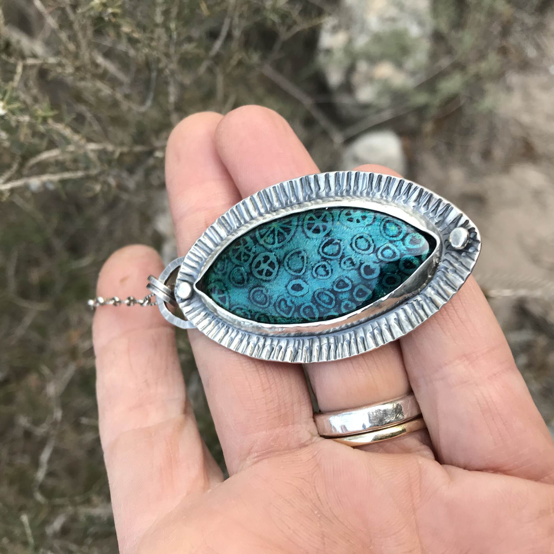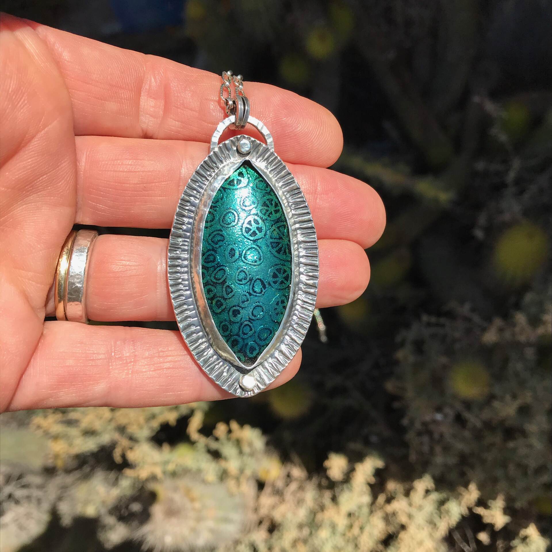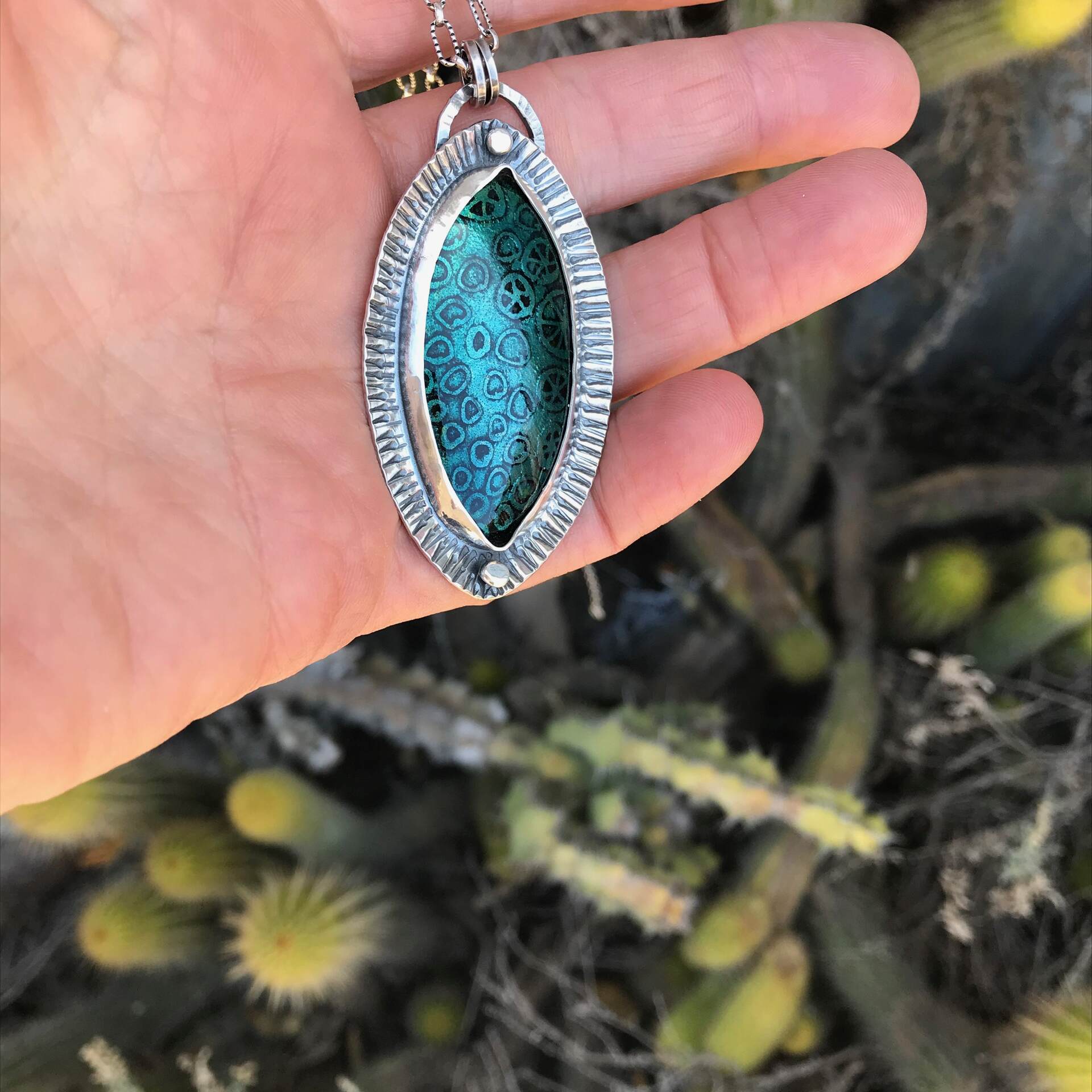 Coral Blue Pendant; Transparent Vitreous enamel on etched copper, Sterling silver hand fabricated setting. Sterling silver chain to your requirements. Please comment lenght of chain with your purchase.