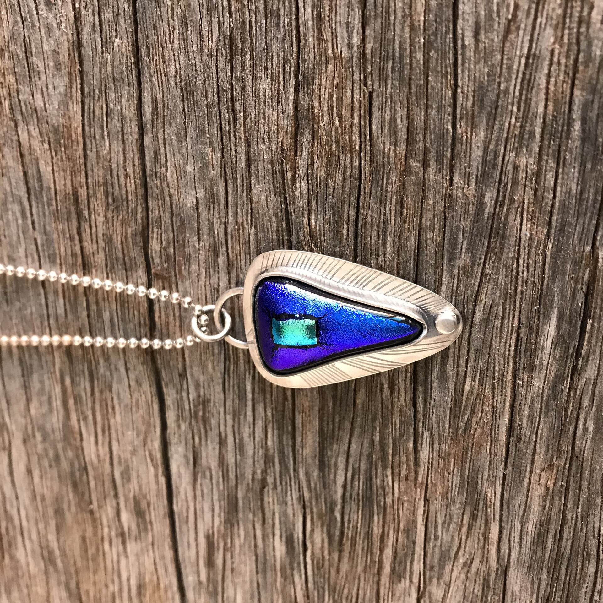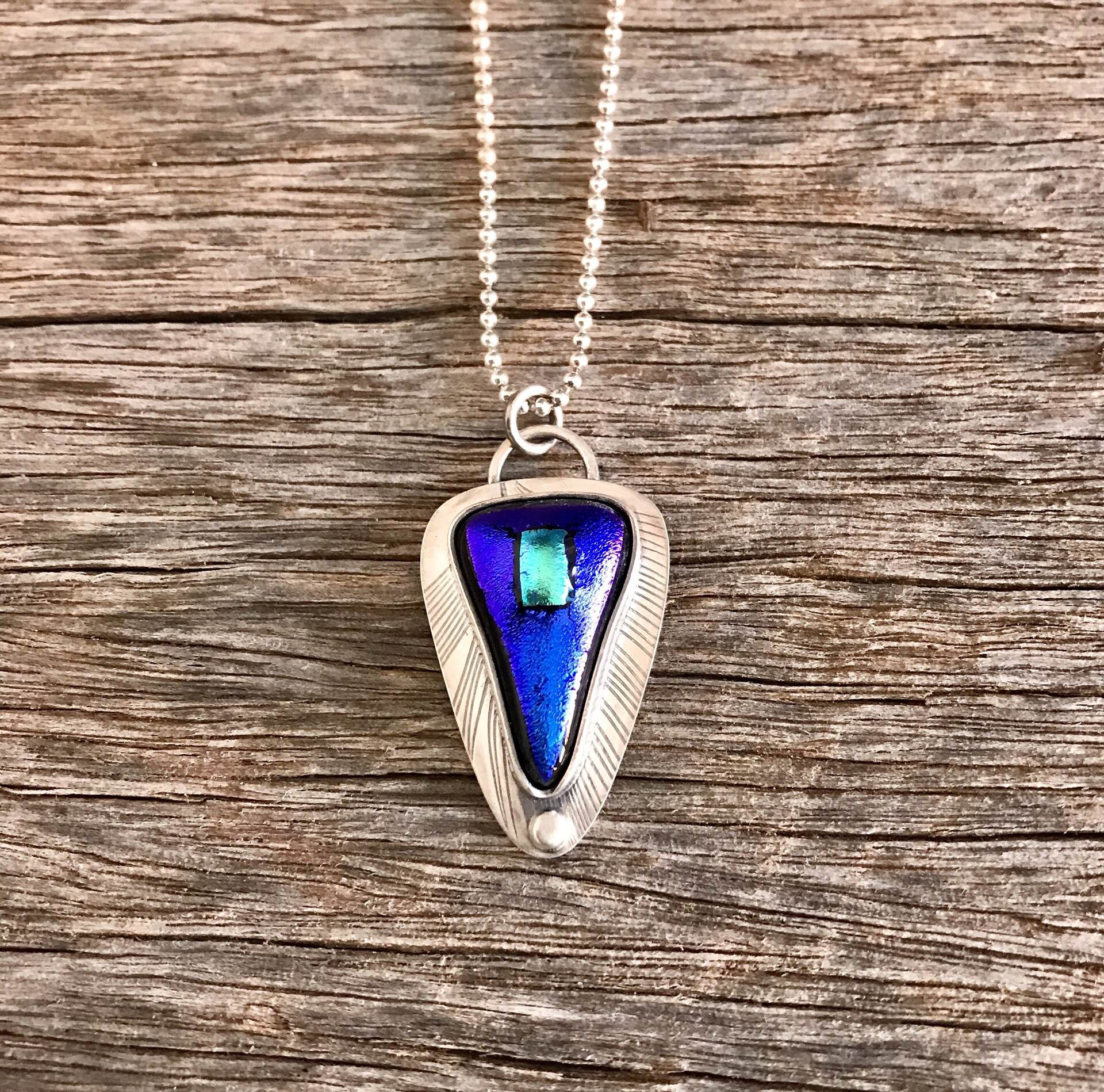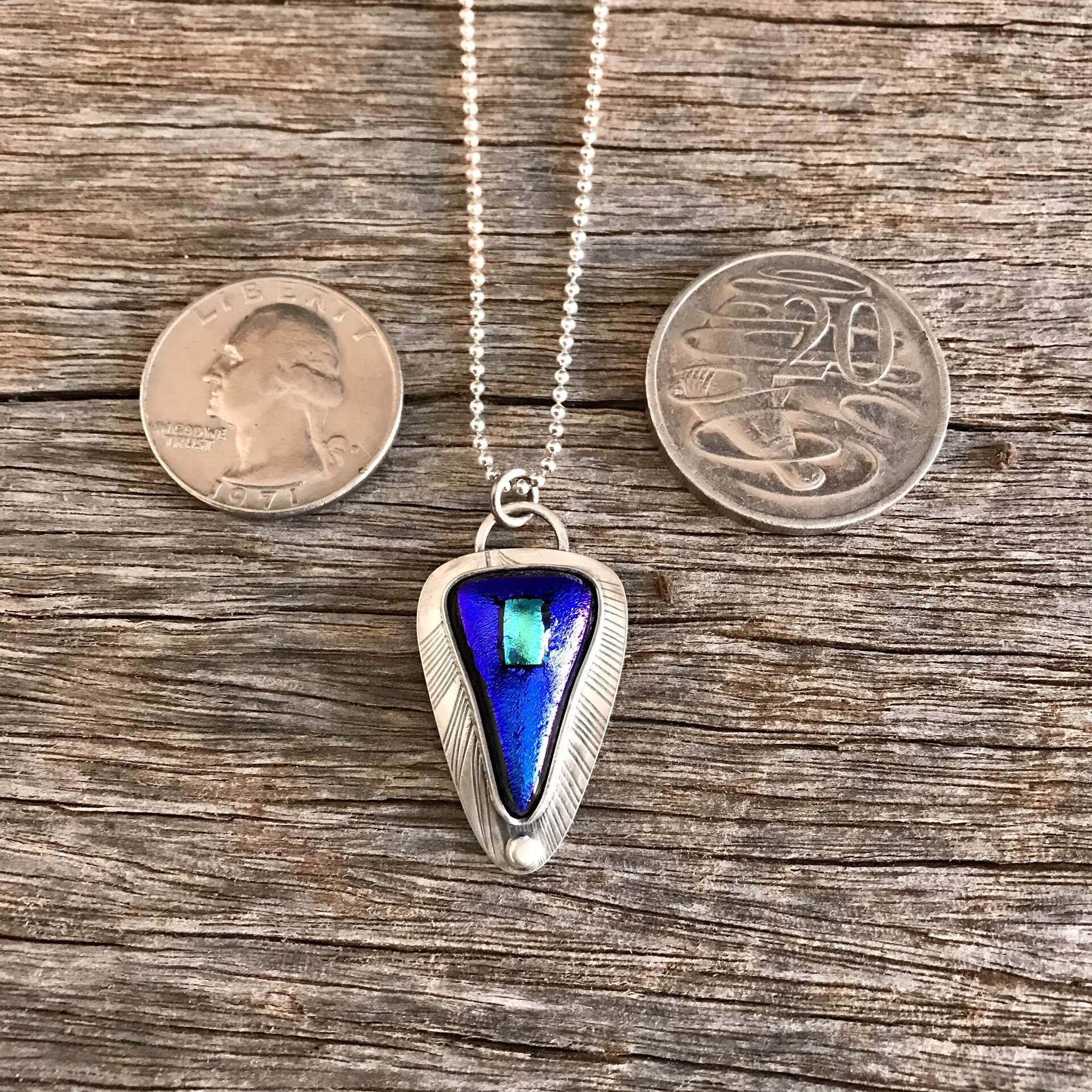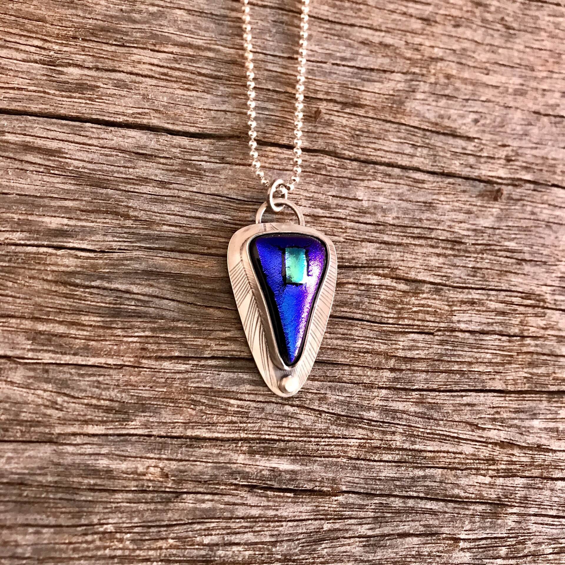 Dichroic glass layered and fused at high temperatures in my kiln. Set in hand fabricated Sterling Silver setting. Includes Sterling Silver chain to your requirements. Please mention your preferred chain length with your purchase. Measurement includes a soldered jump ring at the top for the chain.