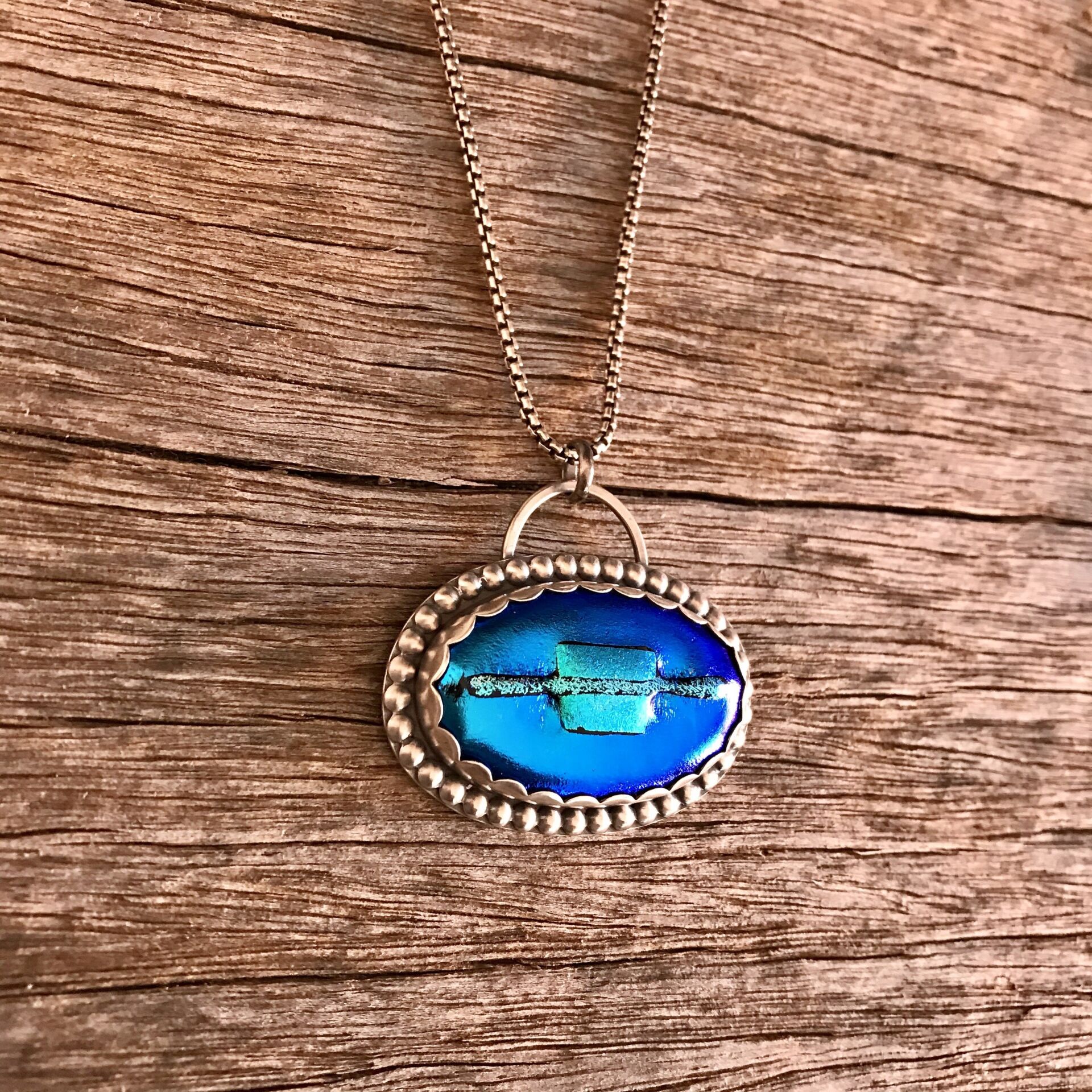 Dichroic glass layered and fused at high temperatures in my kiln. Set in hand fabricated Sterling Silver setting. Includes Sterling Silver chain to your requirements. Please mention your preferred chain length with your purchase. Measurement includes a soldered jump ring at the top for the chain.