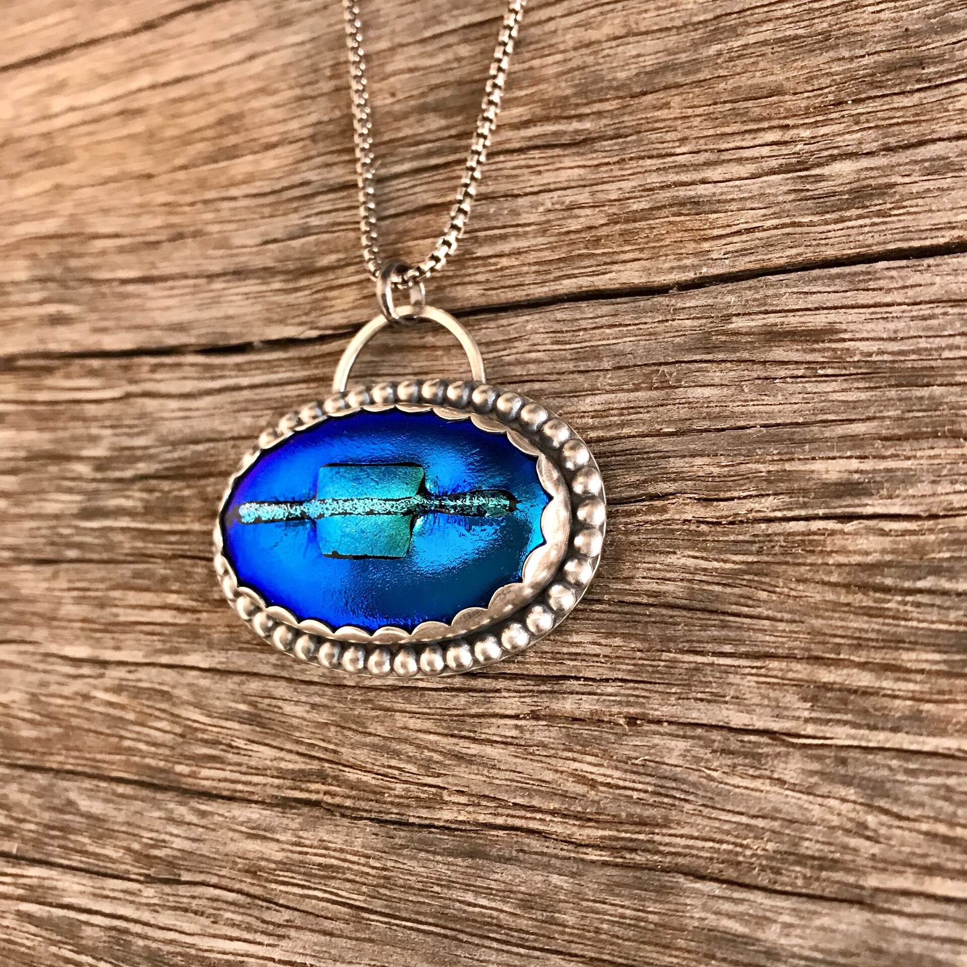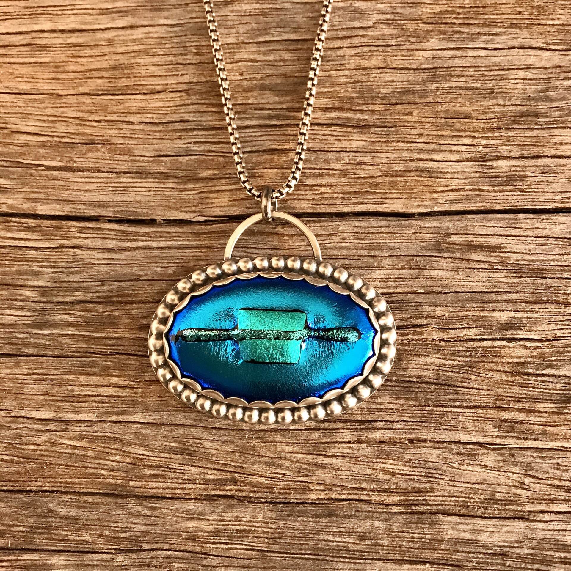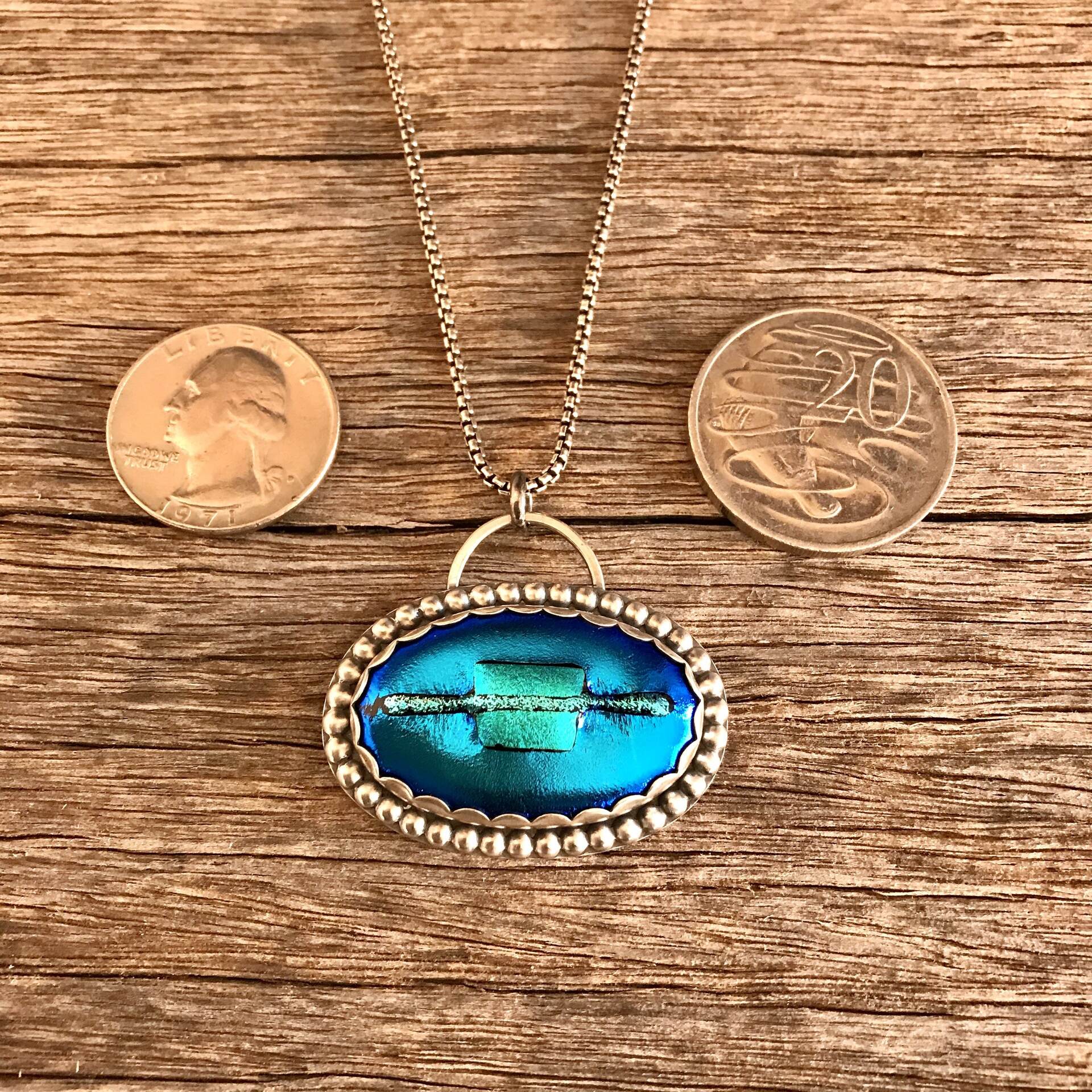 Dichroic glass layered and fused at high temperatures in my kiln. Set in hand fabricated Sterling Silver setting. Includes Sterling Silver chain to your requirements. Please mention your preferred chain length with your purchase. Measurement includes a soldered jump ring at the top for the chain.