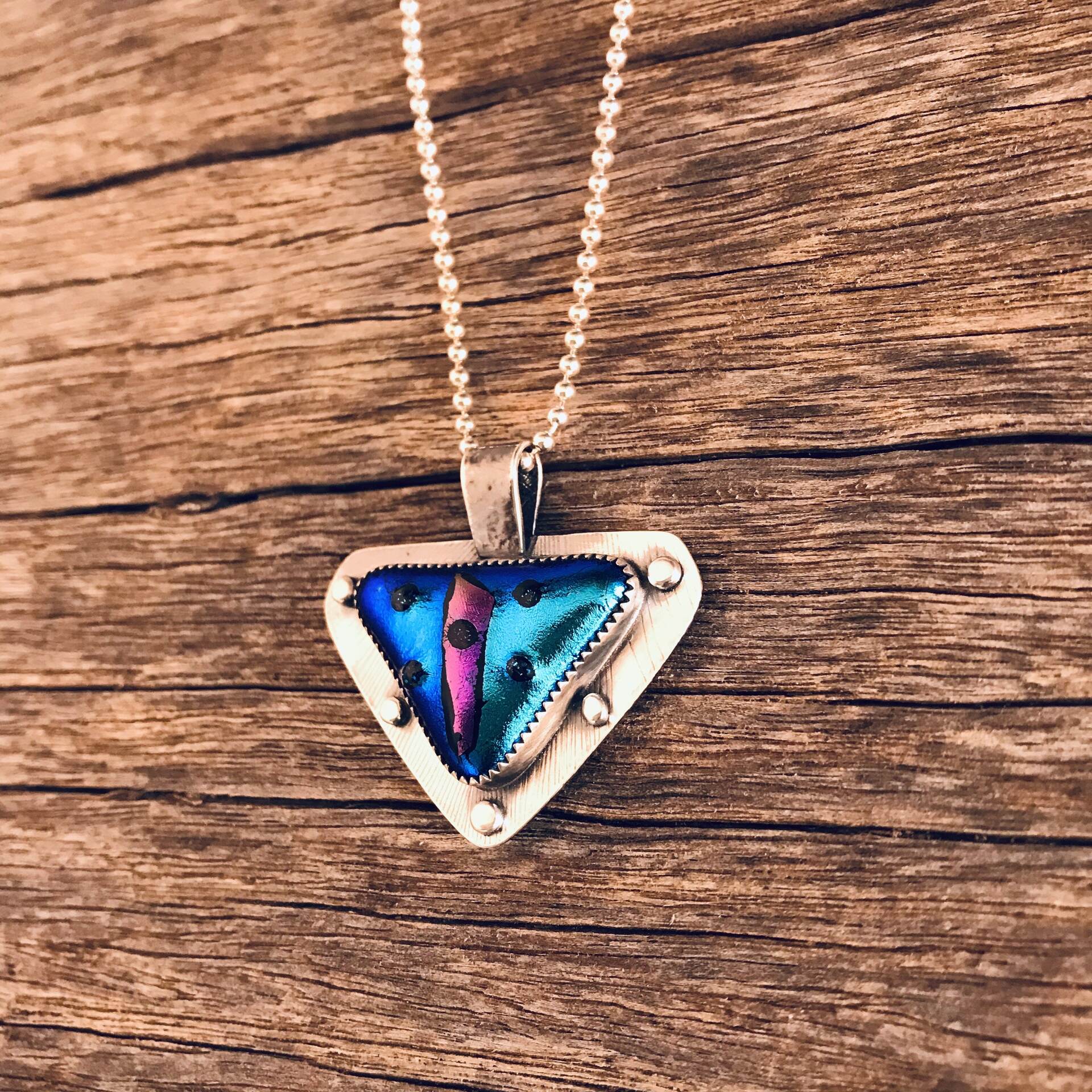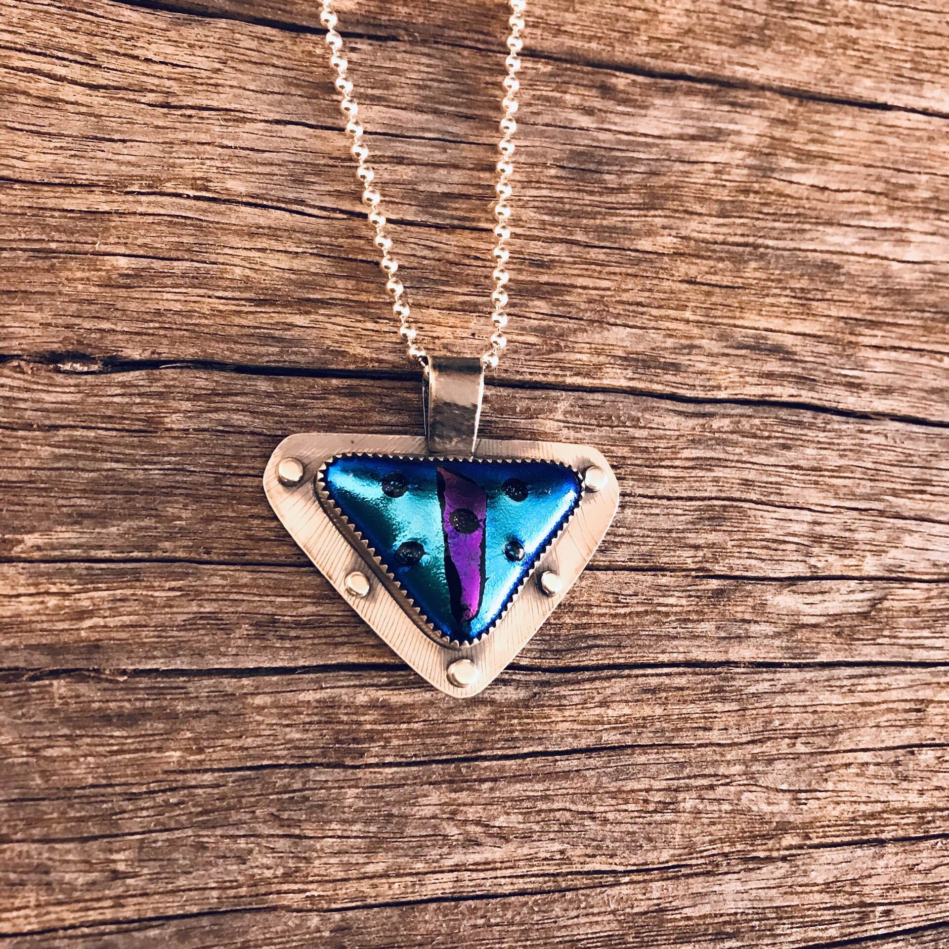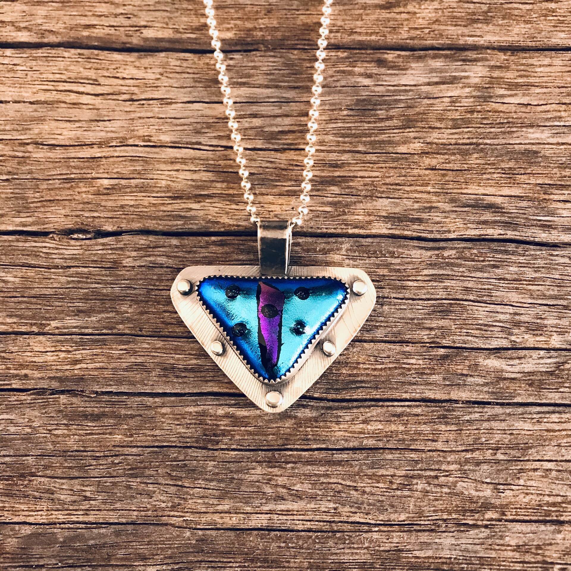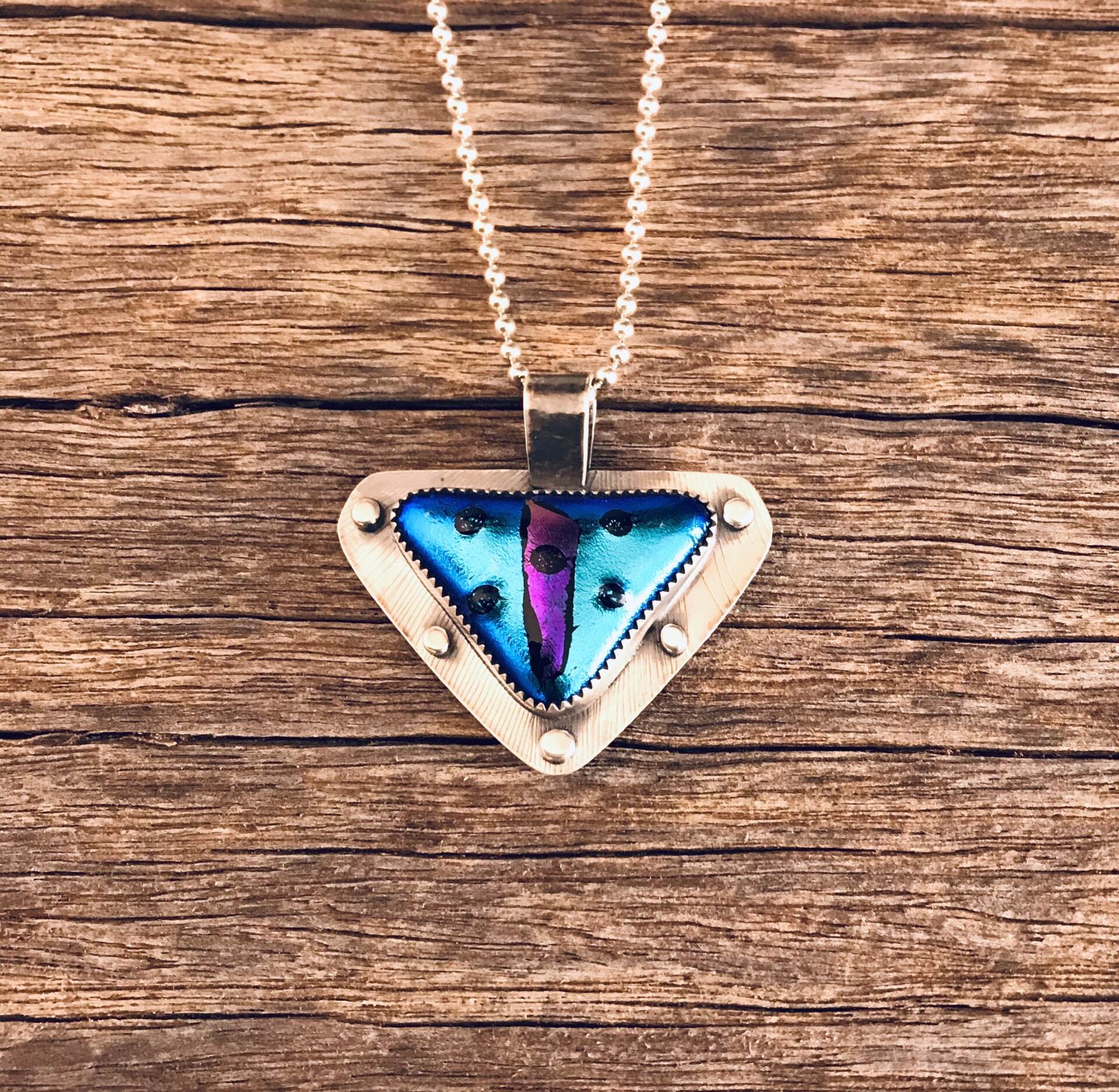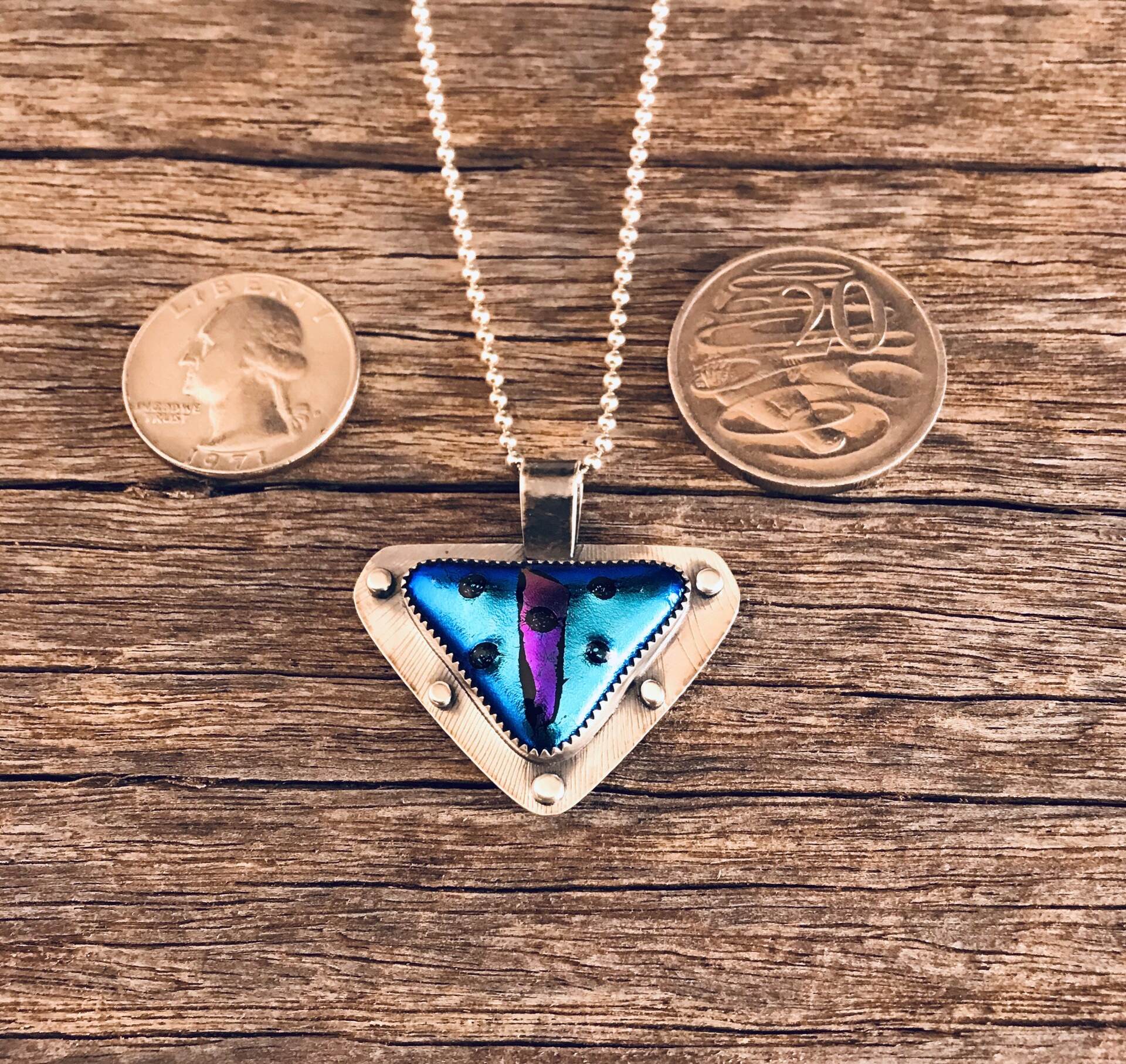 Dichroic glass layered and fused at high temperatures in my kiln. Set in hand fabricated Sterling Silver setting. Includes Sterling Silver chain to your requirements. Please mention your preferred chain length with your purchase. Measurement includes the bail at the top of the pendant for the chain.