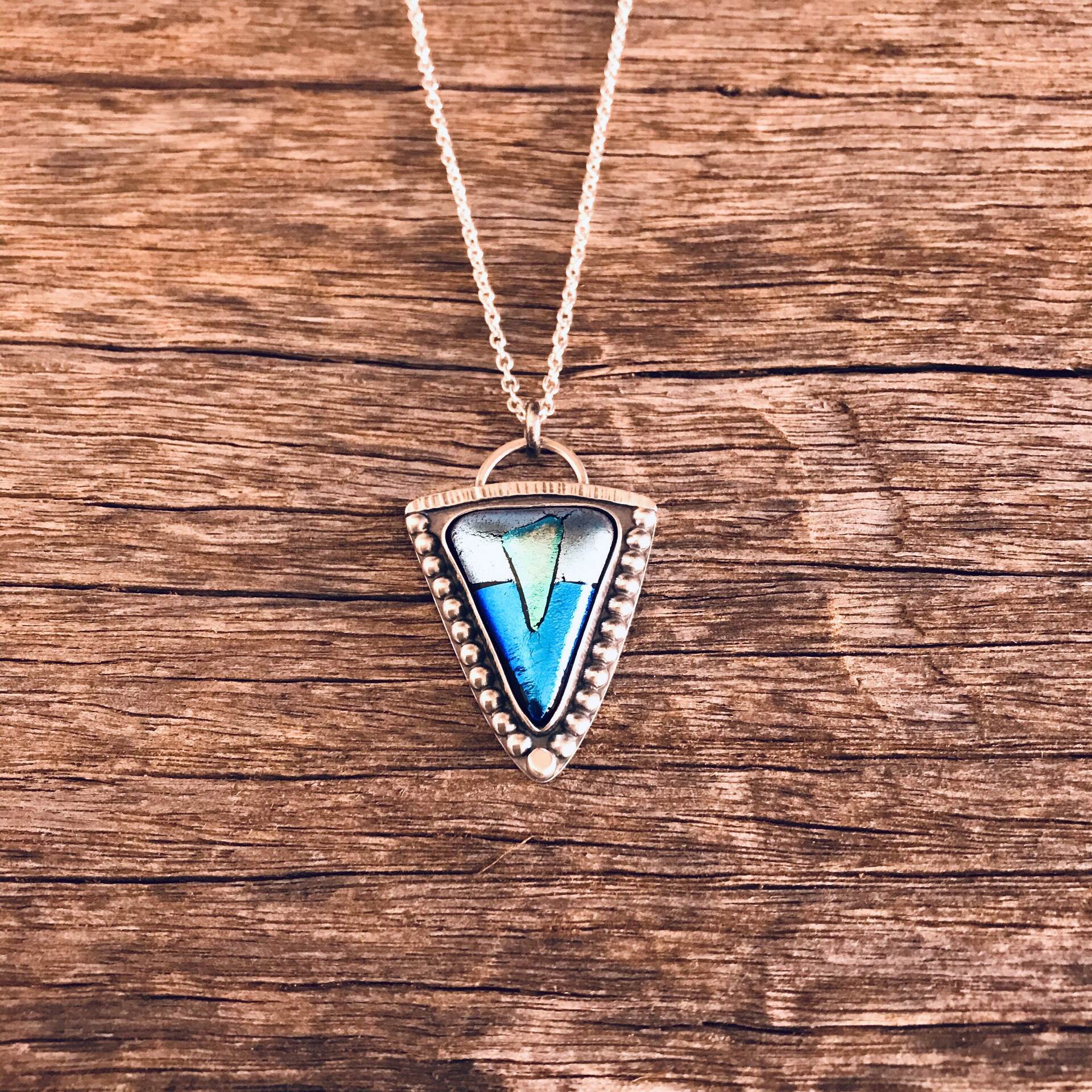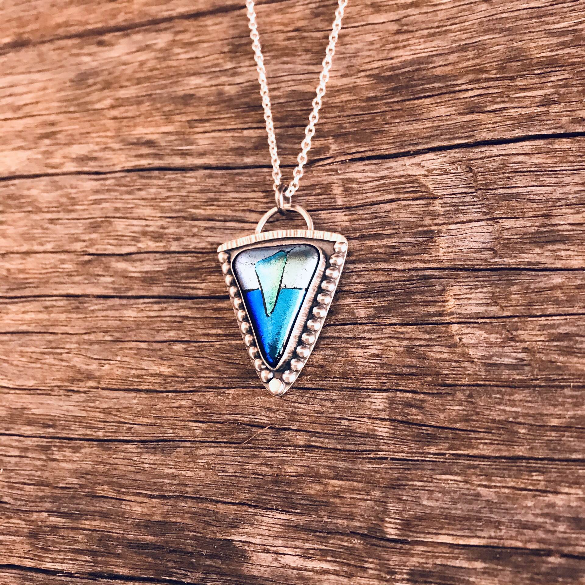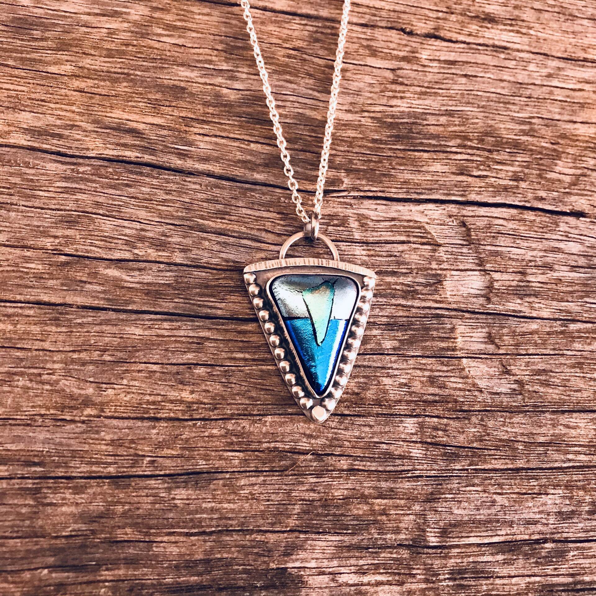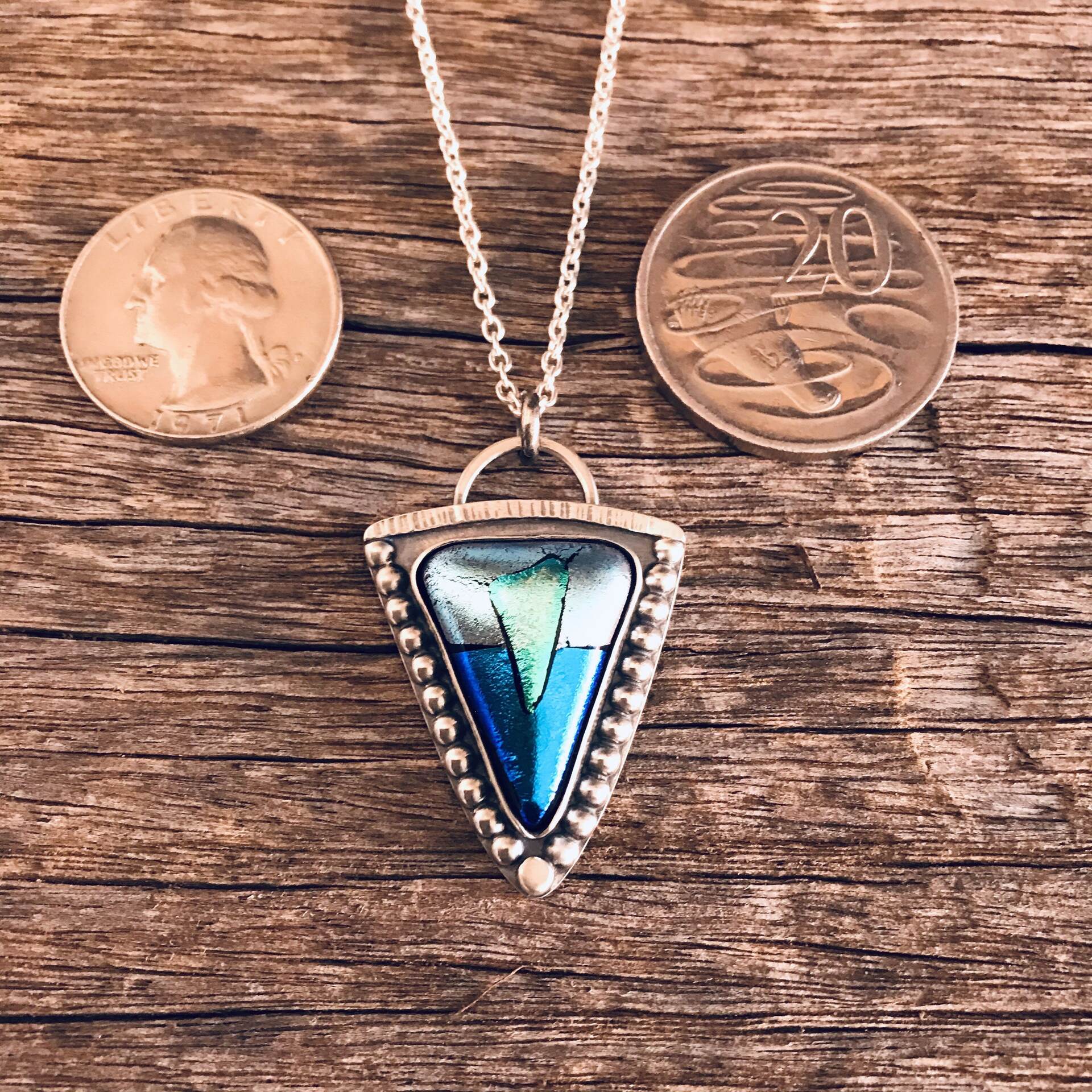 Dichroic glass layered and fused at high temperatures in my kiln. Set in hand fabricated Sterling Silver setting. Includes Sterling Silver chain to your requirements. Please mention your preferred chain length with your purchase. Measurement includes a soldered jump ring at the top for the chain.