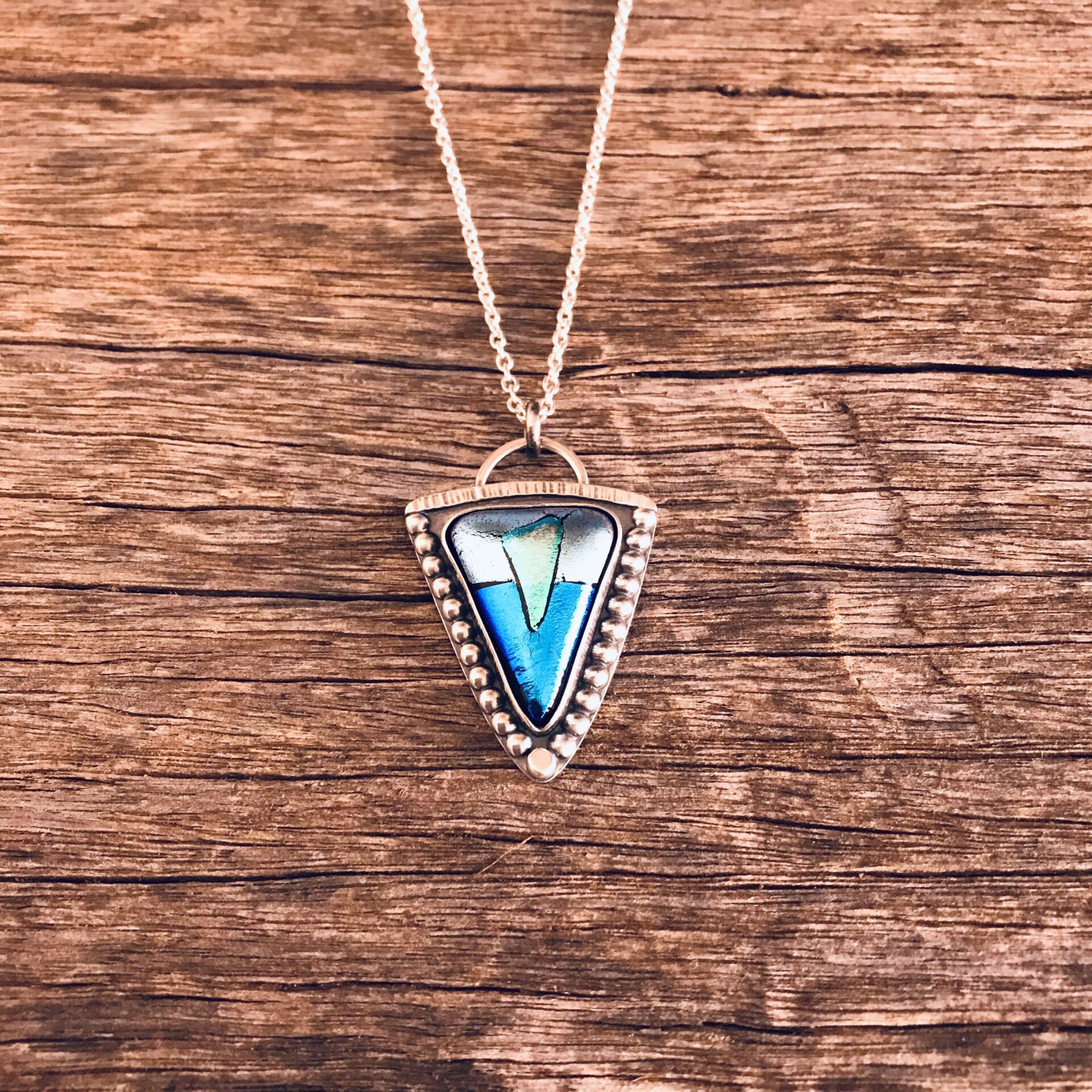 Dichroic glass layered and fused at high temperatures in my kiln. Set in hand fabricated Sterling Silver setting. Includes Sterling Silver chain to your requirements. Please mention your preferred chain length with your purchase. Measurement includes a soldered jump ring at the top for the chain.
