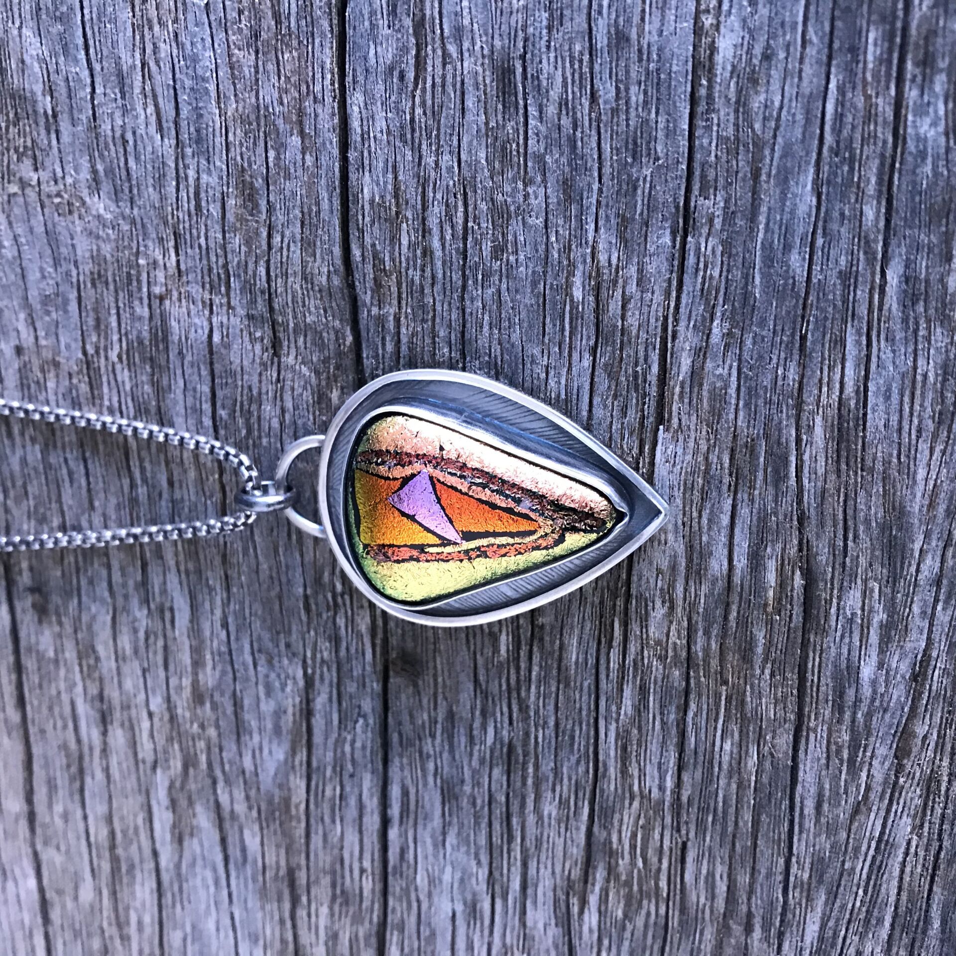 Dichroic glass layered and fused at high temperatures in my kiln. Set in hand fabricated Sterling Silver setting. Includes Sterling Silver chain to your requirements. Please mention your preferred chain length with your purchase. Measurement includes a soldered jump ring at the top for the chain.