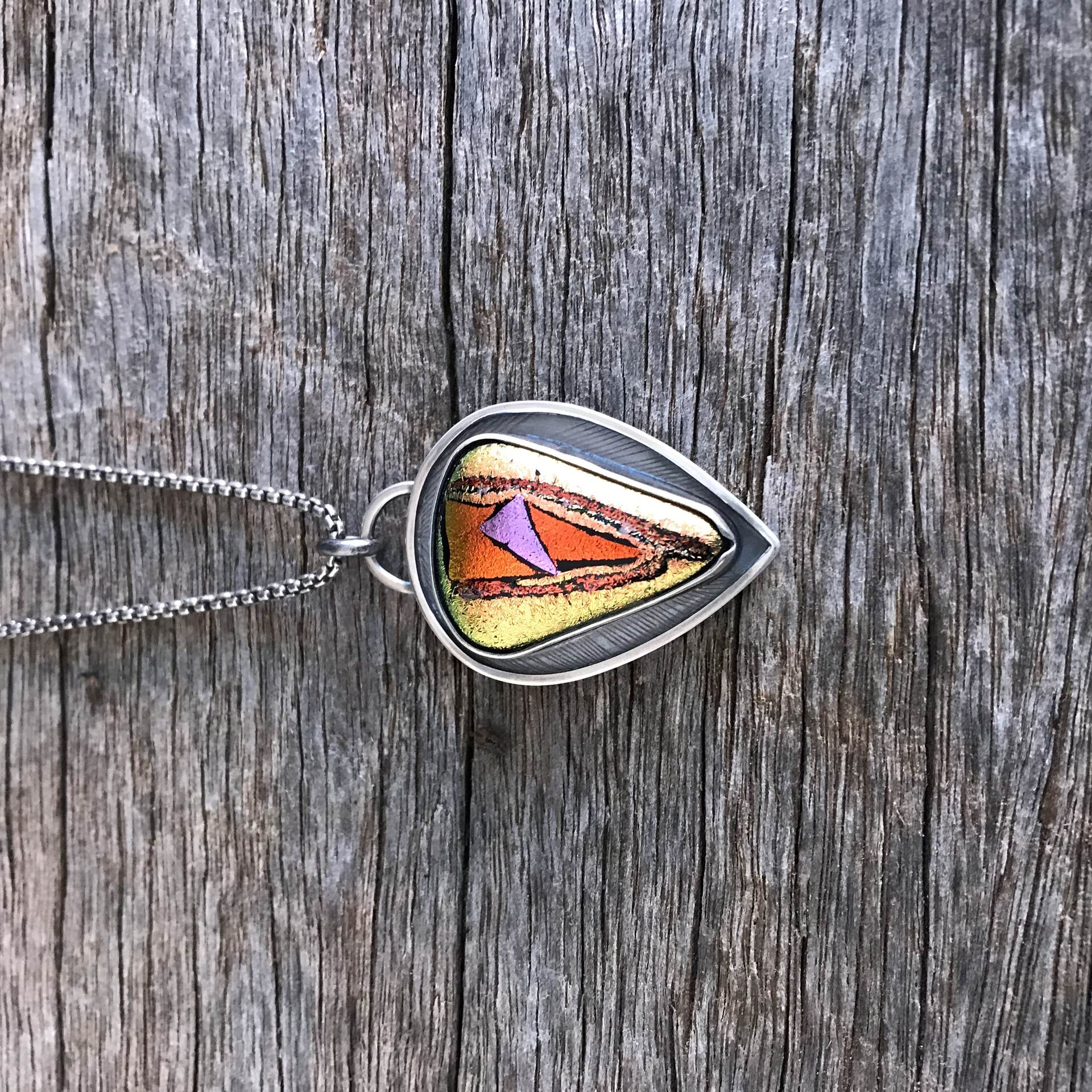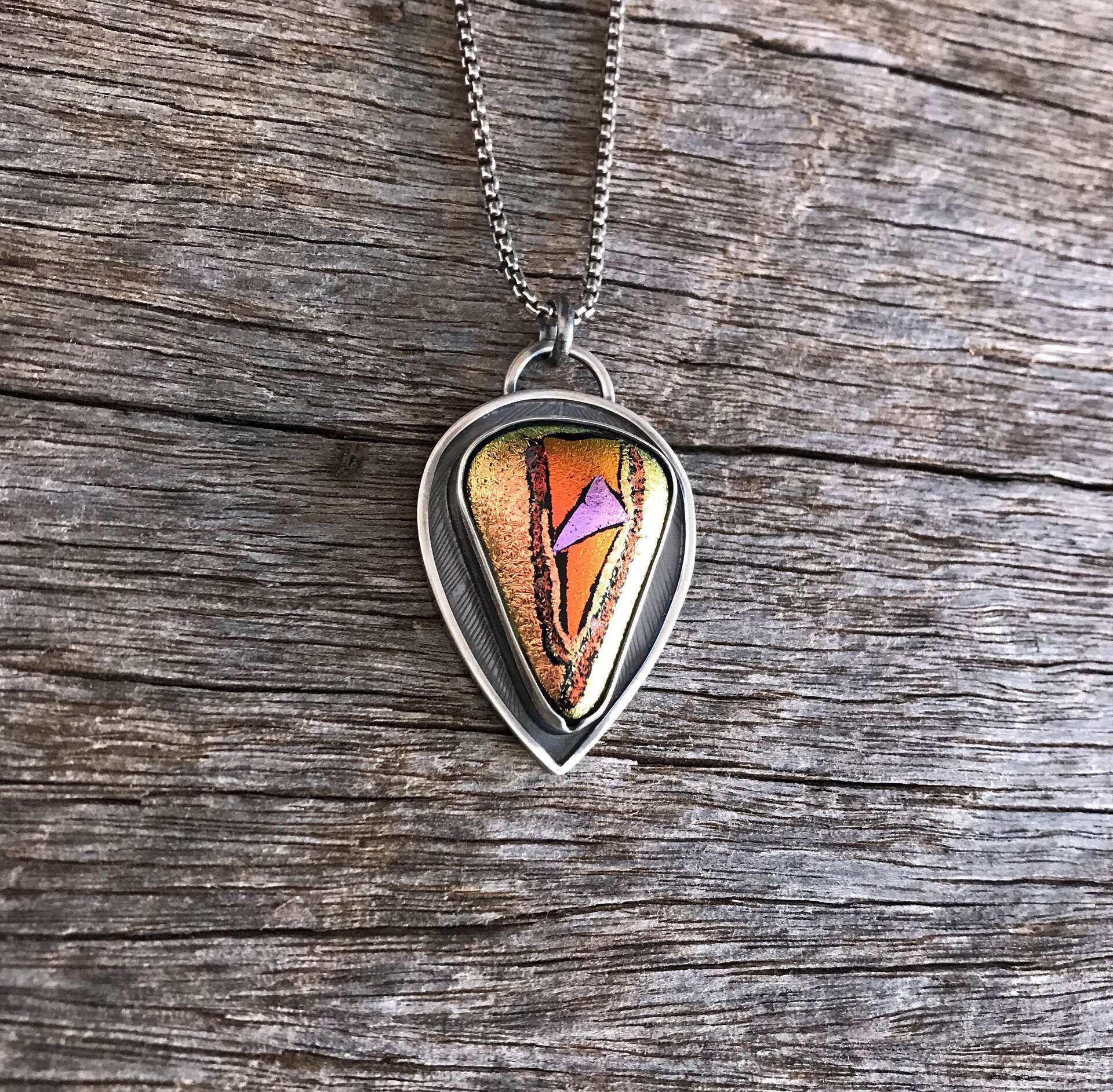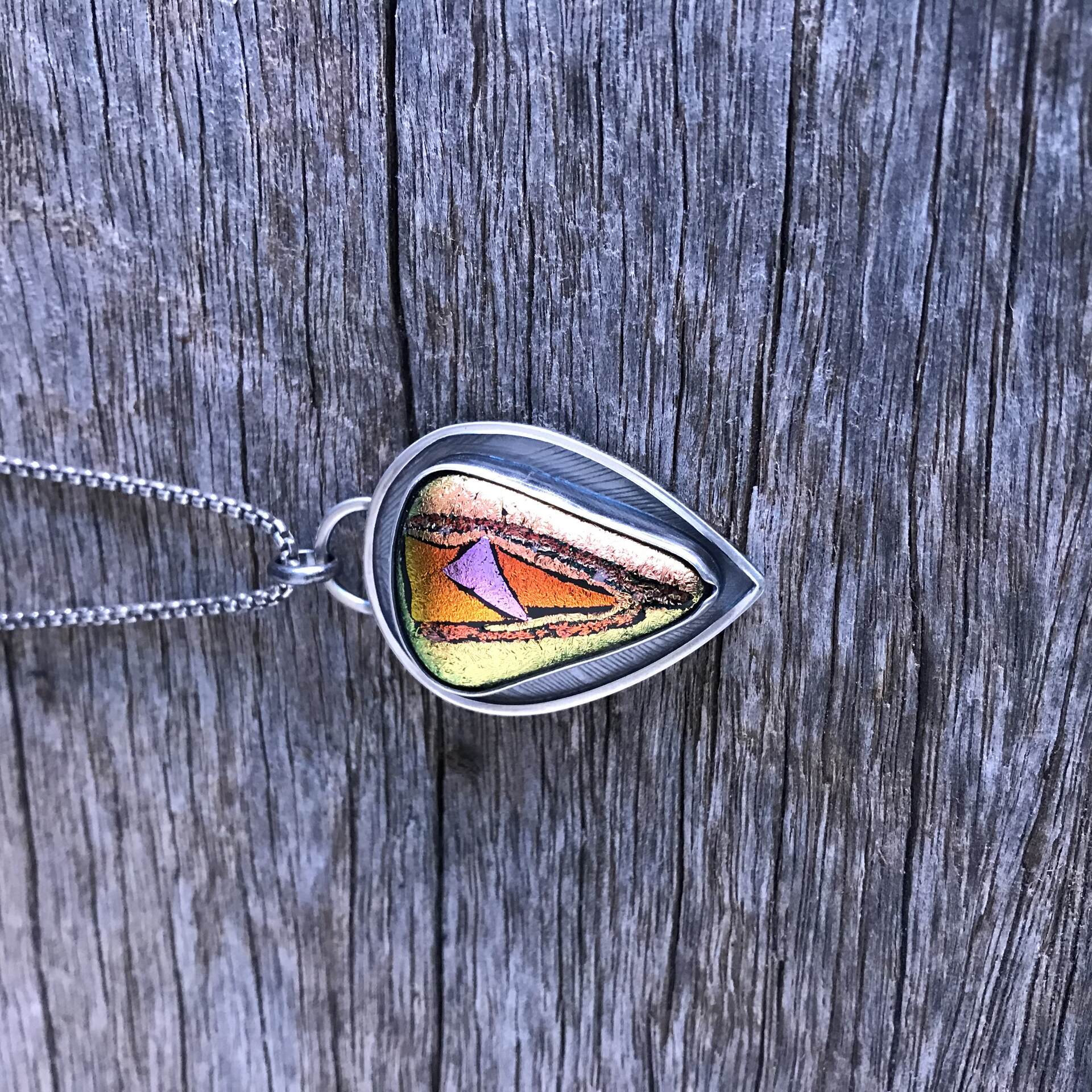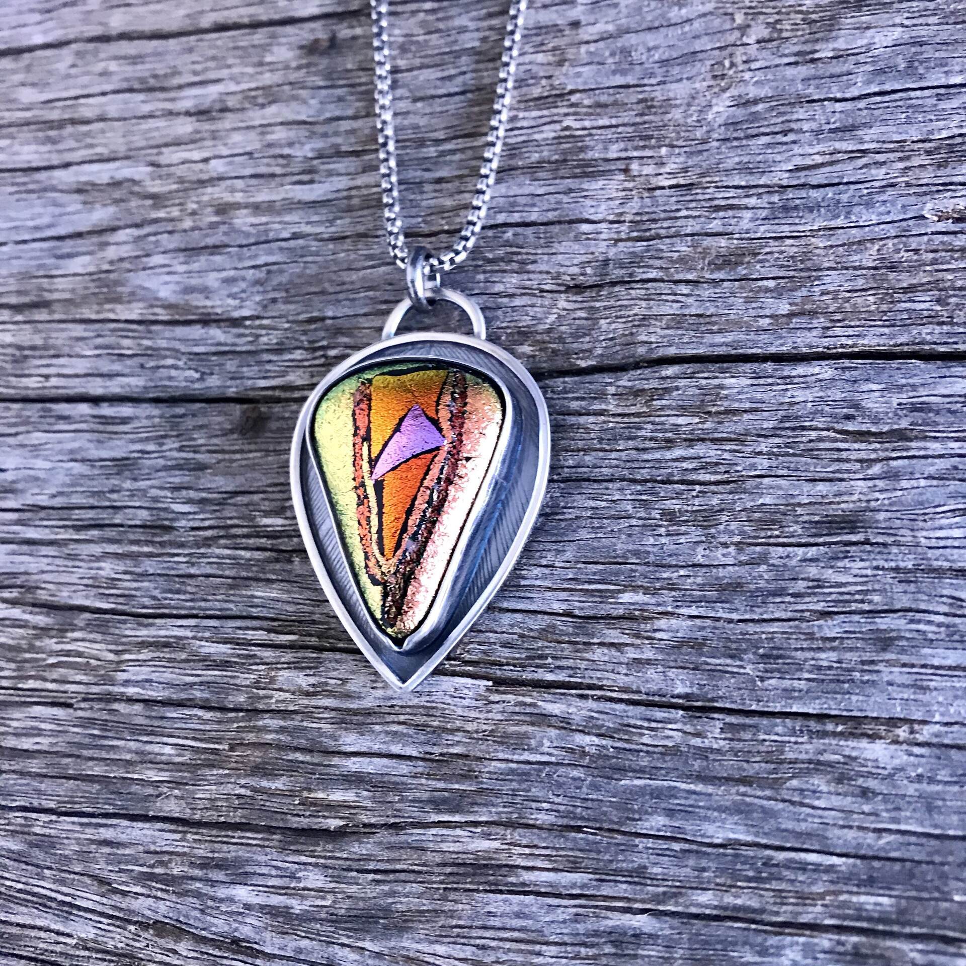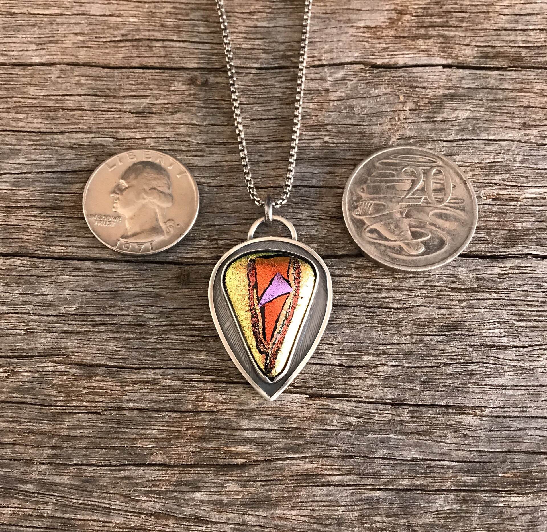 Dichroic glass layered and fused at high temperatures in my kiln. Set in hand fabricated Sterling Silver setting. Includes Sterling Silver chain to your requirements. Please mention your preferred chain length with your purchase. Measurement includes a soldered jump ring at the top for the chain.