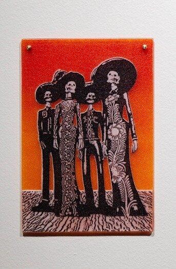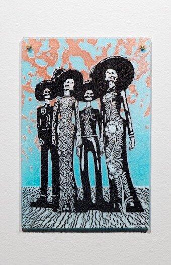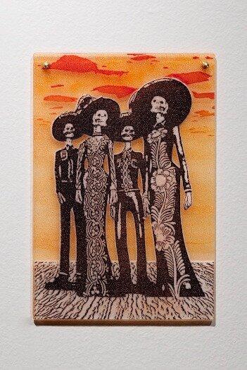 'Fiesta' - Mexico where my Heart is. Dawn Sky. Kiln-formed, textural printed glass. These textural prints look like velvet. This is a single piece of glass which measures 217mm W x 317mm H x 4mm thick. Wall fittings included.