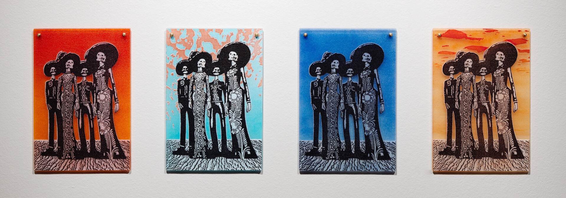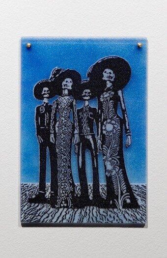 'Fiesta' - Mexico where my Heart is. Night Sky. Kiln-formed, textural printed glass. These textural prints look like velvet. This is a single piece of glass which measures 217mm W x 317mm H x 4mm thick. Wall fittings included.