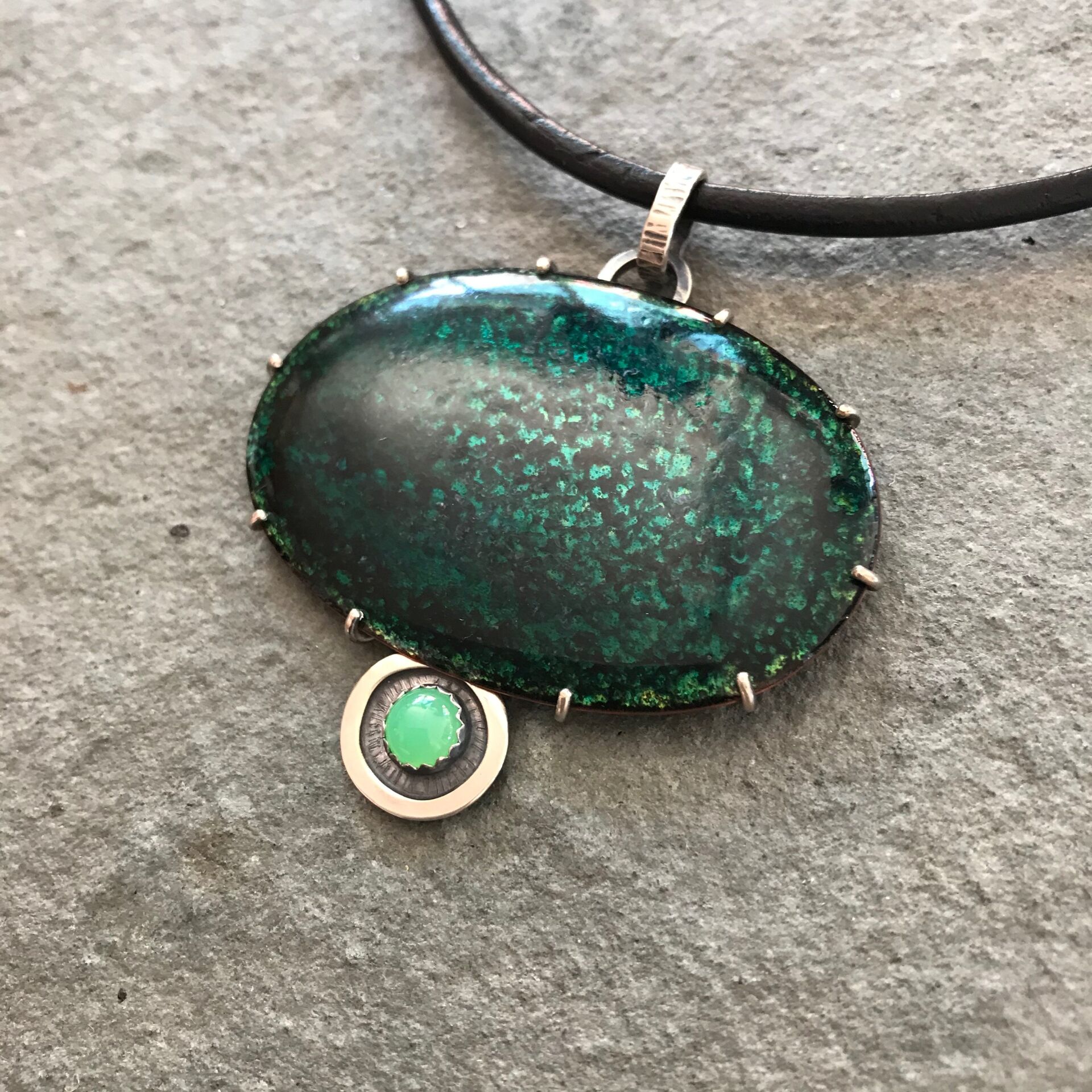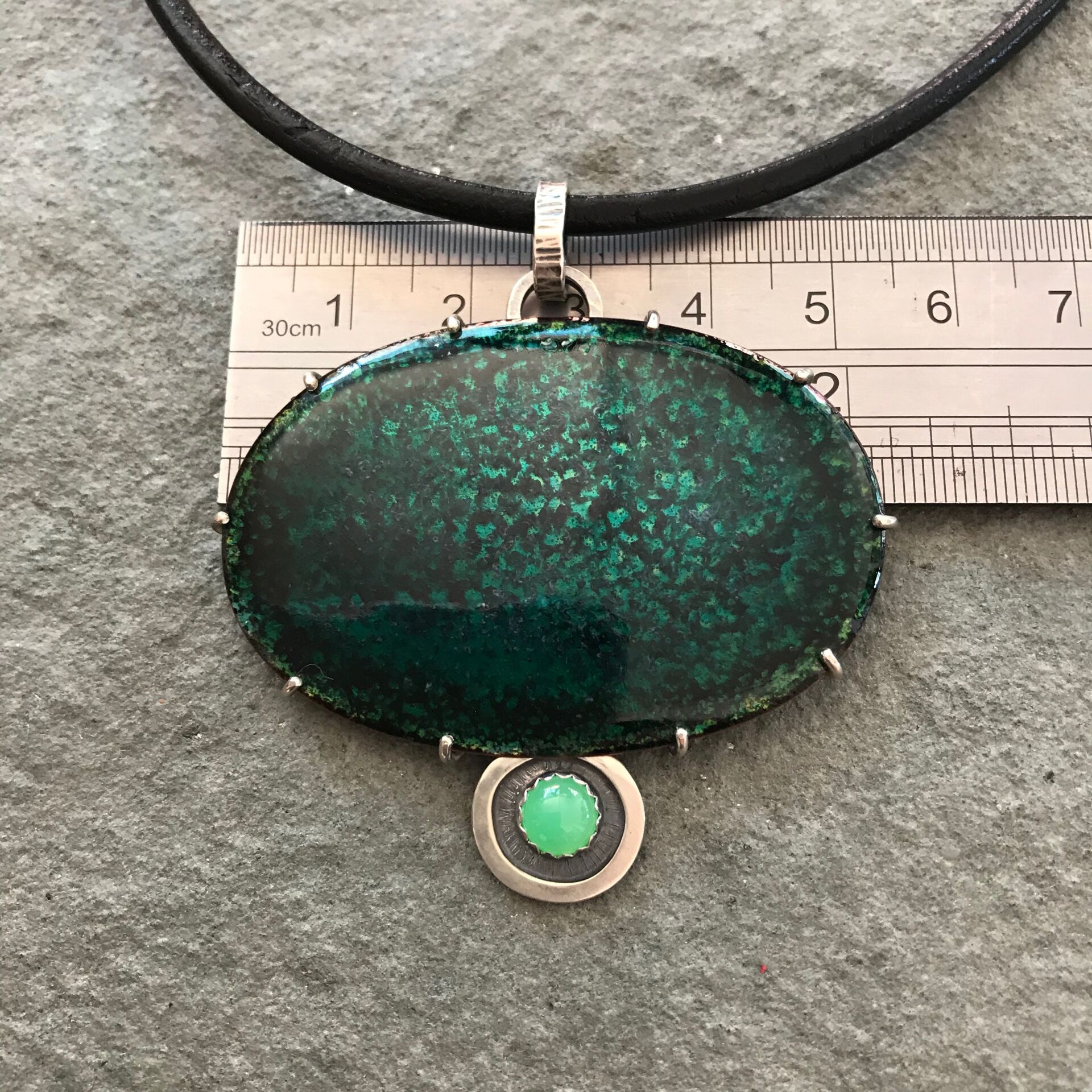 Forest Pond Pendant; Transparent Vitreous enamel on copper, Chrysoprase gemstone, Sterling silver. Leather & sterling neck cable to requirements or sterling silver chain. Measurement includes bail at top of pendant for the chain.