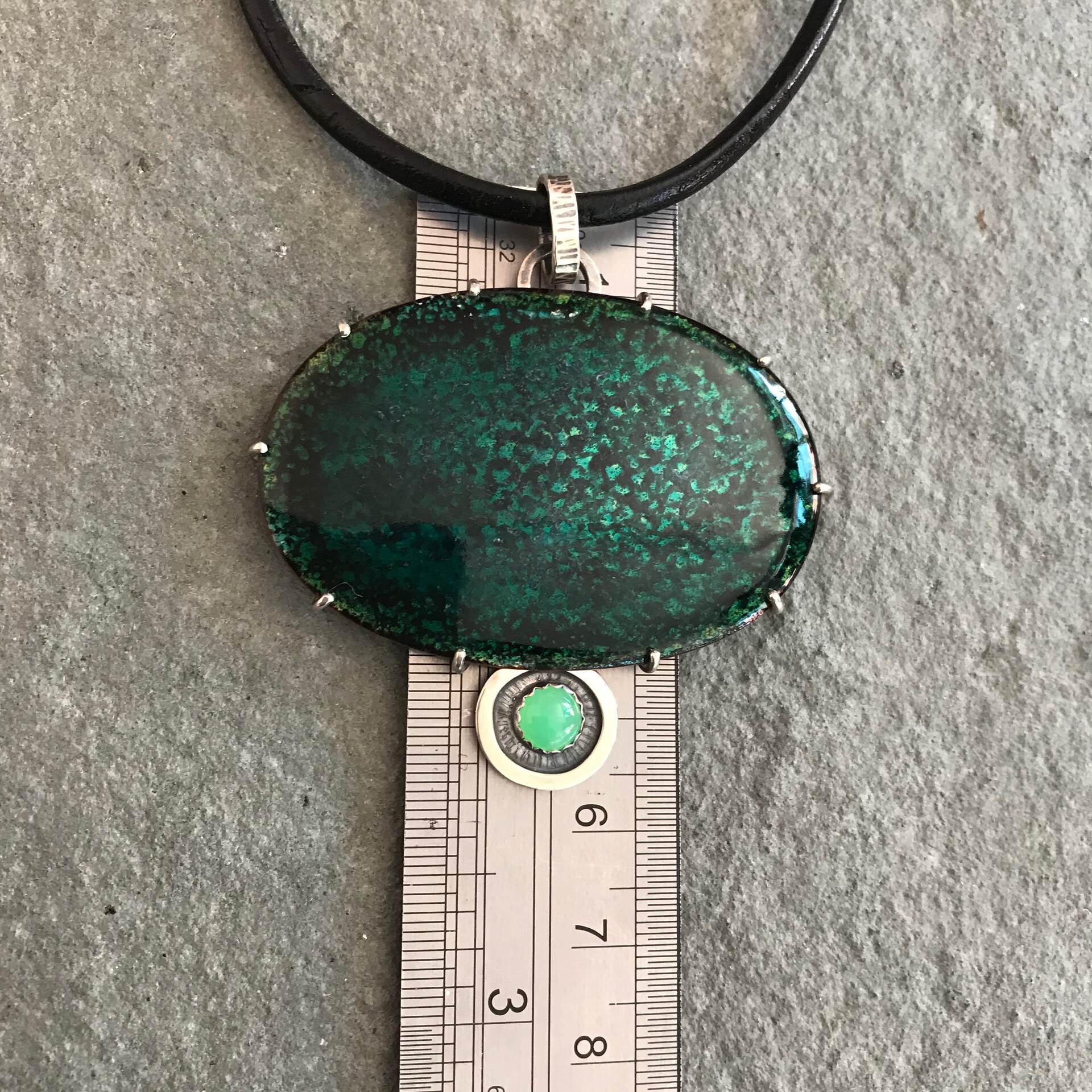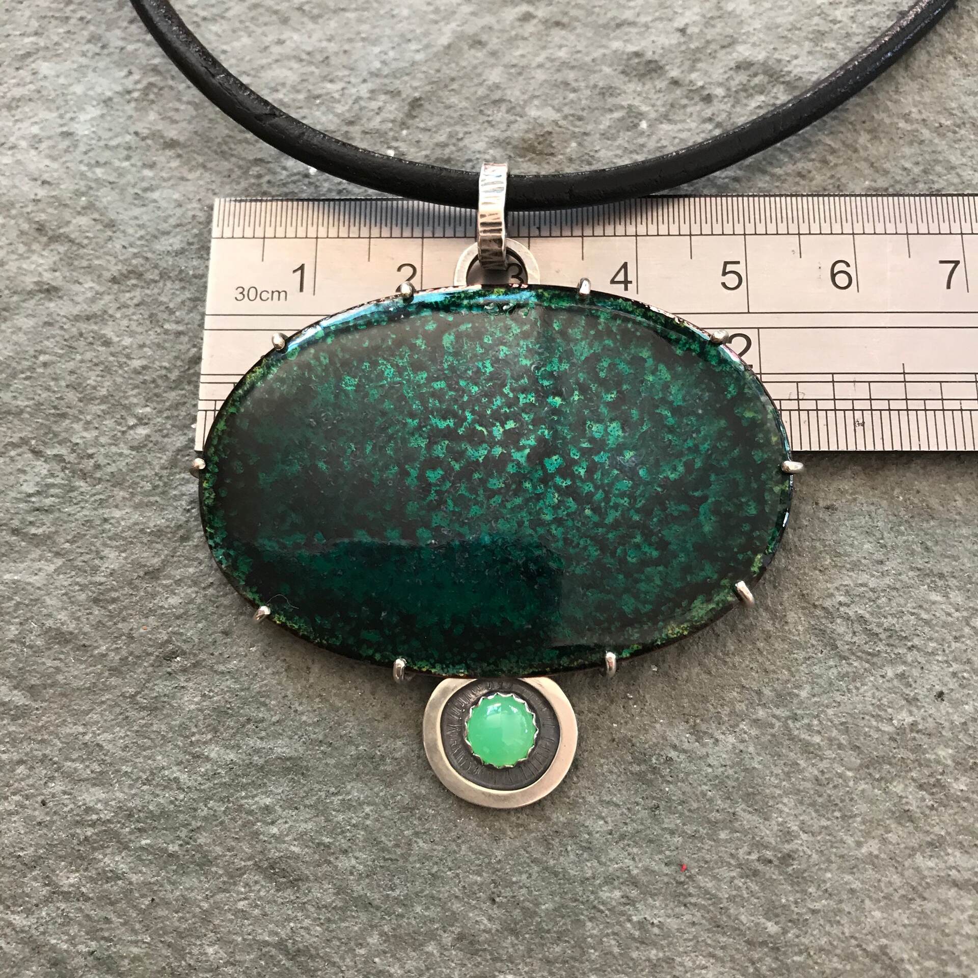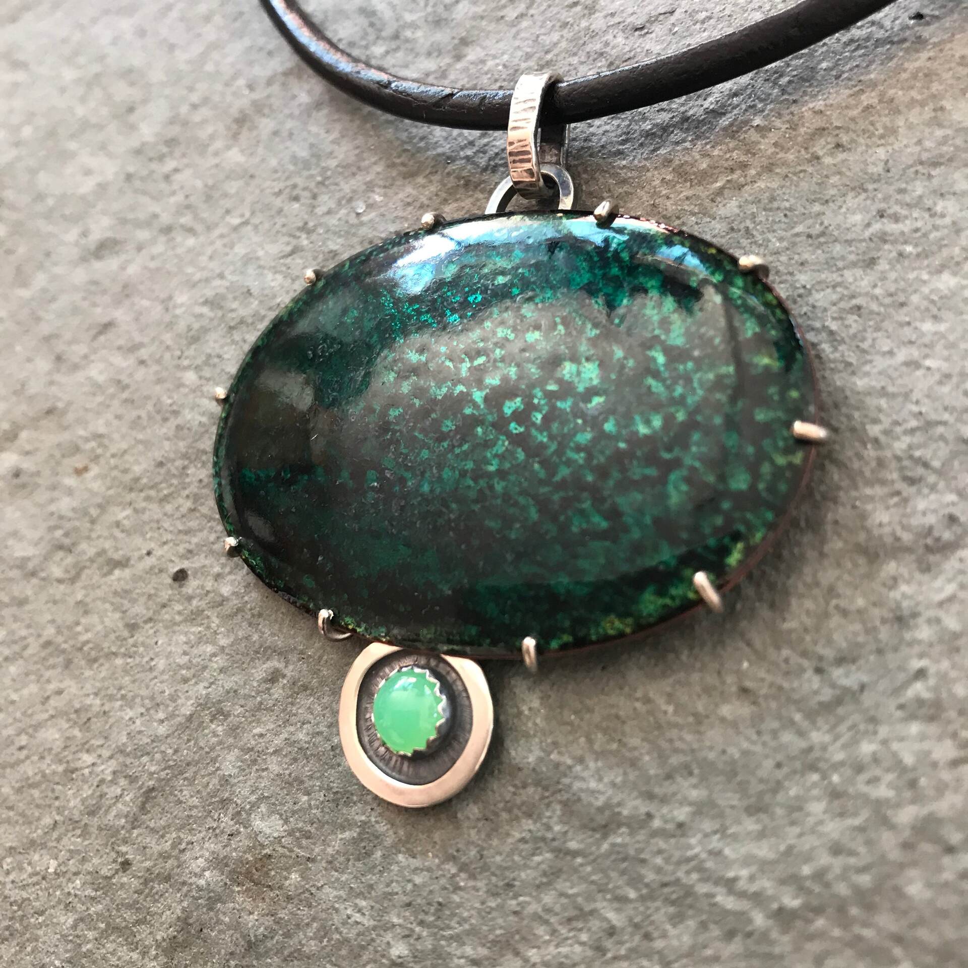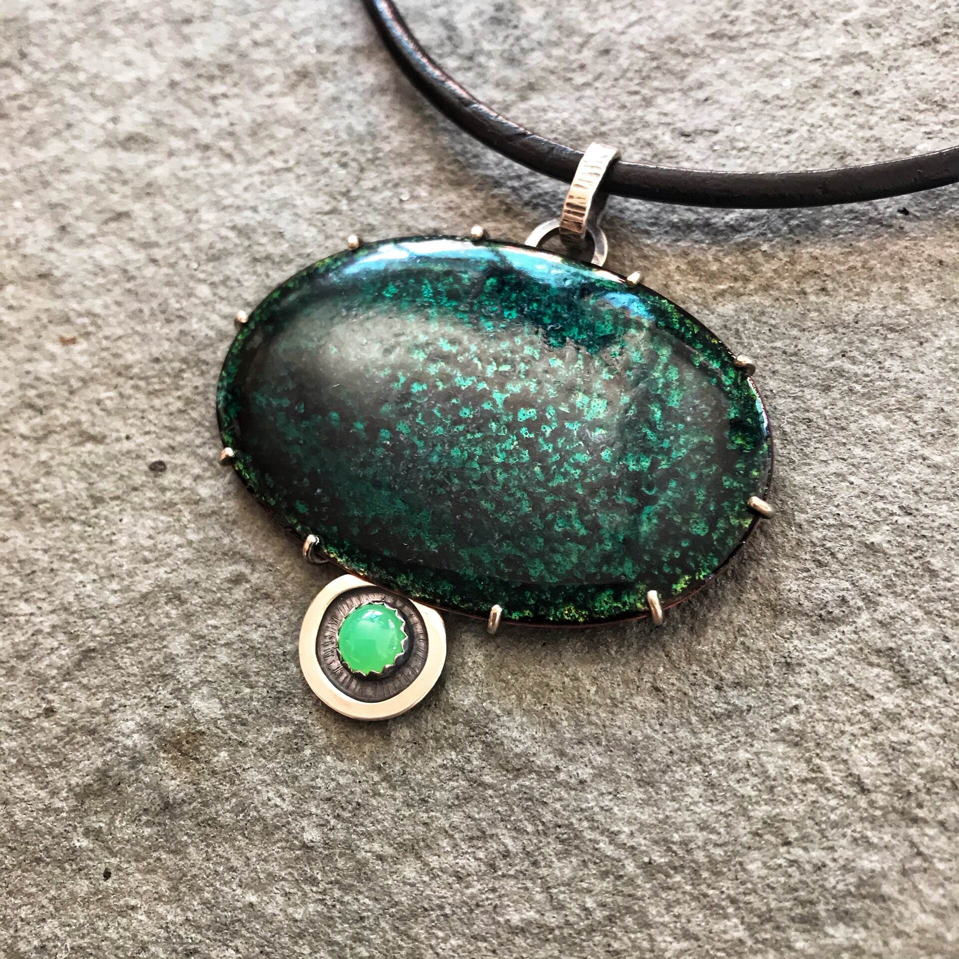 Forest Pond Pendant; Transparent Vitreous enamel on copper, Chrysoprase gemstone, Sterling silver. Leather & sterling neck cable to requirements or sterling silver chain. Measurement includes bail at top of pendant for the chain.