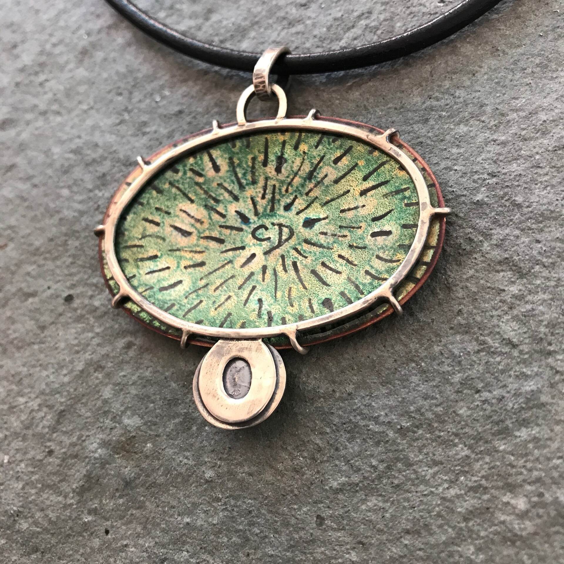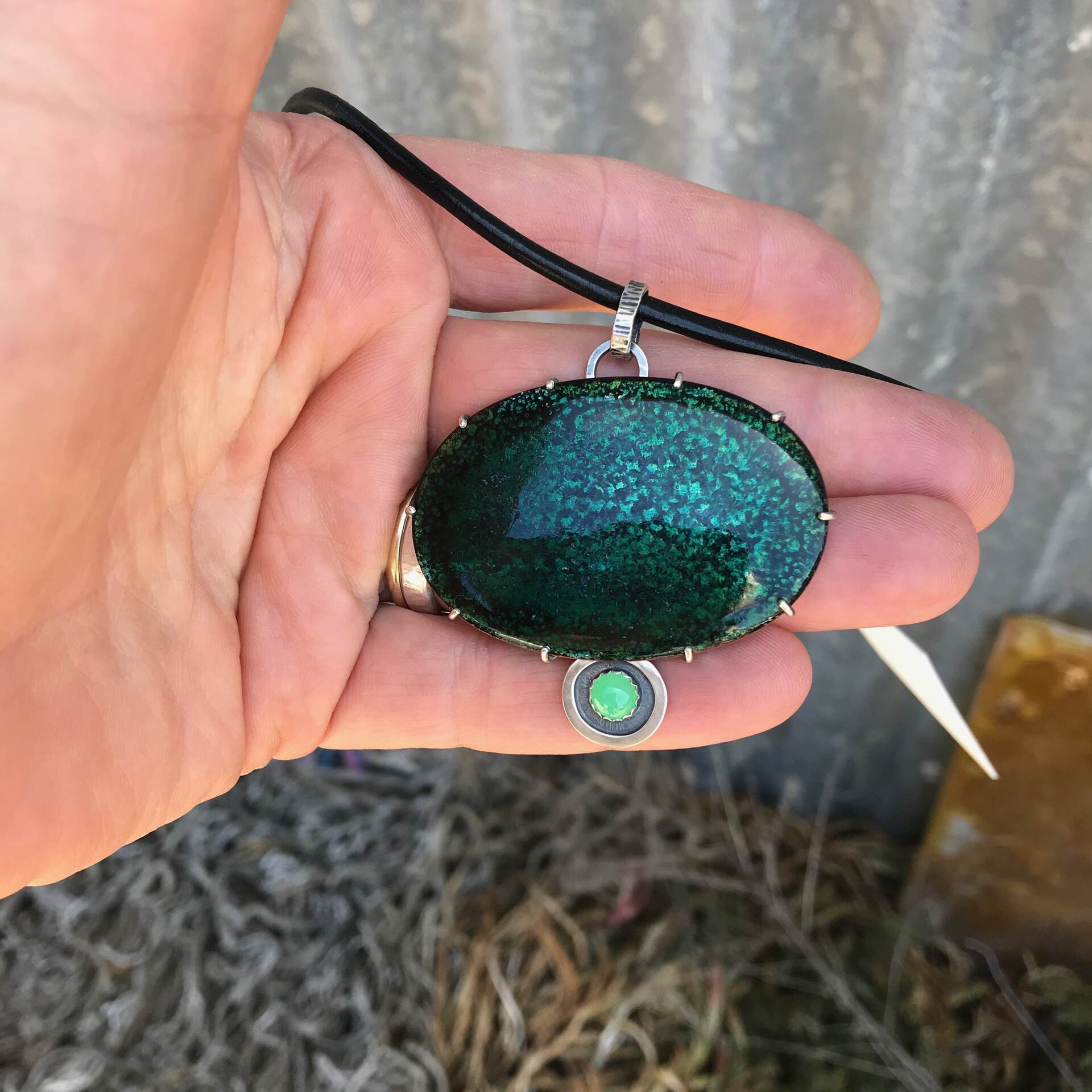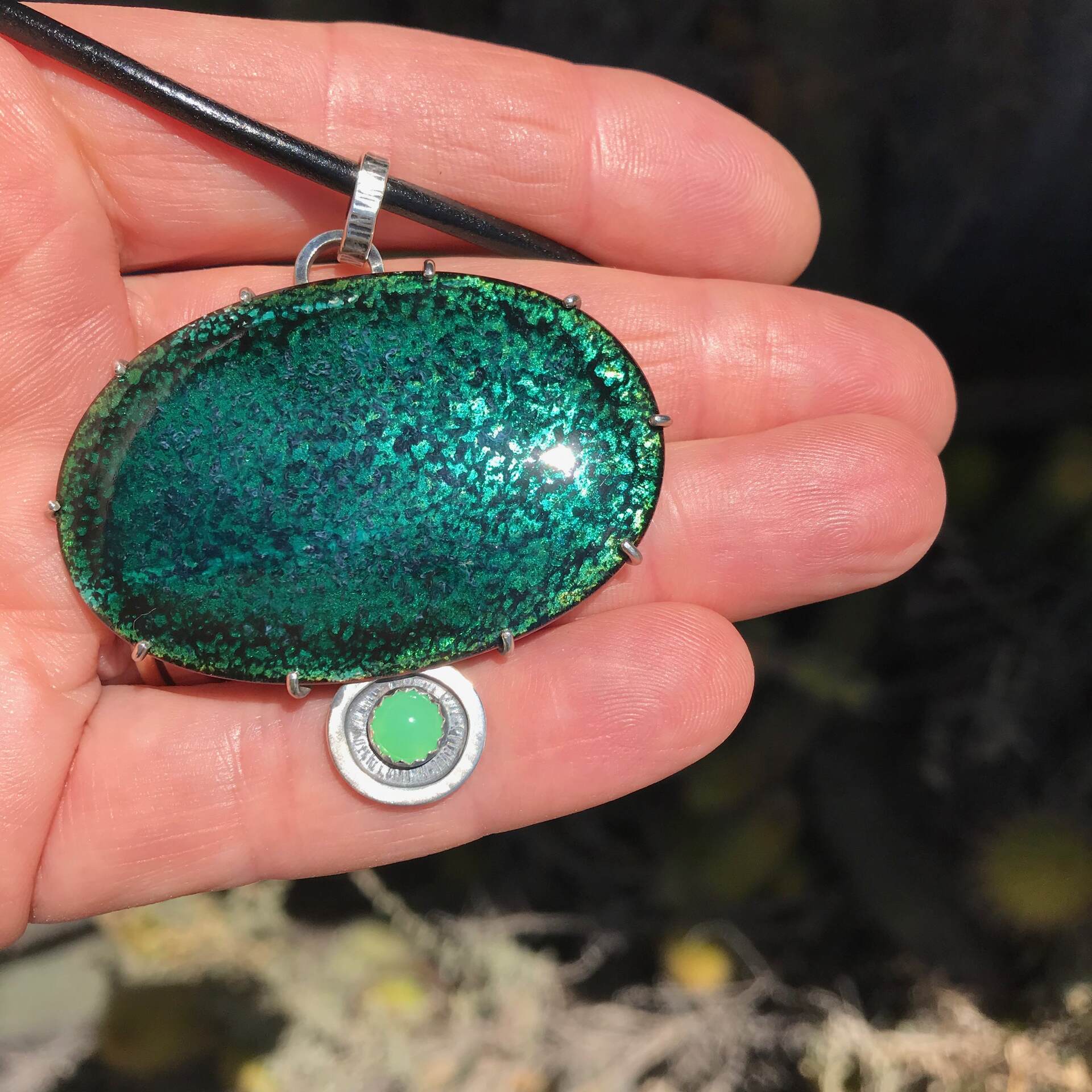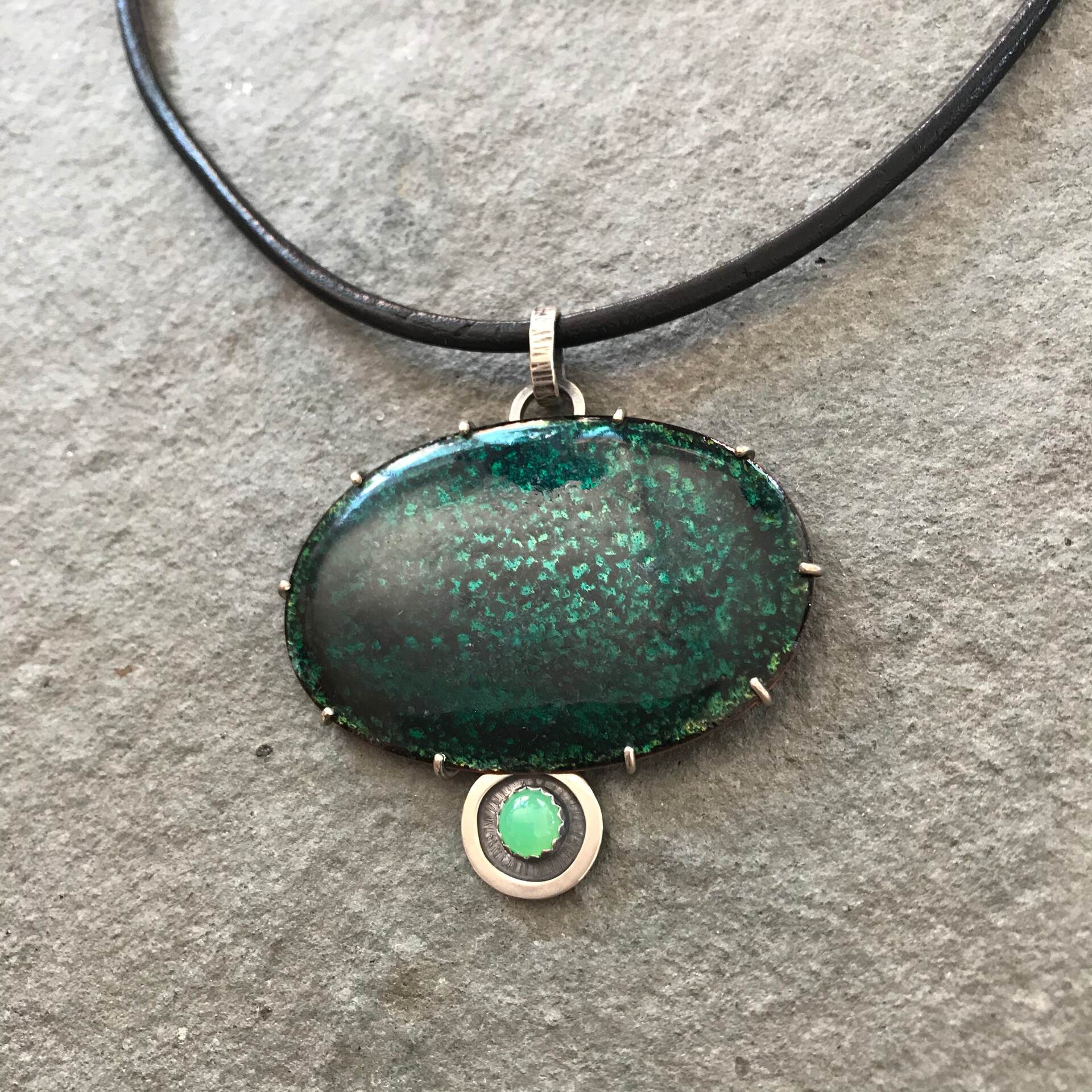 Forest Pond Pendant; Transparent Vitreous enamel on copper, Chrysoprase gemstone, Sterling silver. Leather & sterling neck cable to requirements or sterling silver chain. Measurement includes bail at top of pendant for the chain.
