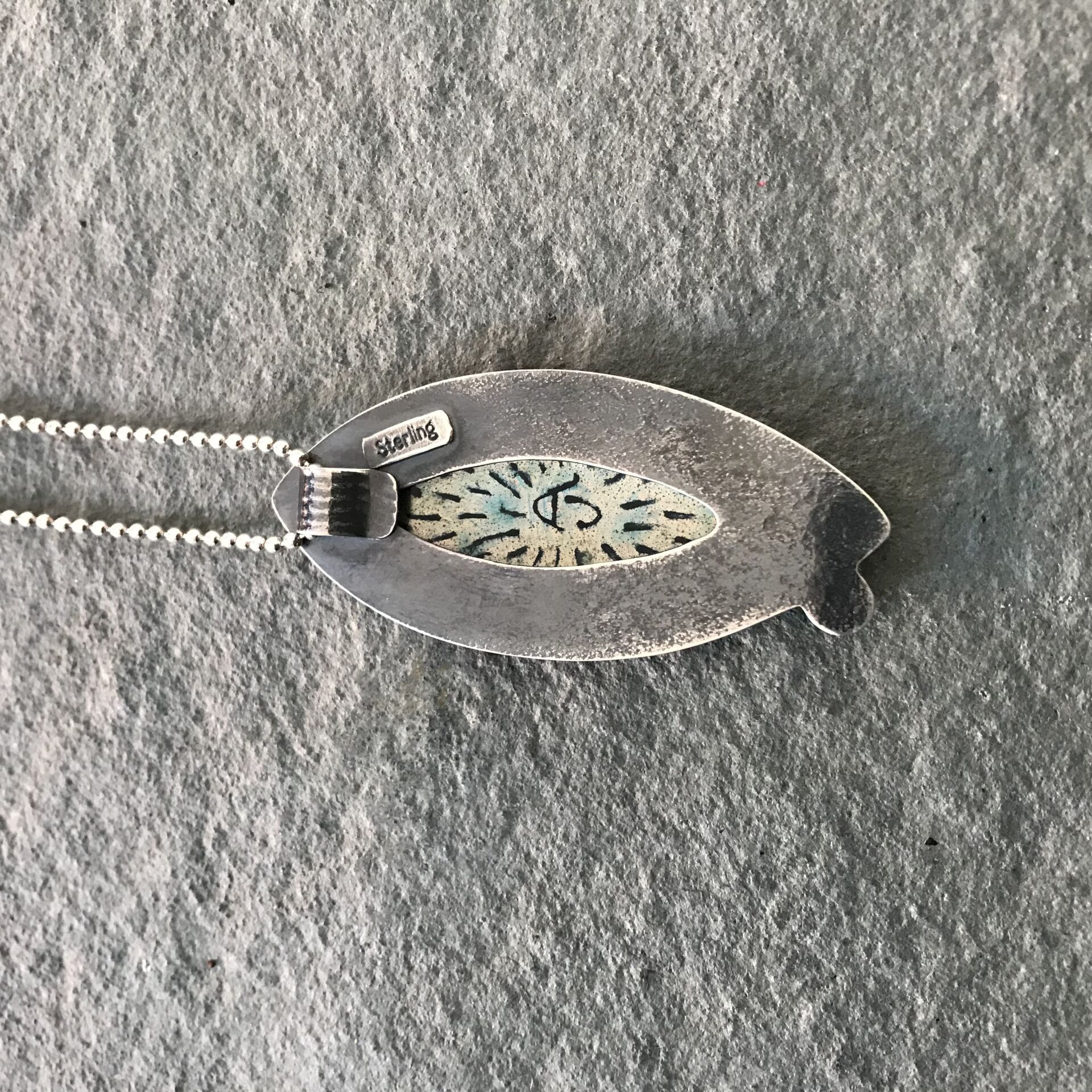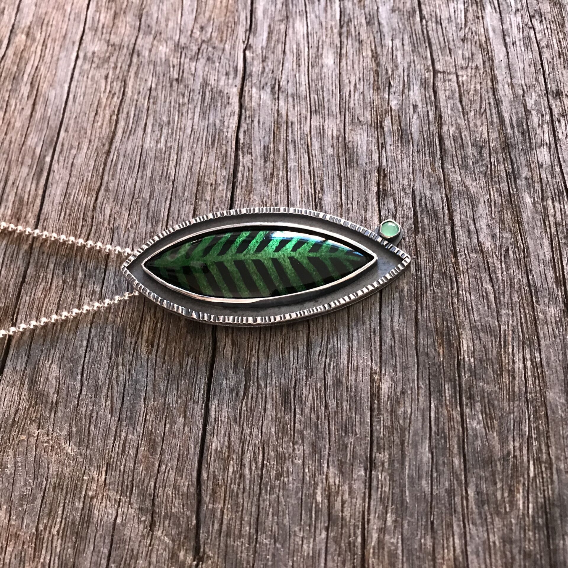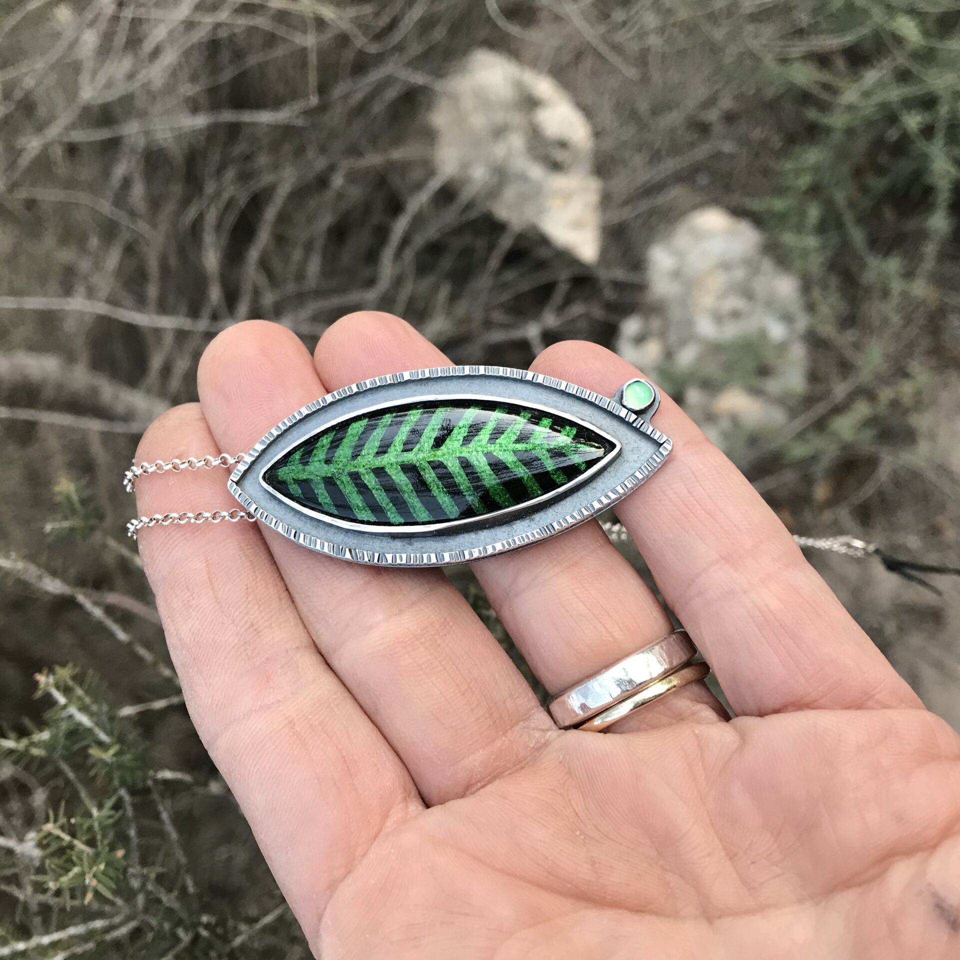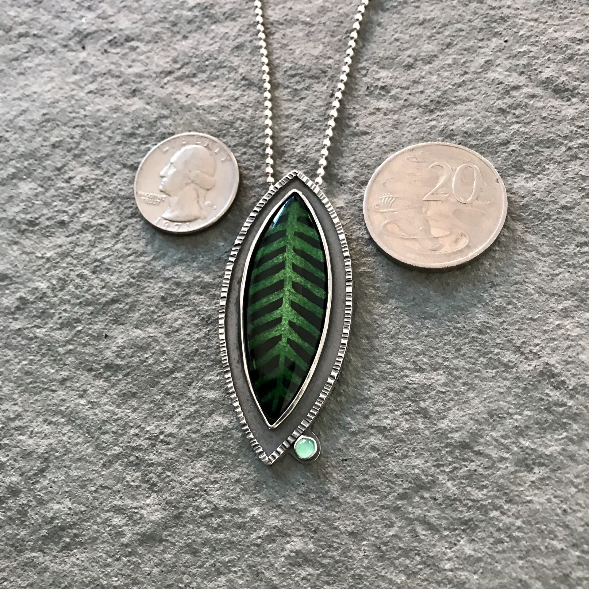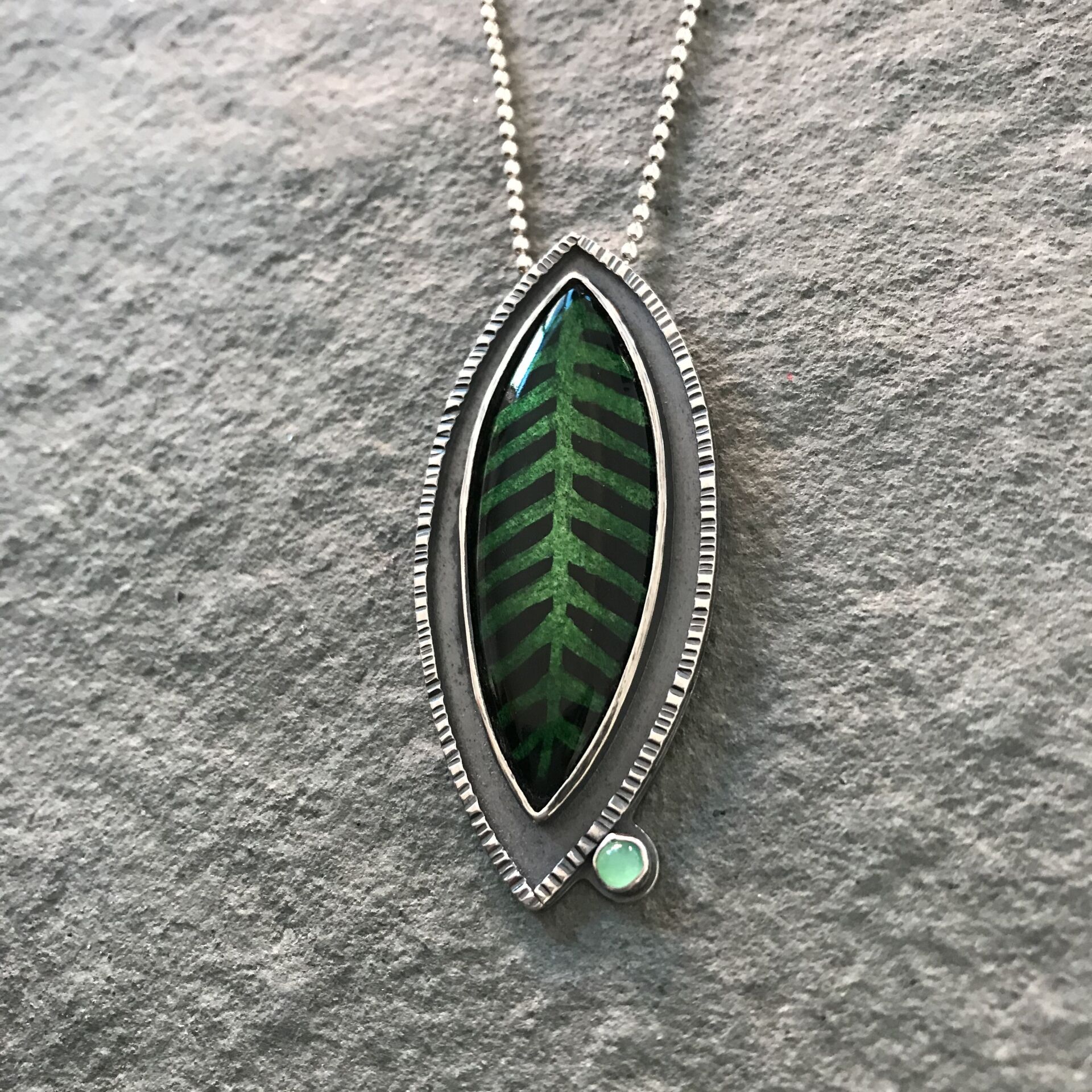 Green Leaf Pendant; Transparent Vitreous enamel and black underglaze on copper with Chrysoprase gemstone set in hand fabricated Sterling Silver setting. Invisible bail at back. Sterling Silver chain to your requirements. Please mention your preferred chain length with your purchase.
