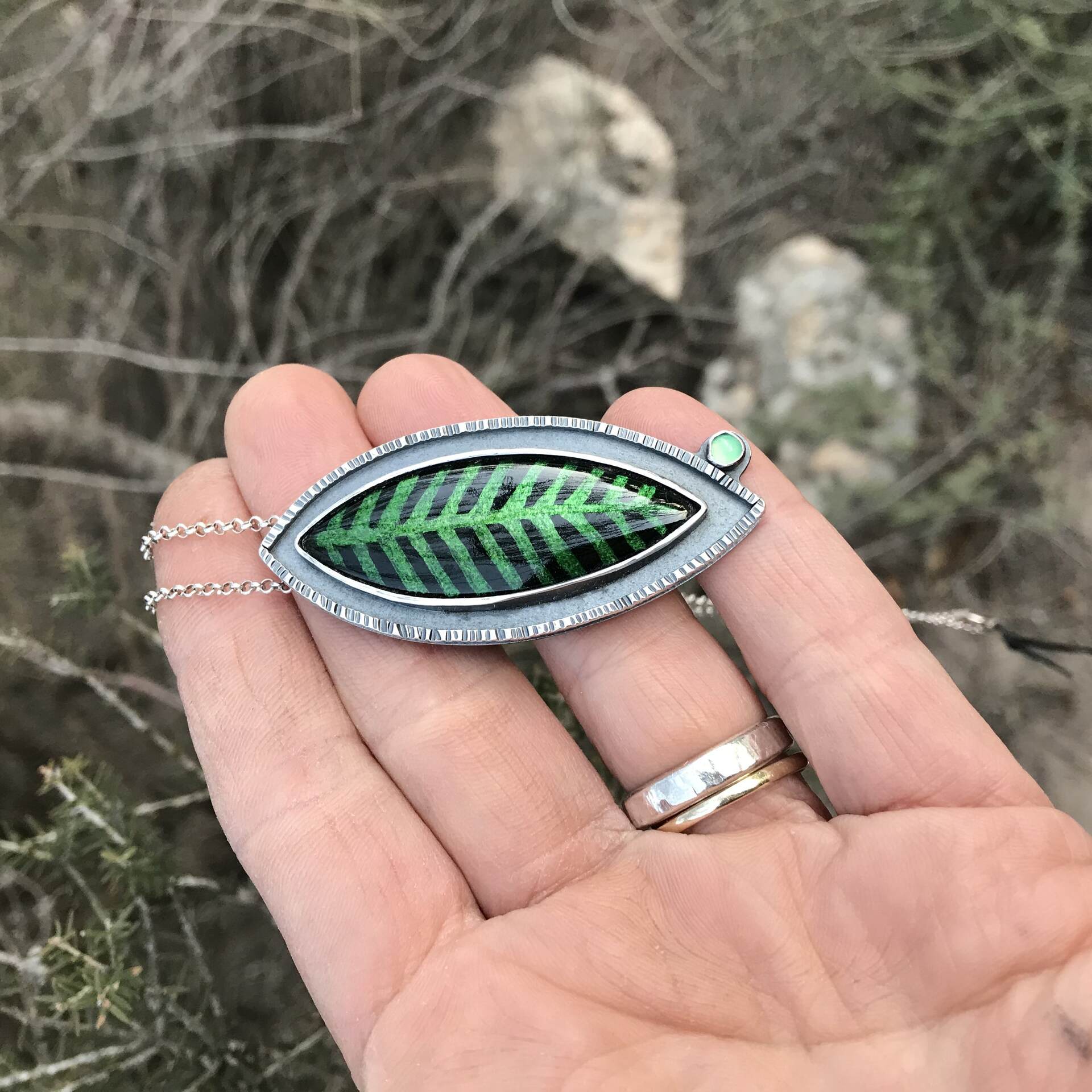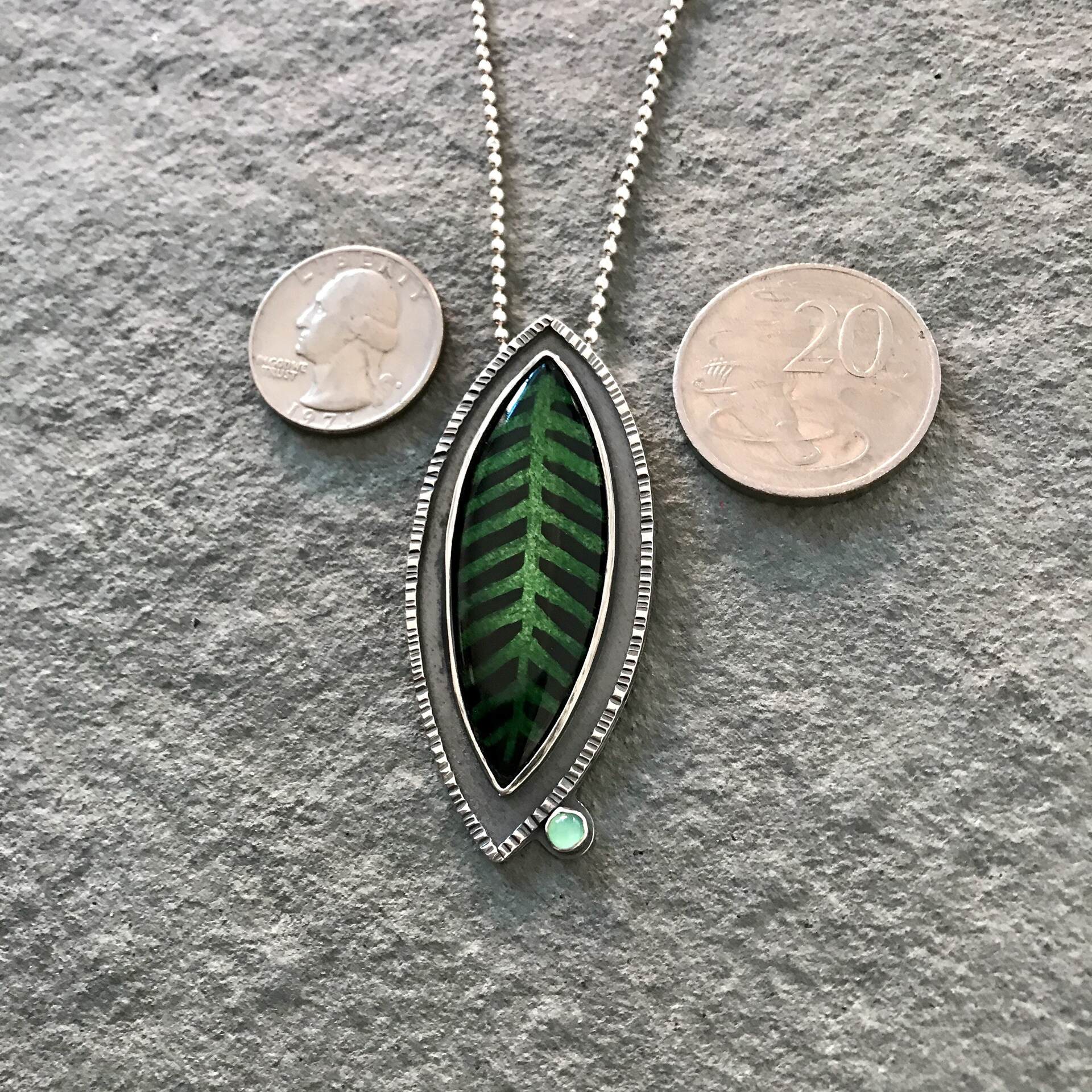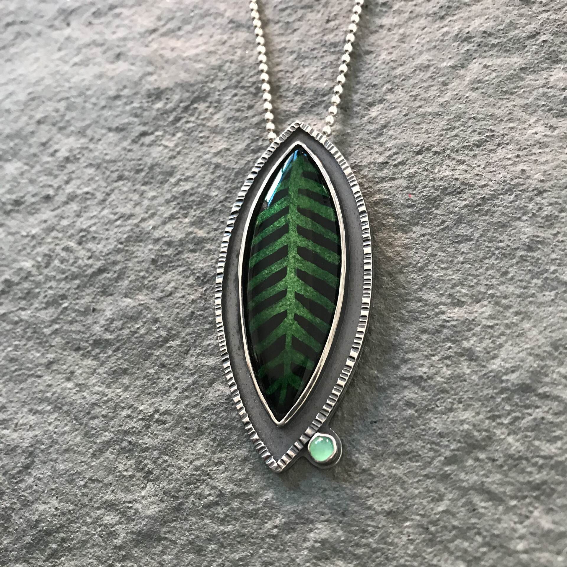 Green Leaf Pendant; Transparent Vitreous enamel and black underglaze on copper with Chrysoprase gemstone set in hand fabricated Sterling Silver setting. Invisible bail at back. Sterling Silver chain to your requirements. Please mention your preferred chain length with your purchase.