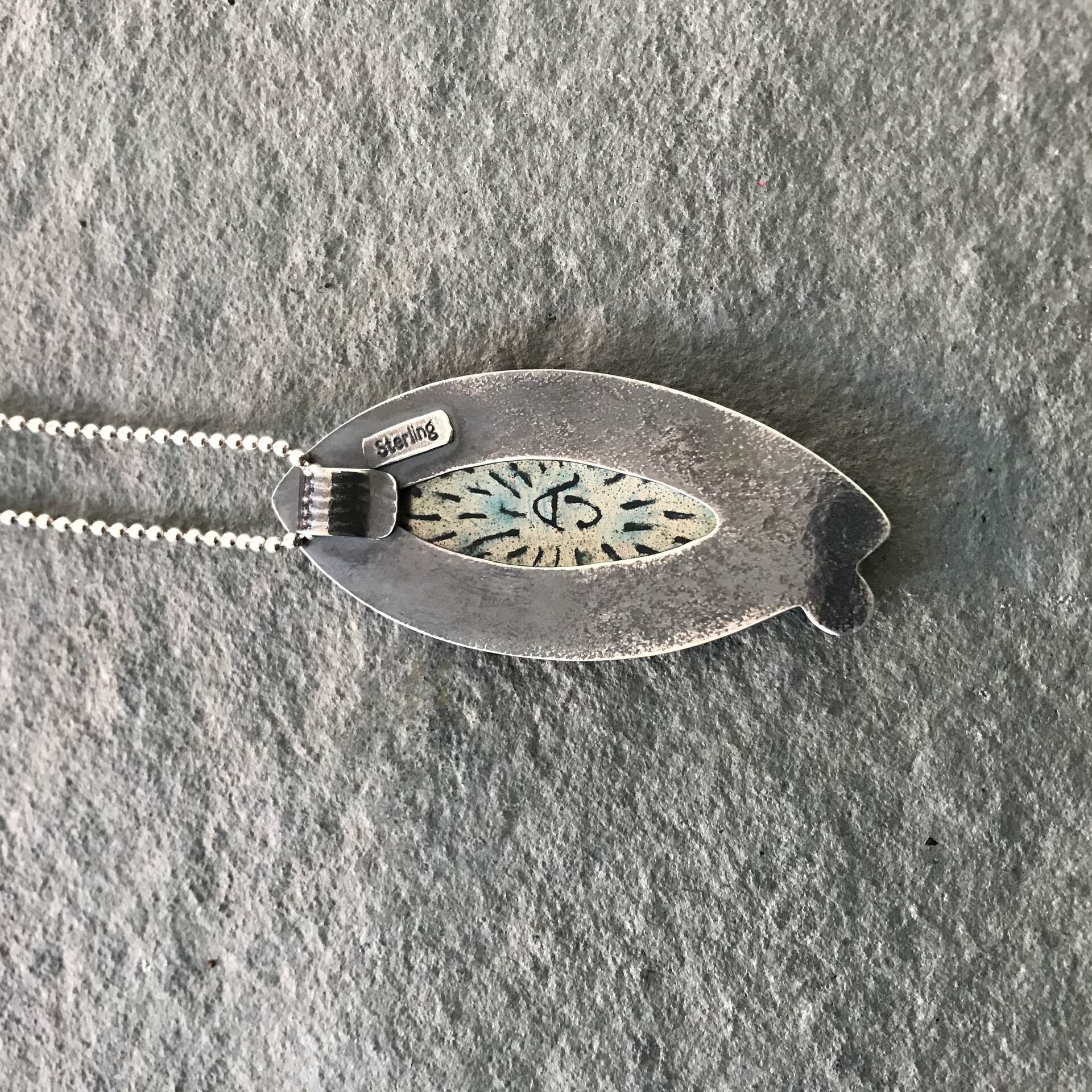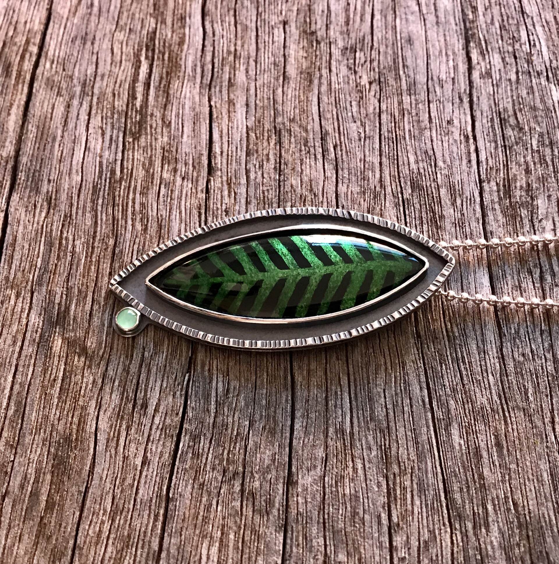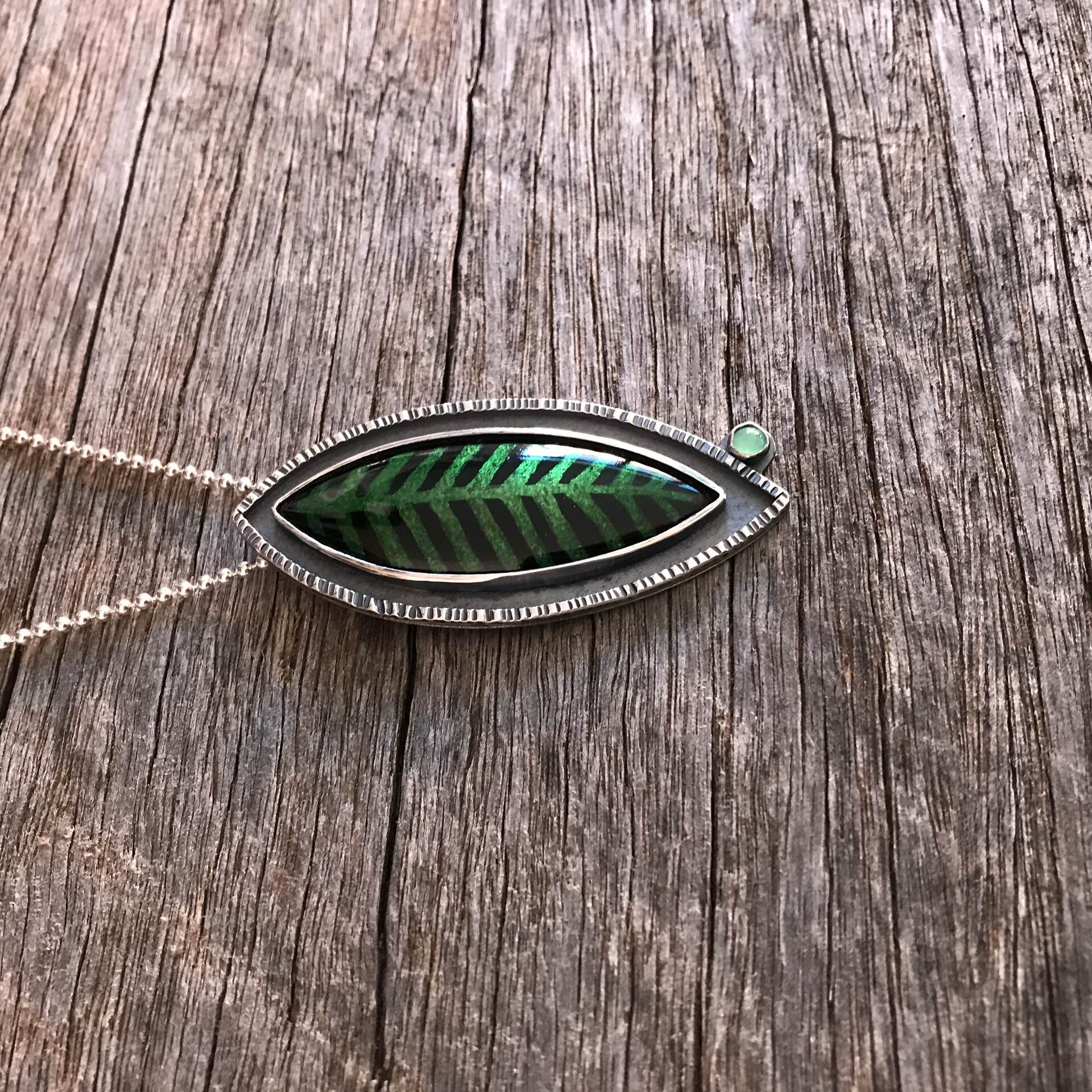 Green Leaf Pendant; Transparent Vitreous enamel and black underglaze on copper with Chrysoprase gemstone set in hand fabricated Sterling Silver setting. Invisible bail at back. Sterling Silver chain to your requirements. Please mention your preferred chain length with your purchase.