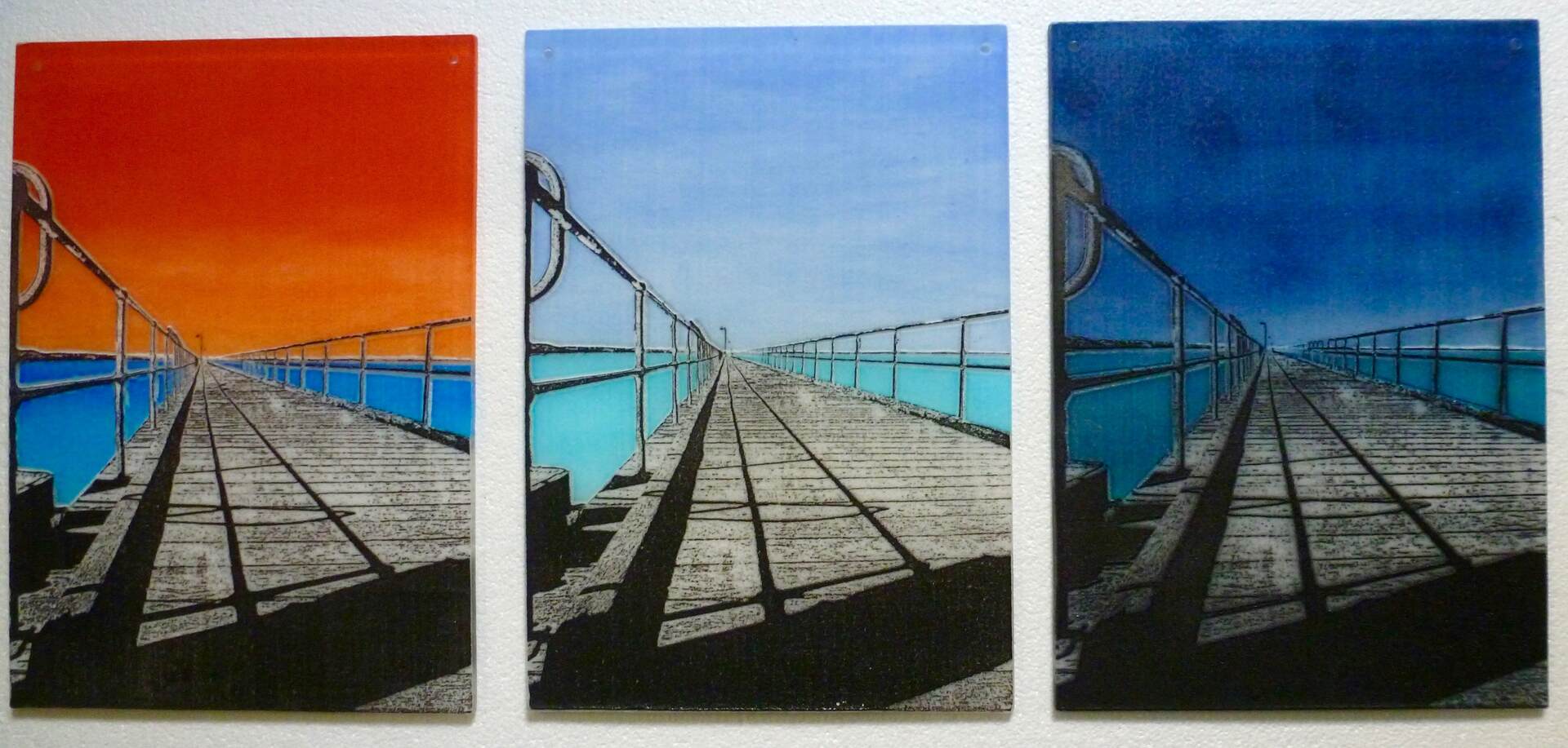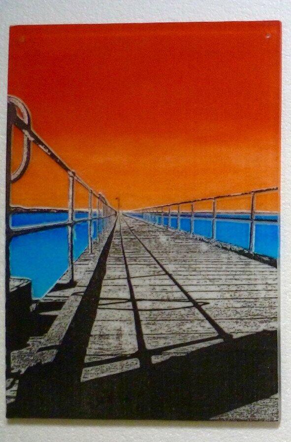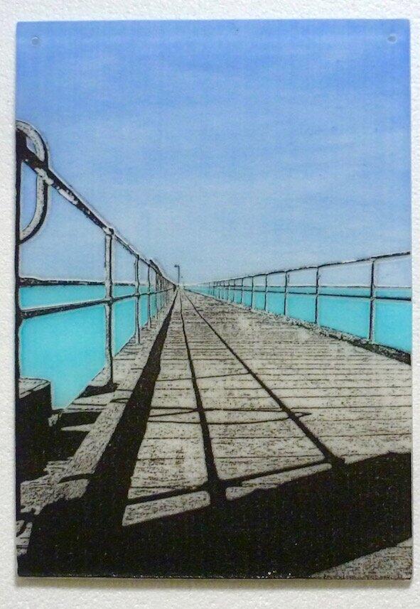 'Jetty Somewhere' - Red sky. Glass; kiln-formed, textural printed. These are very textural prints. This is a single piece of glass which measures 287mm W x 407mm H x 5mm thick. Wall fittings included.