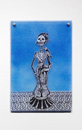 'Lady with Birds' - Mexico where my Heart is. Night Sky. Kiln-formed, textural printed glass. These textural prints look like velvet. This is a single piece of glass which measures 217mm W x 317mm H x 4mm thick. Wall fittings included.