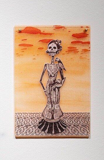 'Lady with Birds' - Mexico where my Heart is. Sunset Sky. Kiln-formed, textural printed glass. These textural prints look like velvet. This is a single piece of glass which measures 217mm W x 317mm H x 4mm thick. Wall fittings included.