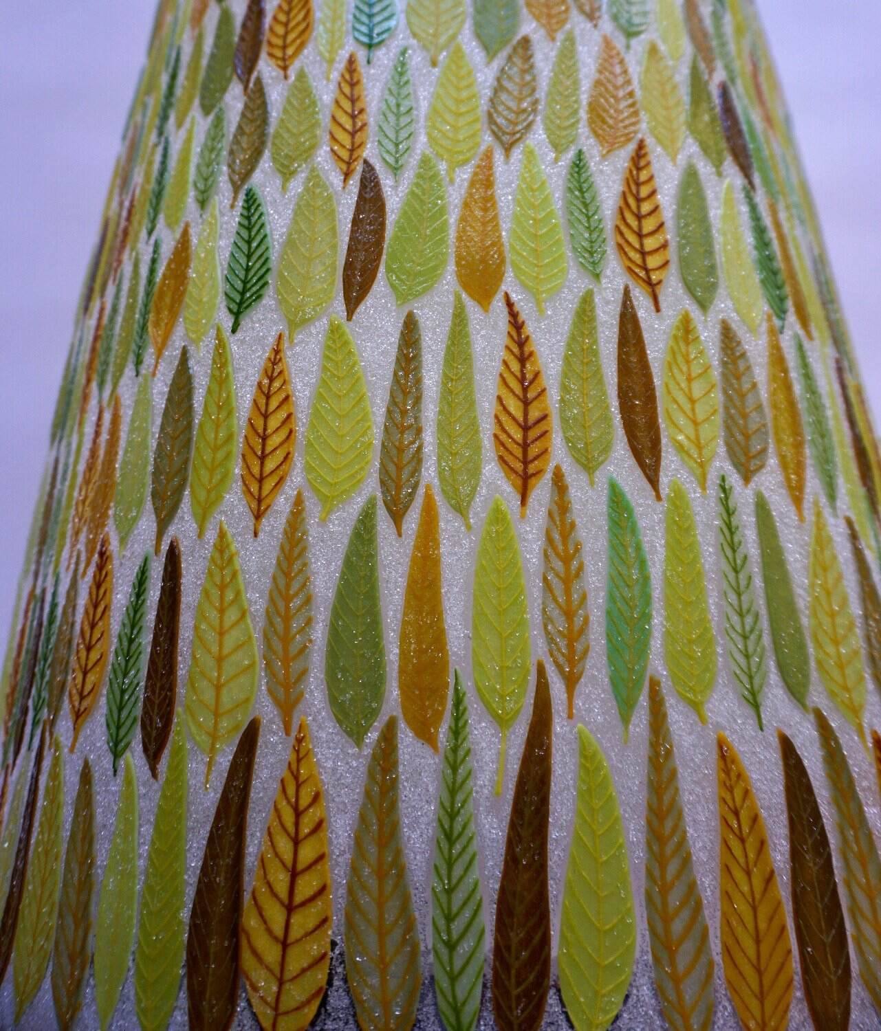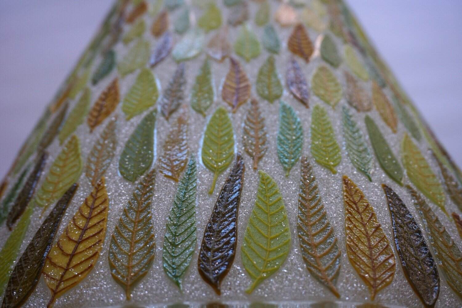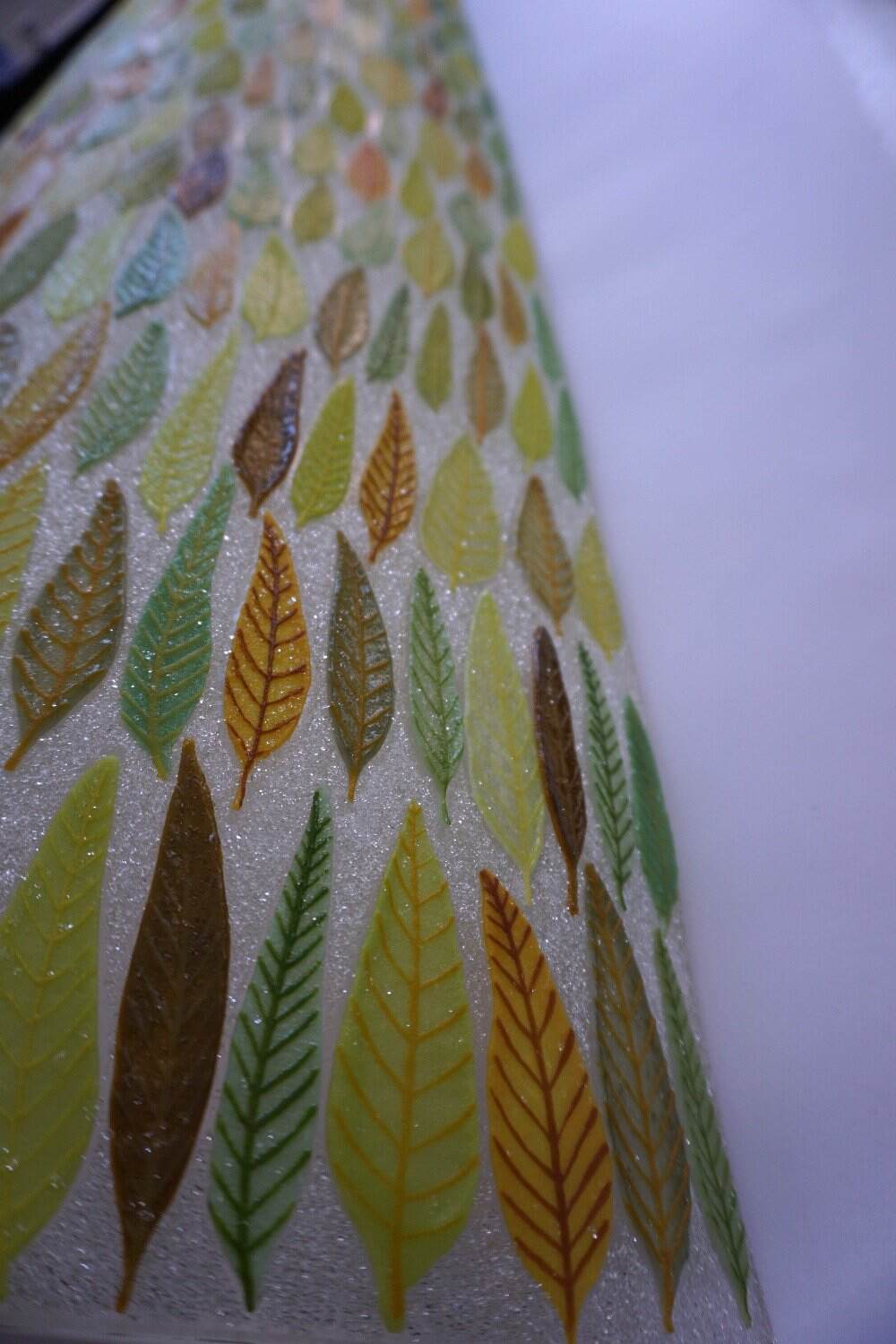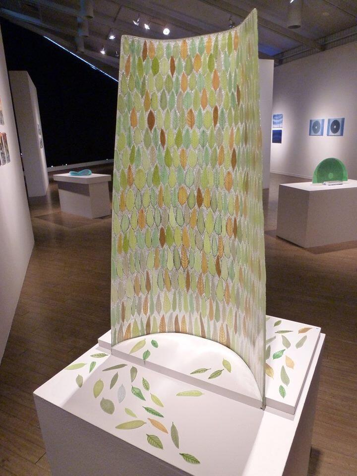 This is a curved upright piece of glass and it is very textural. Each little leave was made individually using my special screen-printing technique. There are about 450 leaves in this! Then the piece was assembled and fired in my kiln several times to get the final piece. Seen here it is on a white plinth in the gallery. I can provide a custom made base included in the shown price. We can discuss the options. This piece looks beautiful viewed from the front and the back. It also looks great with LED lighting.