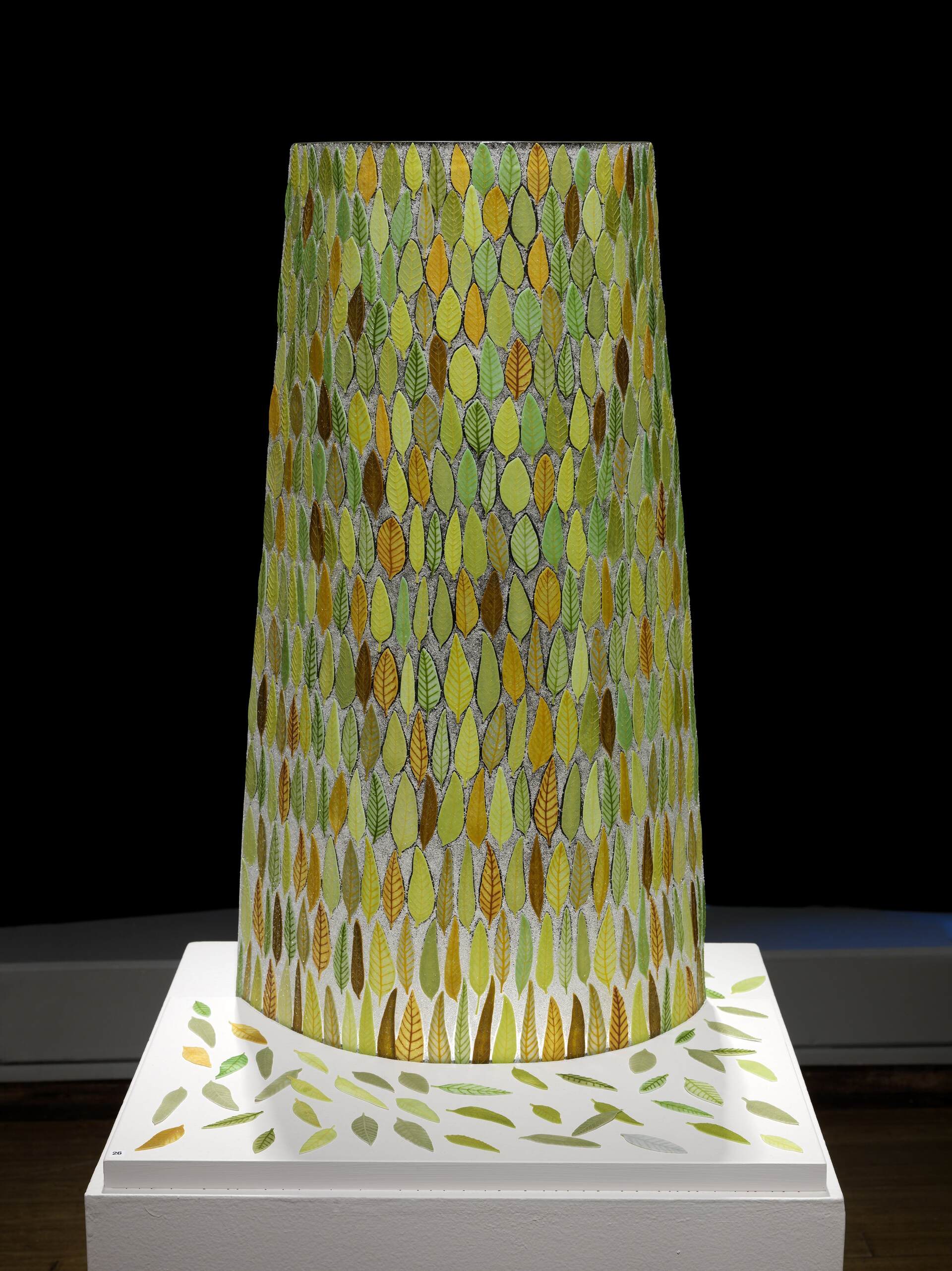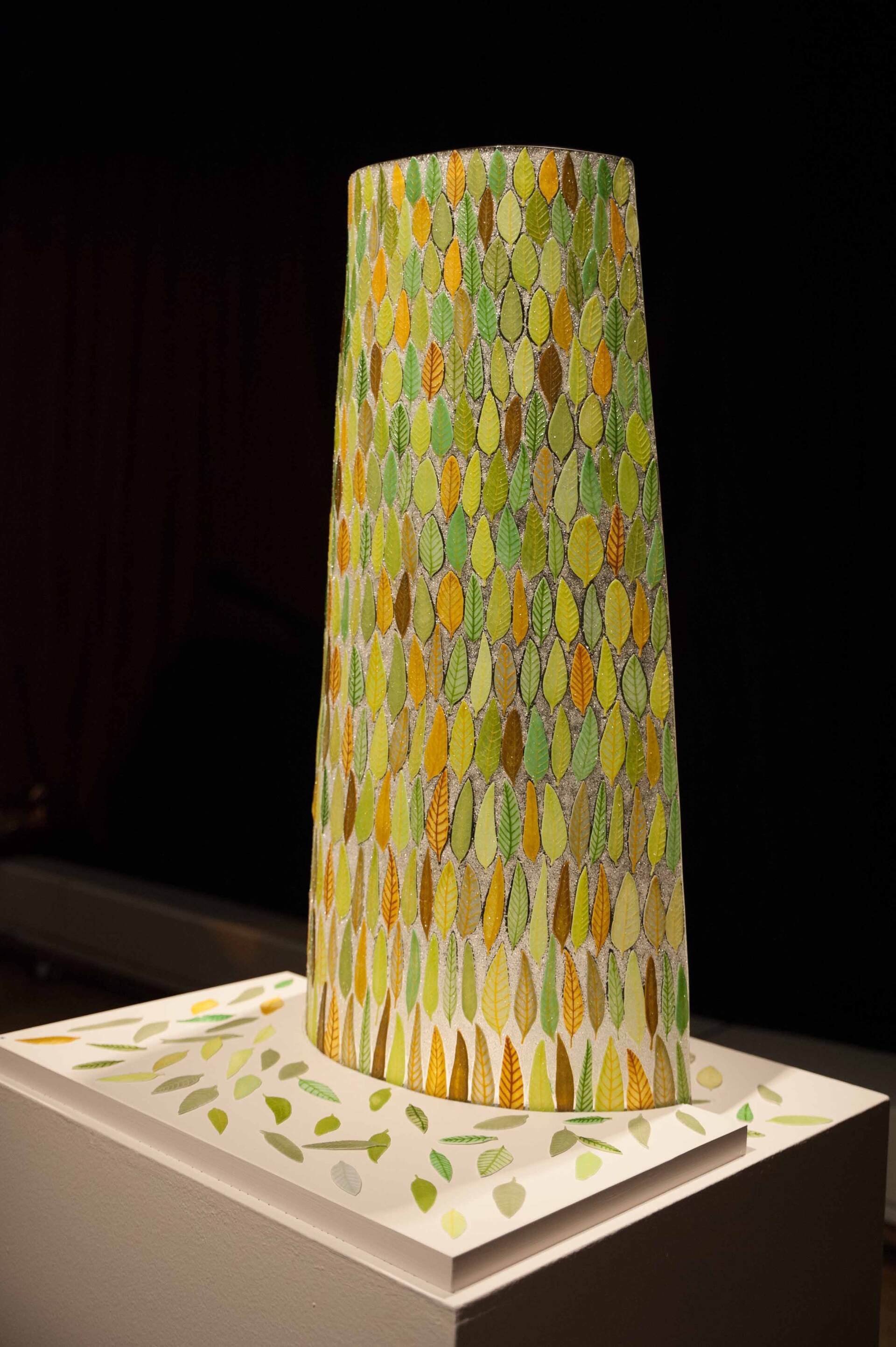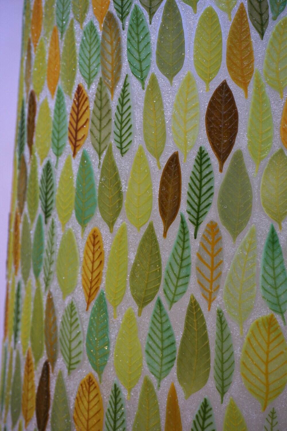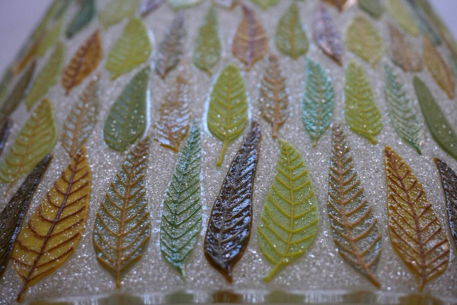 This is a curved upright piece of glass and it is very textural. Each little leave was made individually using my special screen-printing technique. There are about 450 leaves in this! Then the piece was assembled and fired in my kiln several times to get the final piece. Seen here it is on a white plinth in the gallery. I can provide a custom made base included in the shown price. We can discuss the options. This piece looks beautiful viewed from the front and the back. It also looks great with LED lighting.