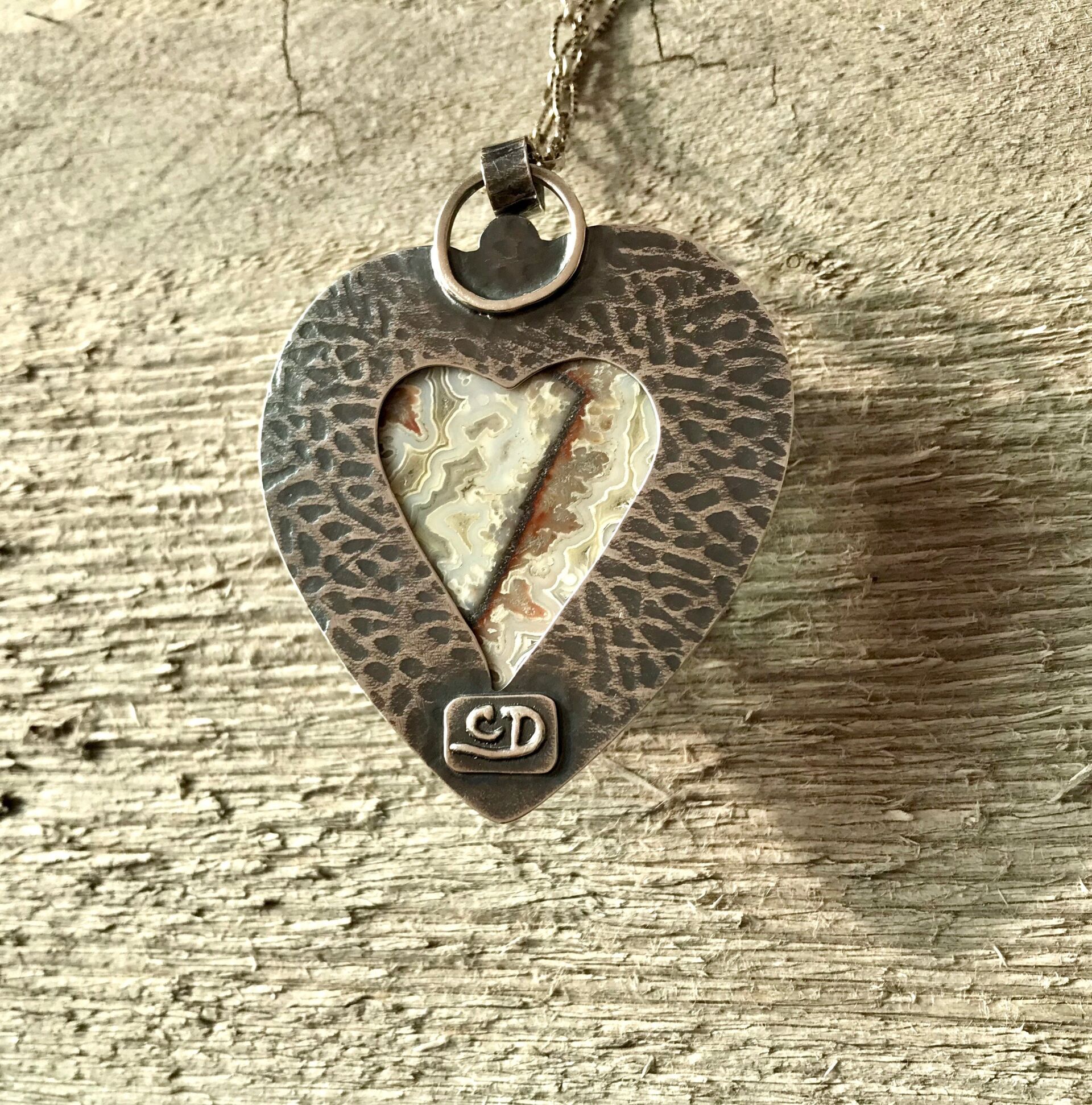 Milagro Heart - Crazy Lace Agate, Garnet and sterling silver pendant.