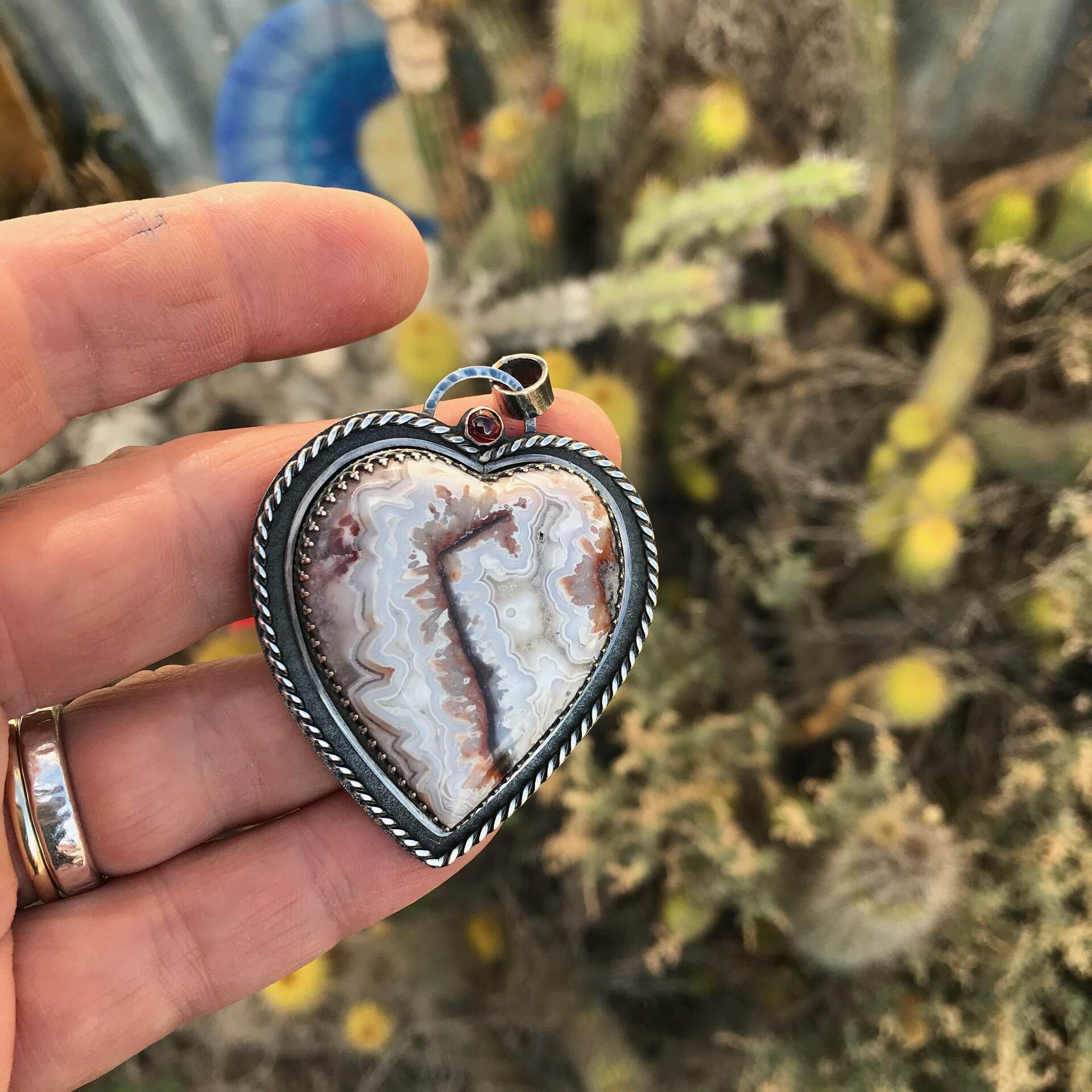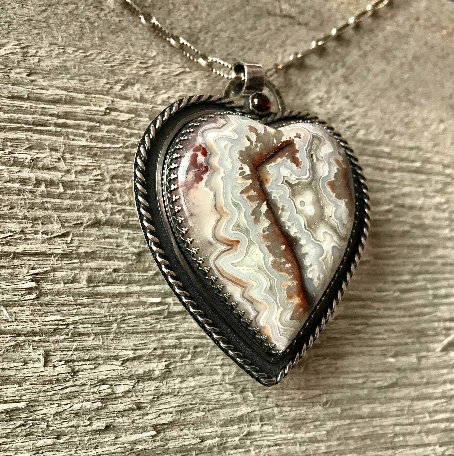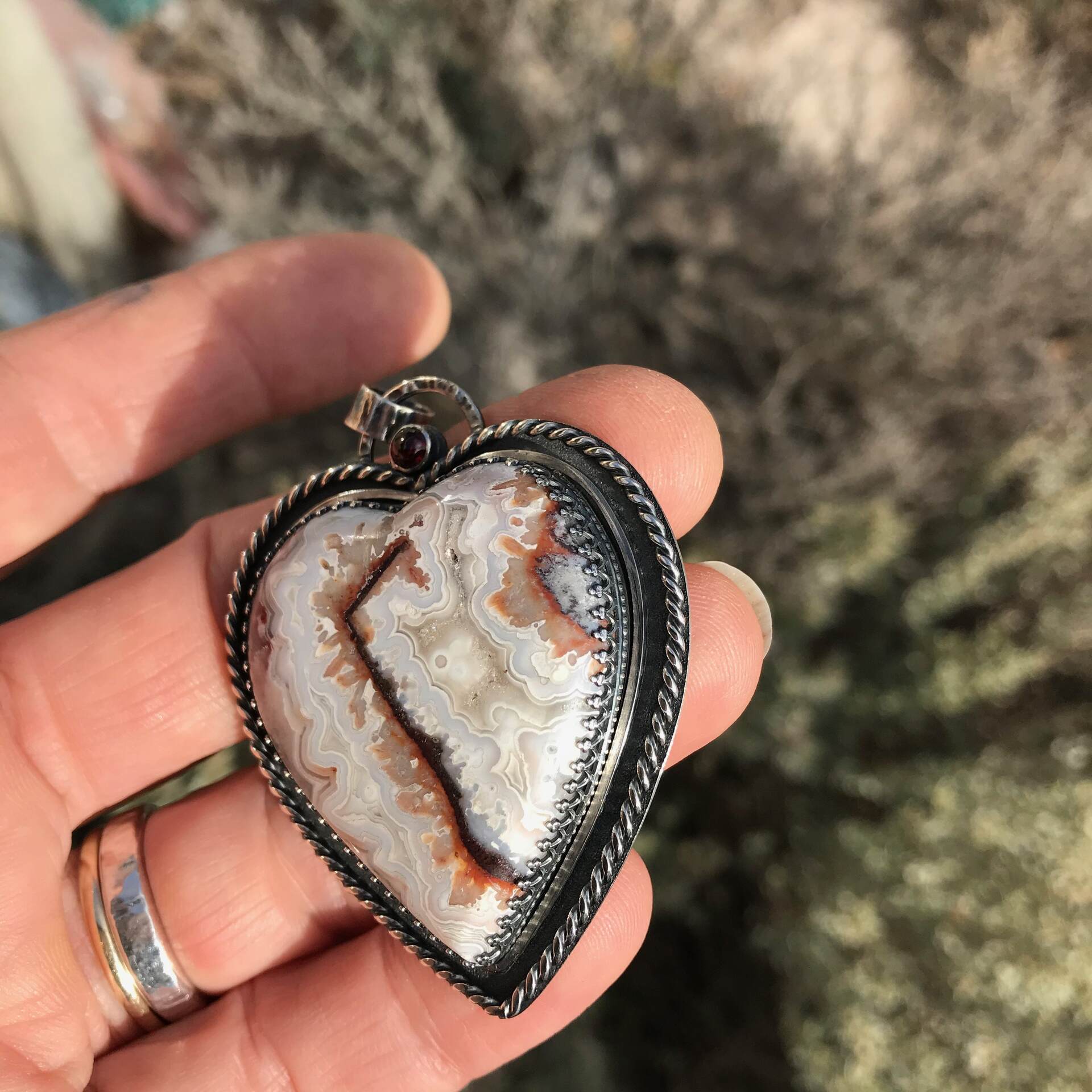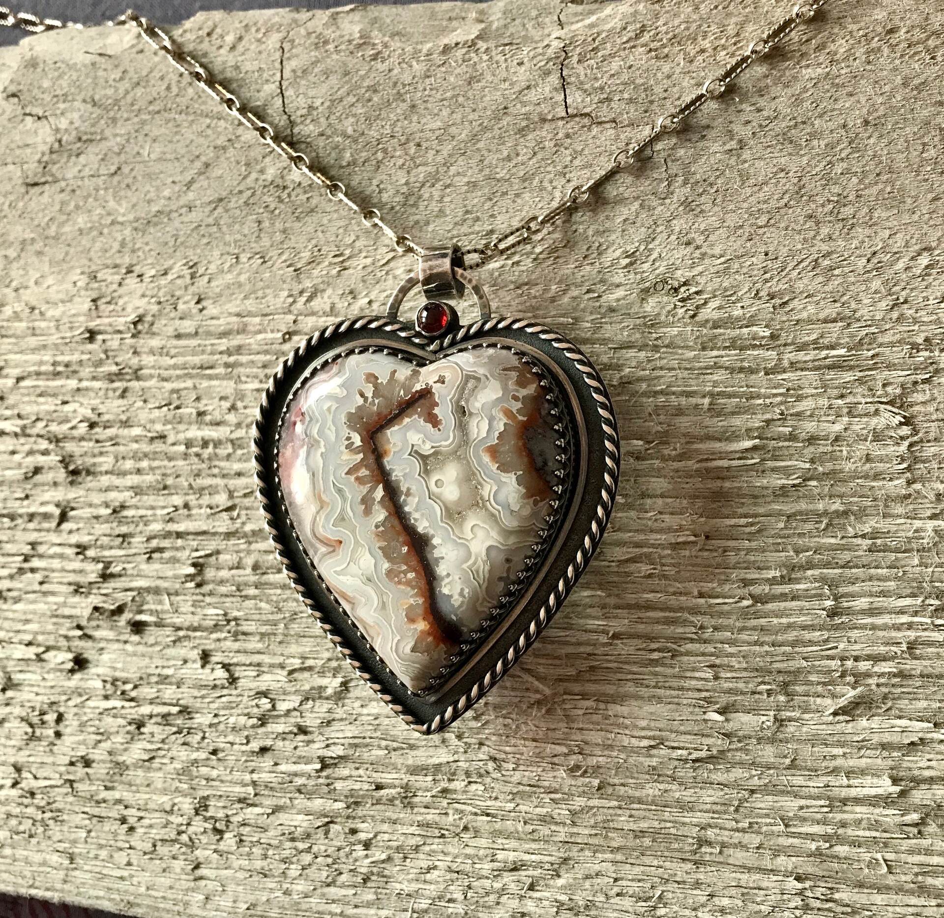 Milagro Heart - Crazy Lace Agate, Garnet and sterling silver pendant.