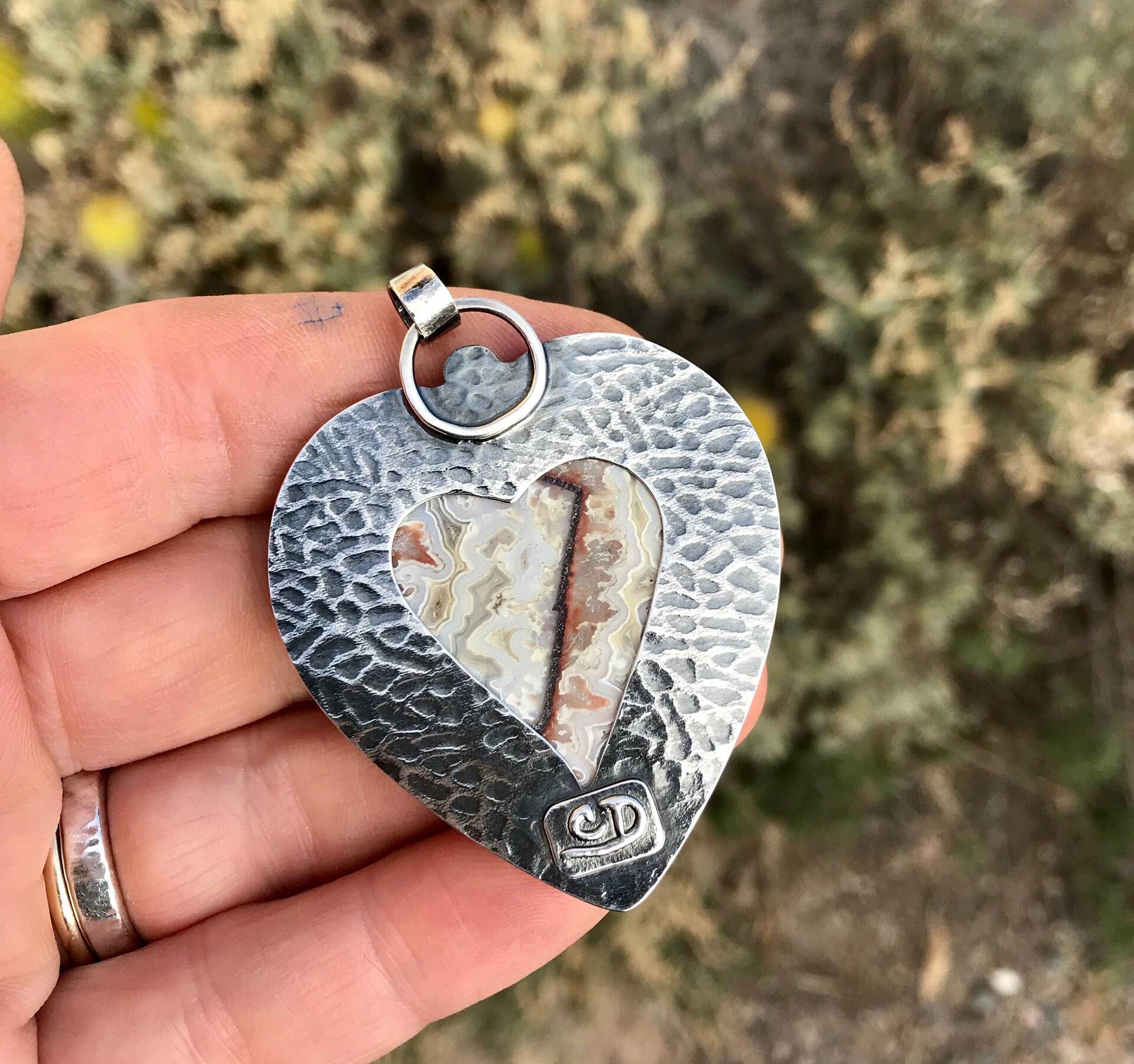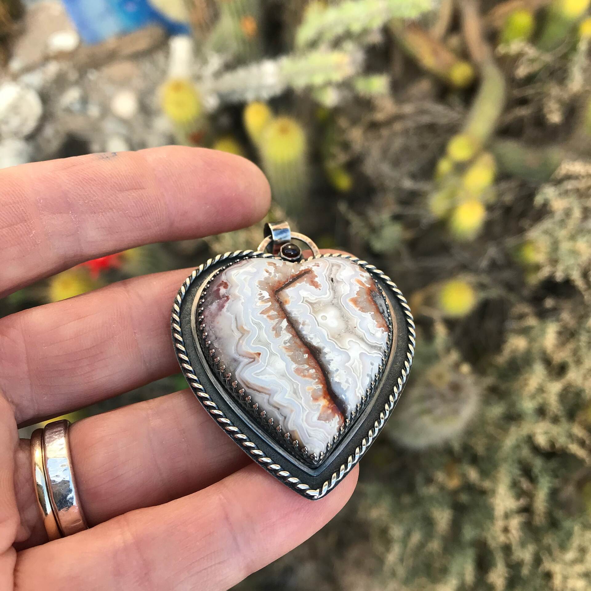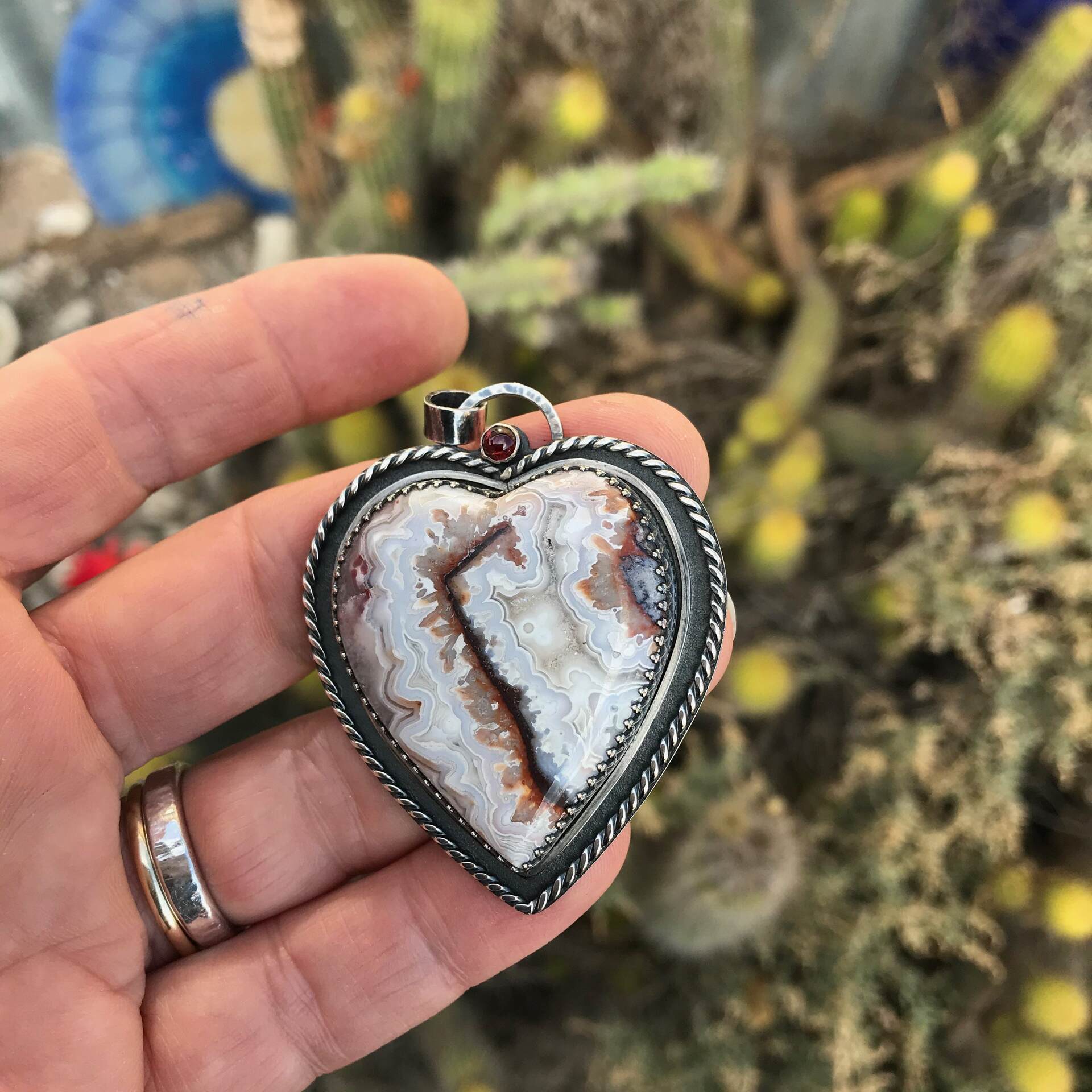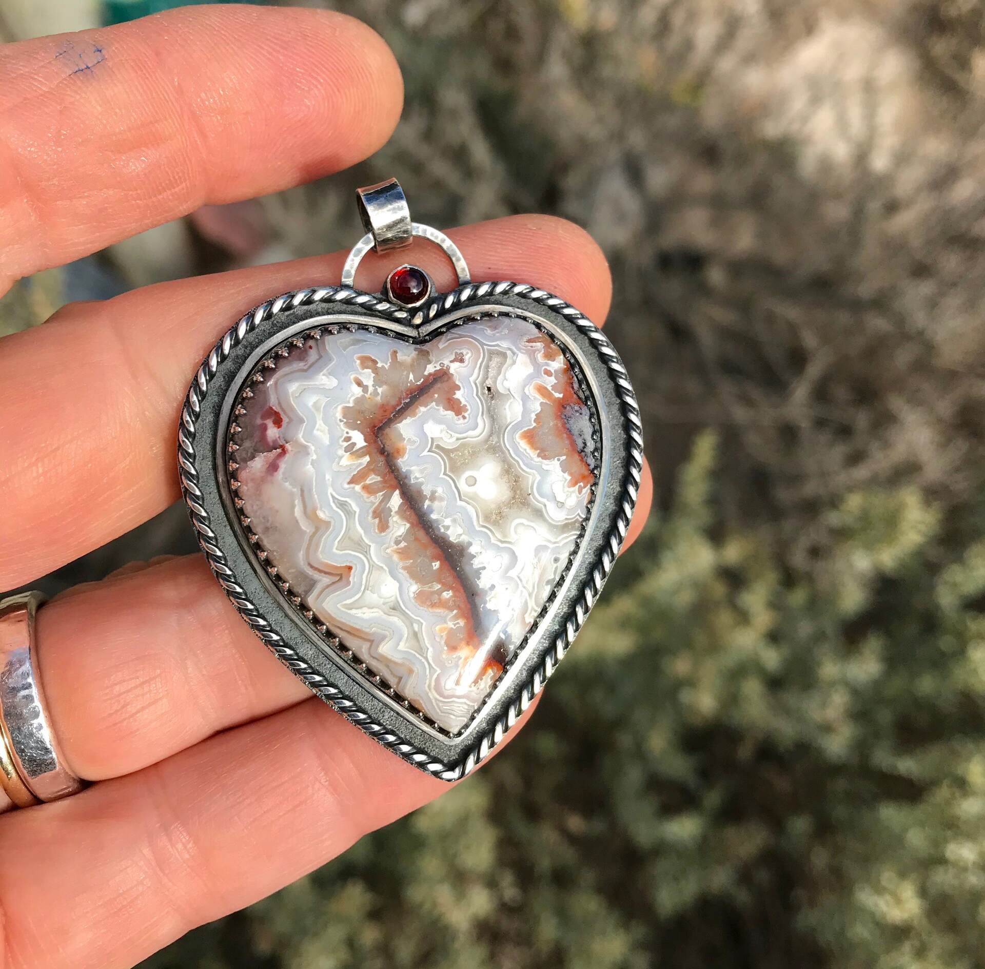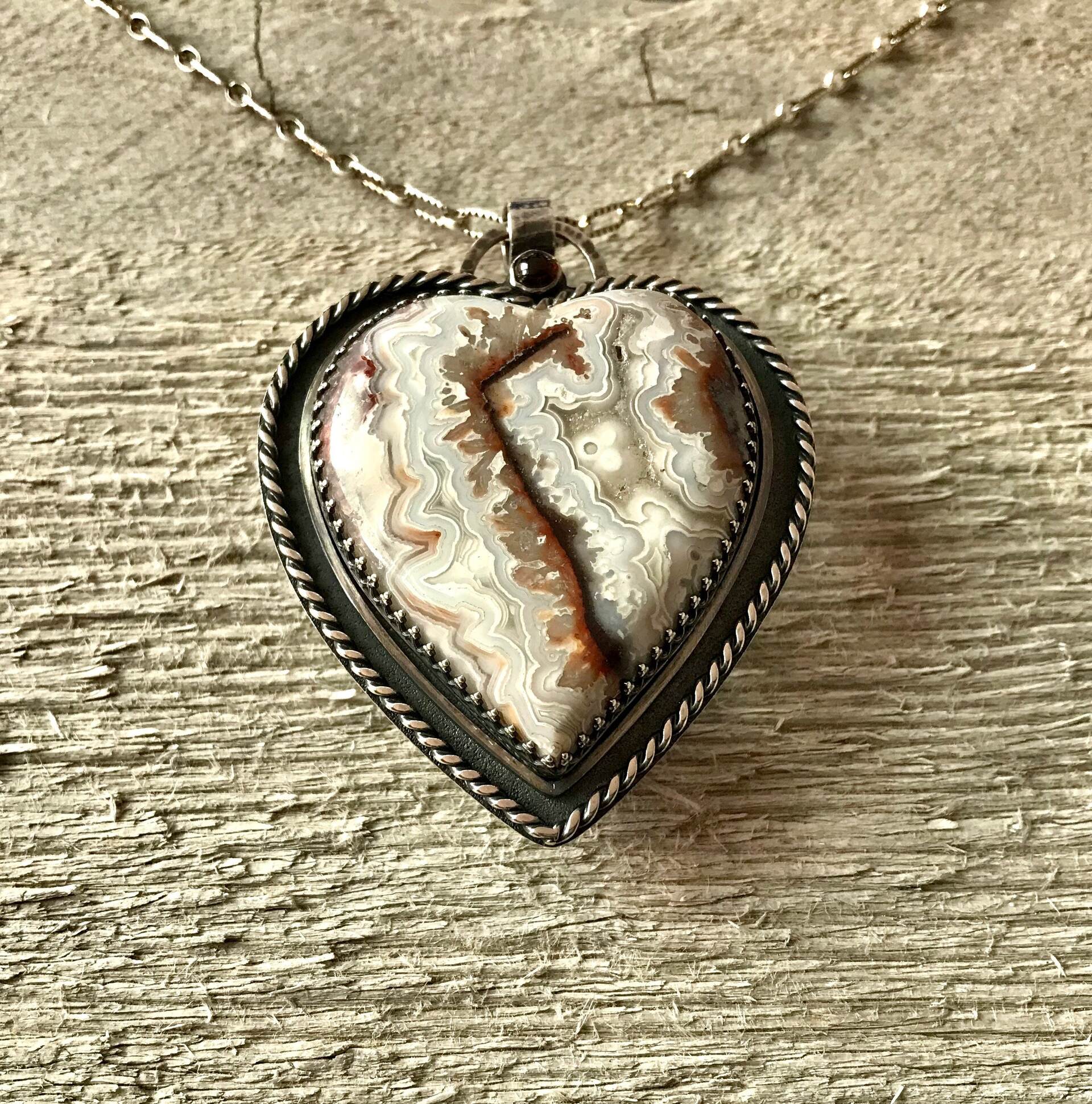Milagro Heart - Crazy Lace Agate, Garnet and sterling silver pendant.