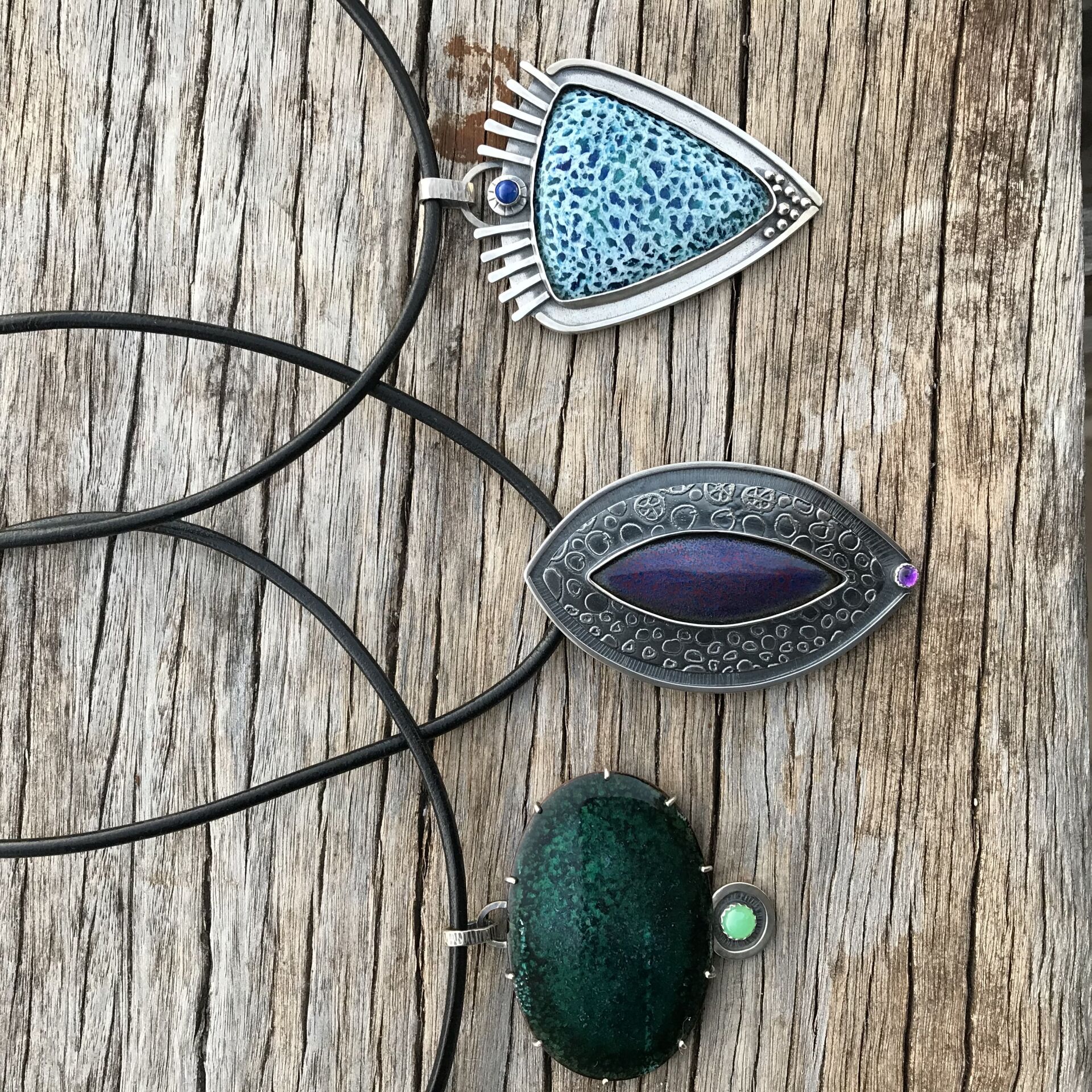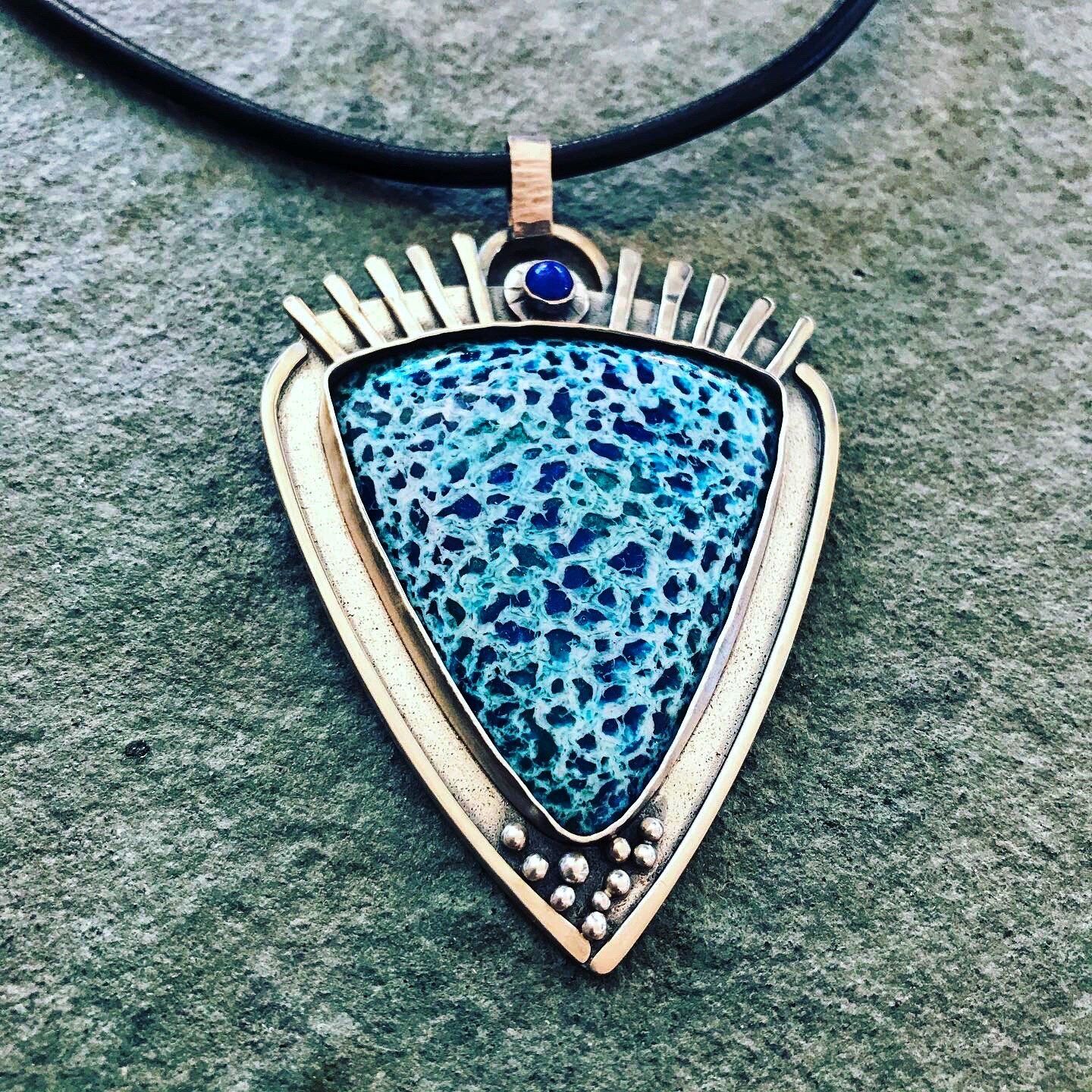 Vitreous enamel on copper, Lapis Lazuli gemstone in hand fabricated Sterling silver setting. Leather & sterling neck cable to requirements or sterling silver chain. Please mention chain or cable size with your purchase. Measurement includes bail at top of pendant for the chain or cable.