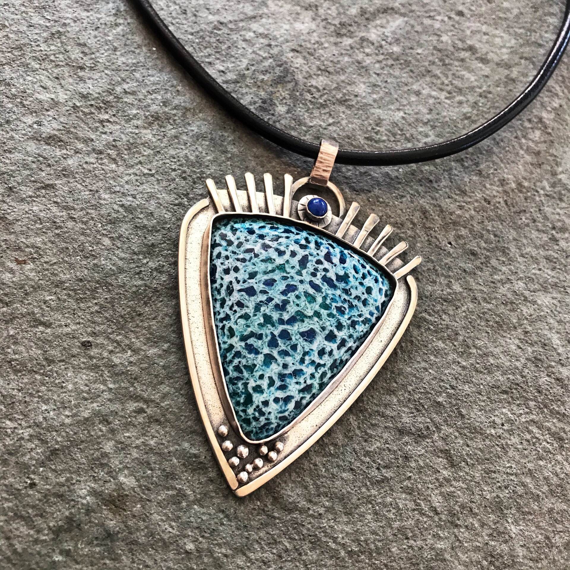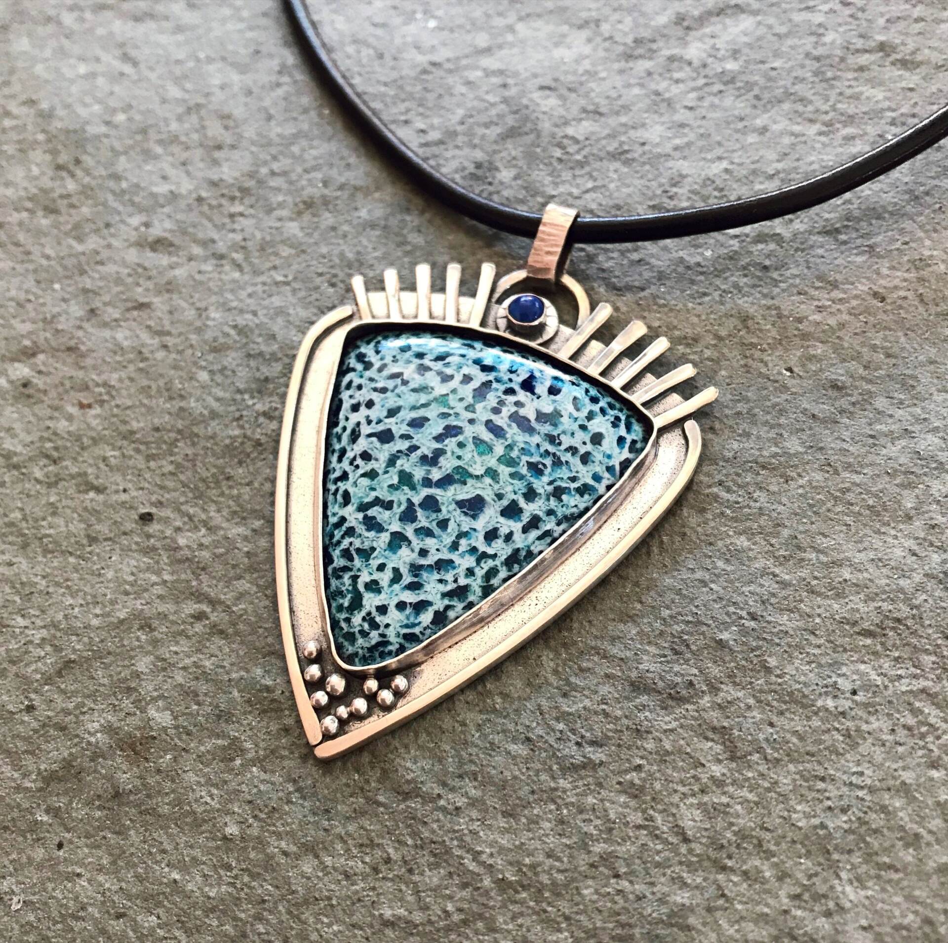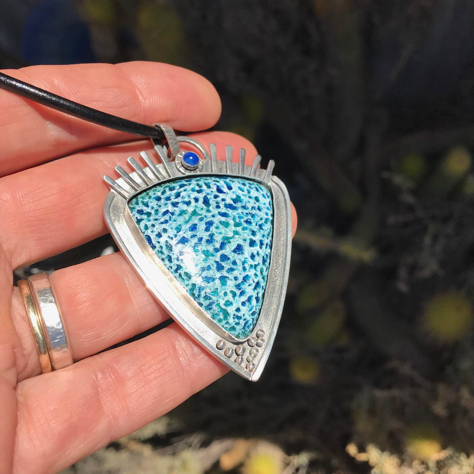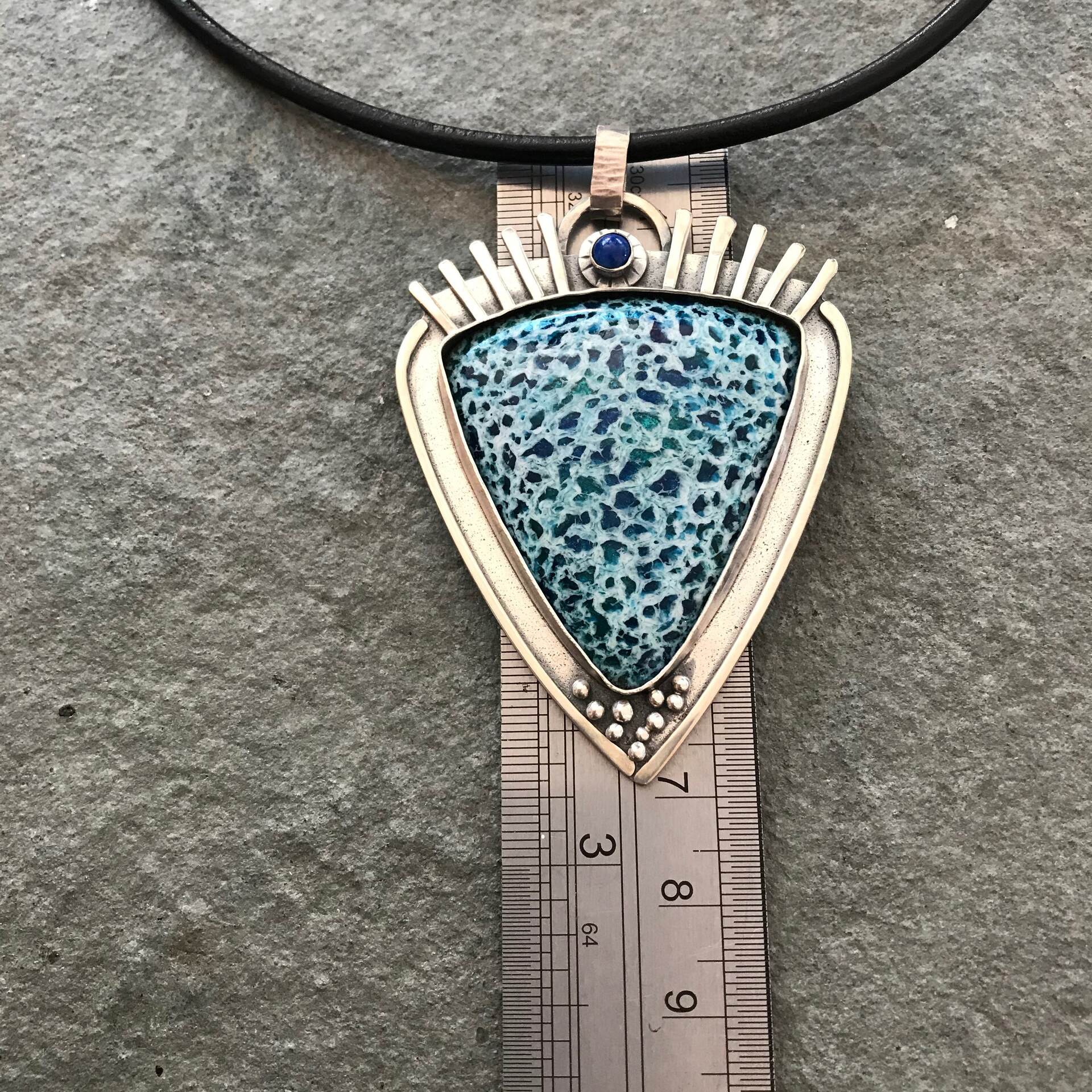 Vitreous enamel on copper, Lapis Lazuli gemstone in hand fabricated Sterling silver setting. Leather & sterling neck cable to requirements or sterling silver chain. Please mention chain or cable size with your purchase. Measurement includes bail at top of pendant for the chain or cable.