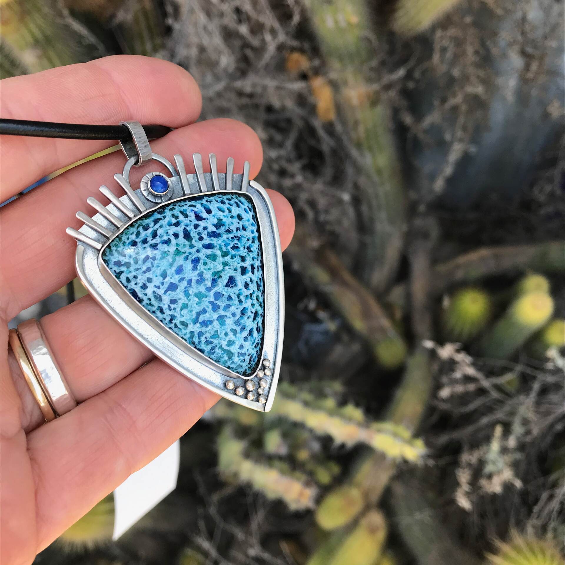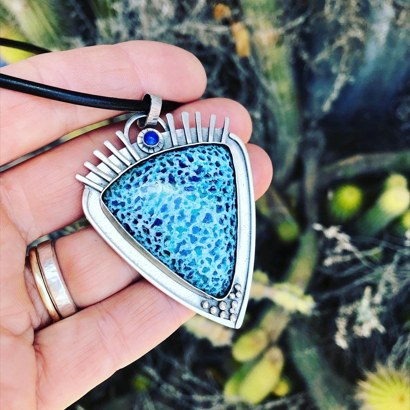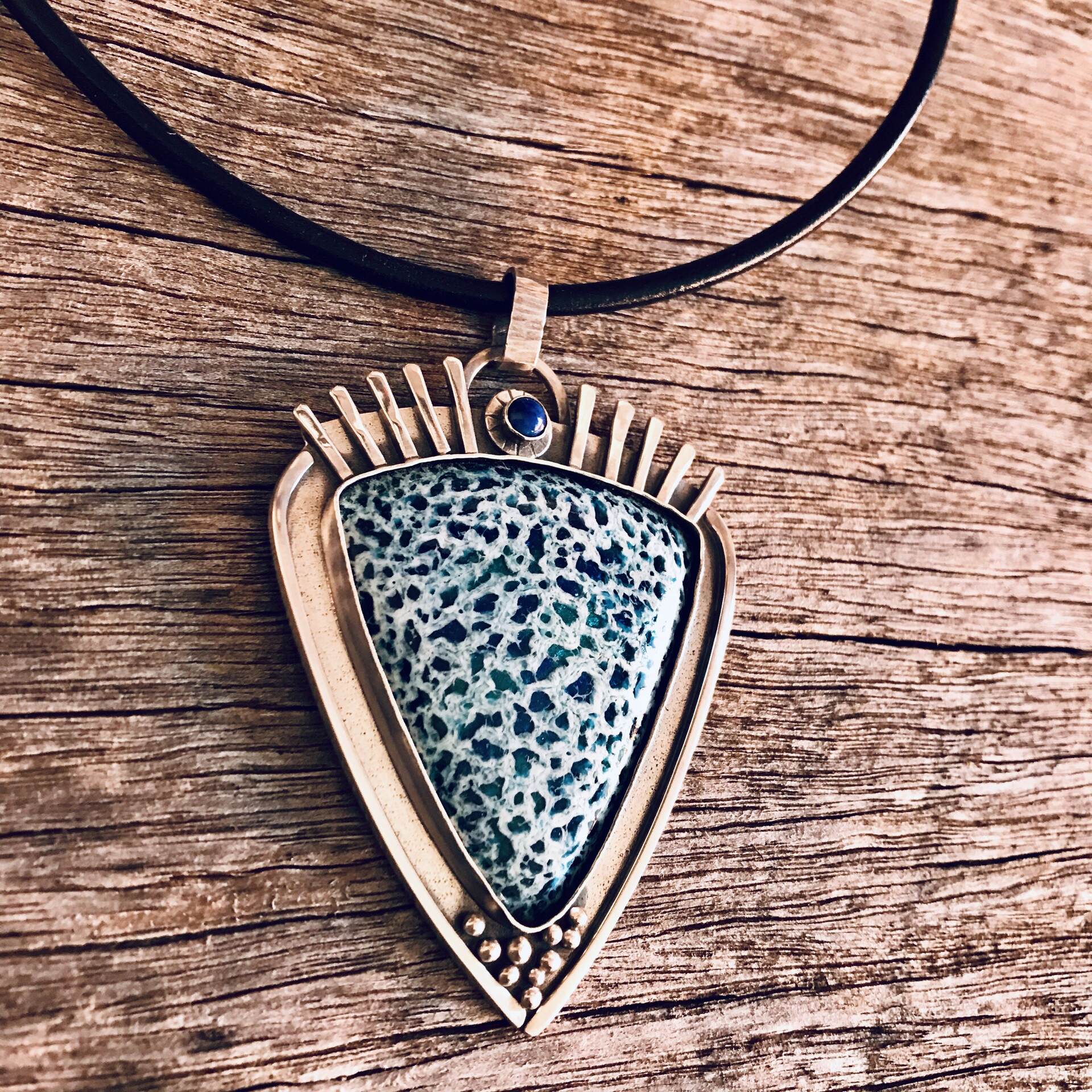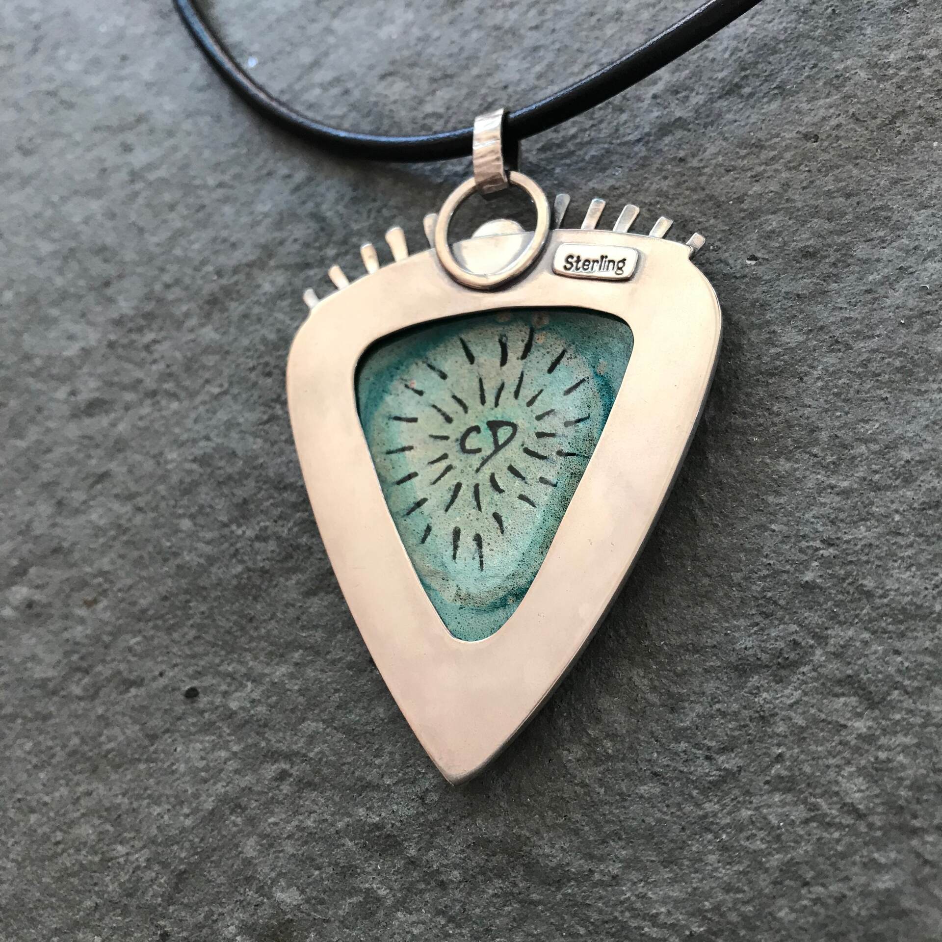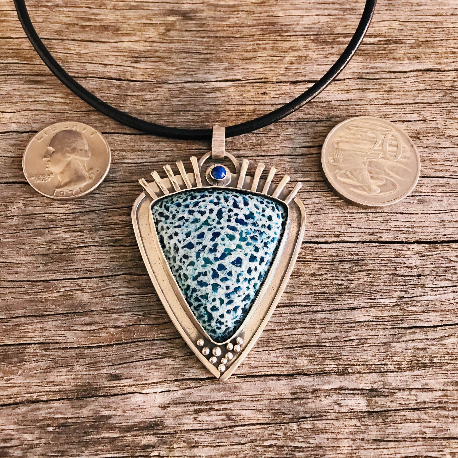 Vitreous enamel on copper, Lapis Lazuli gemstone in hand fabricated Sterling silver setting. Leather & sterling neck cable to requirements or sterling silver chain. Please mention chain or cable size with your purchase. Measurement includes bail at top of pendant for the chain or cable.