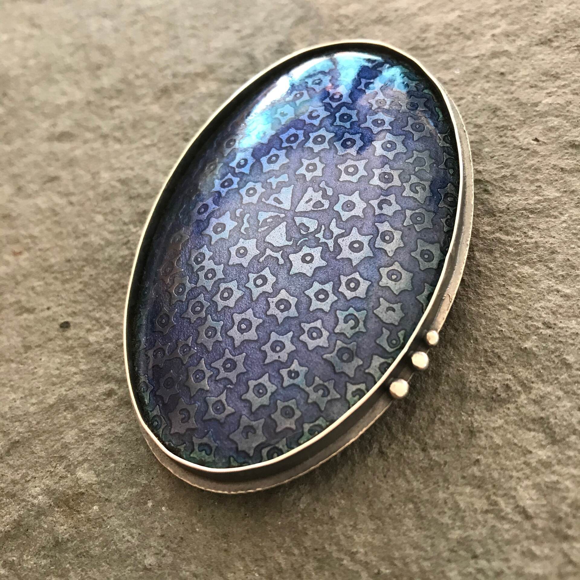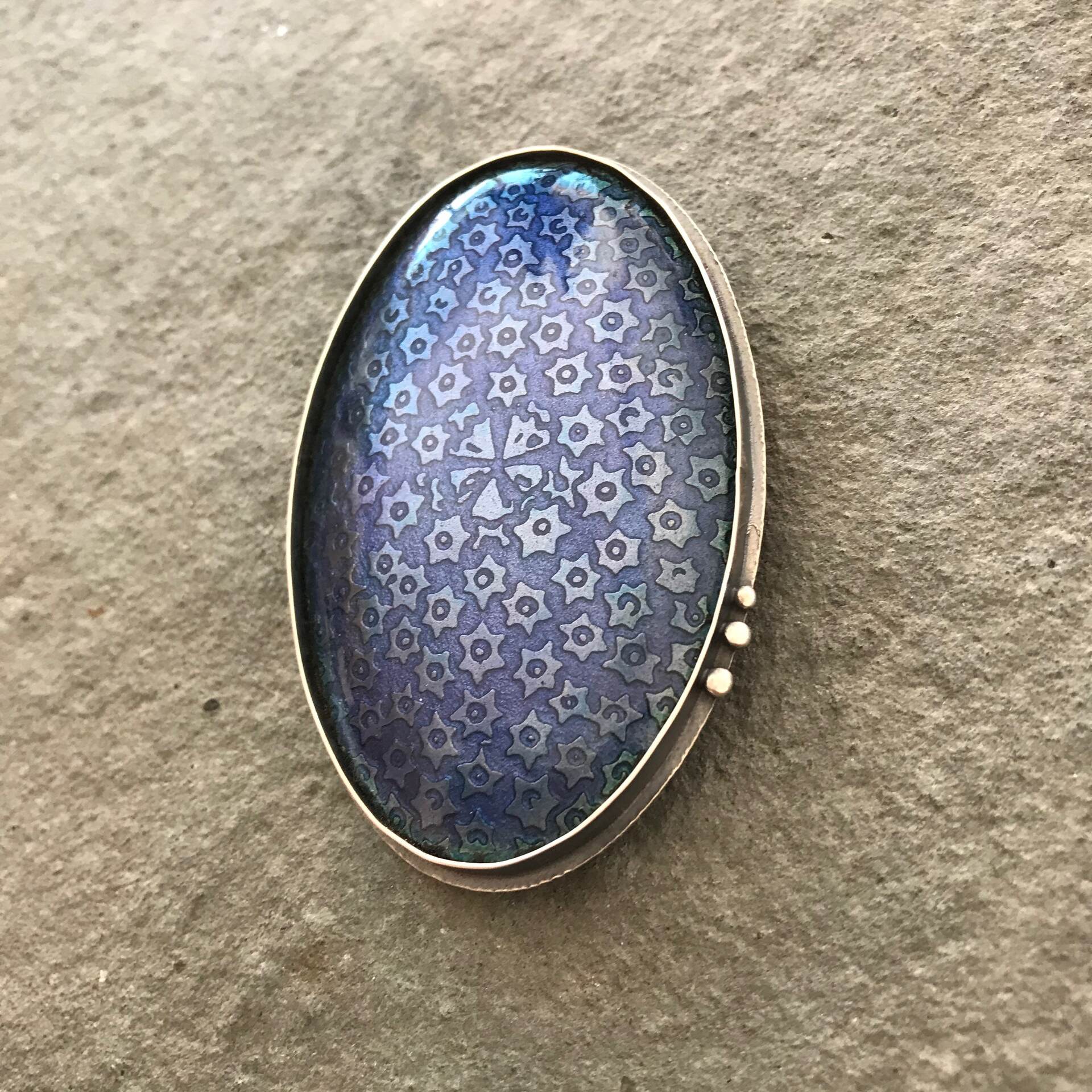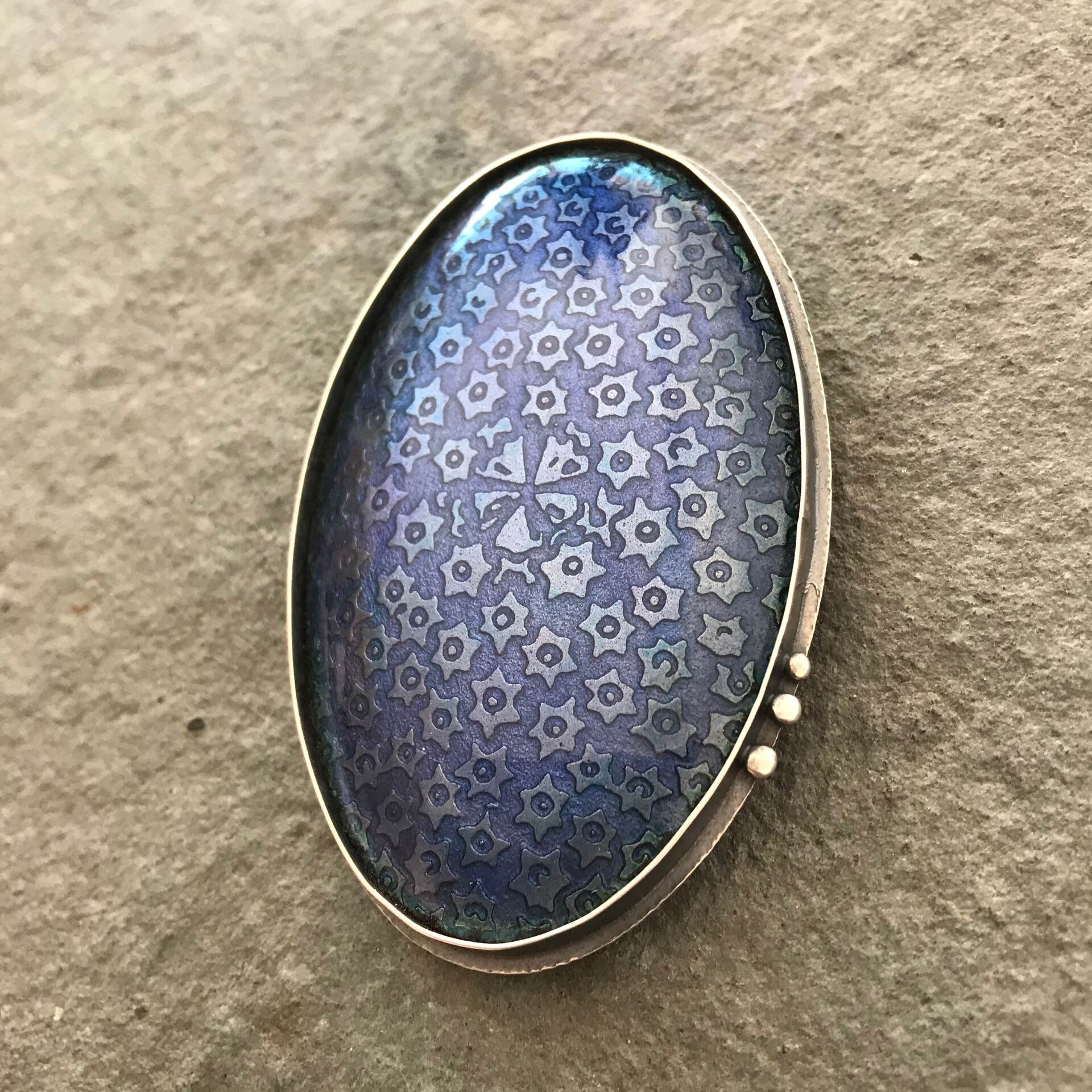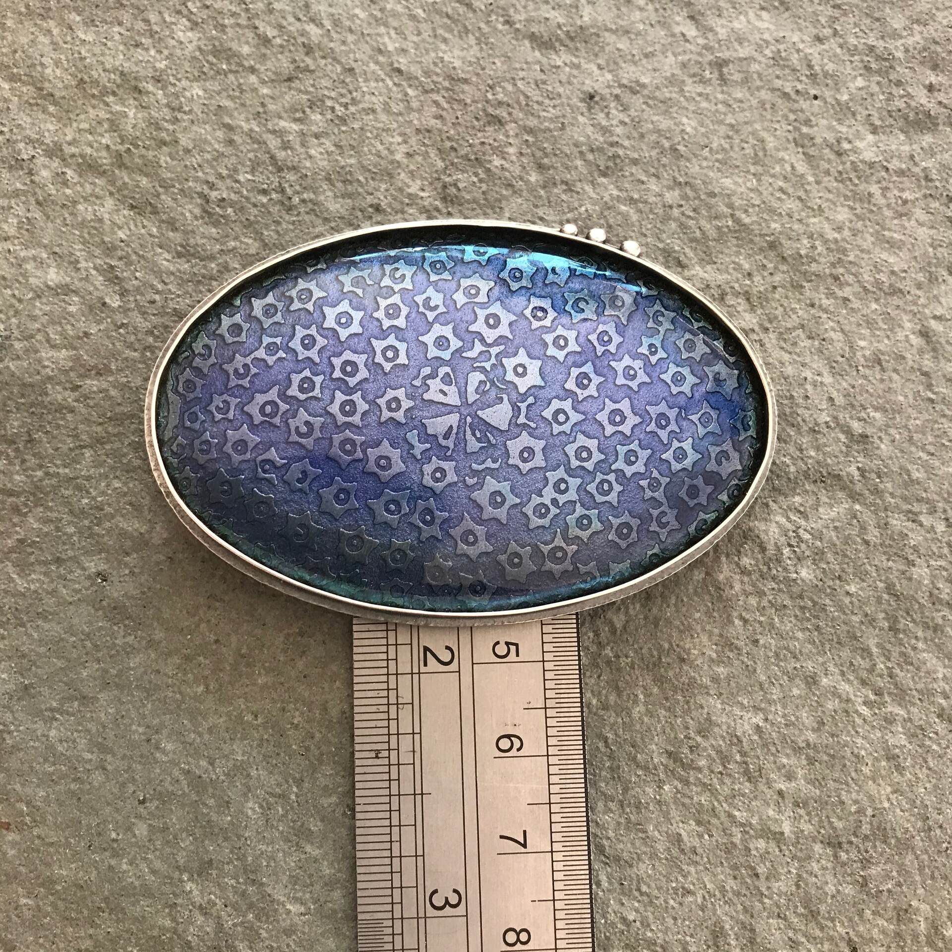 Pale Purple Pendant/Brooch starfish textures; Transparent Vitreous enamel on etched copper set in hand fabricated Sterling Silver setting. Leather & sterling neck cable to requirements or sterling silver chain. Invisible bail at back.