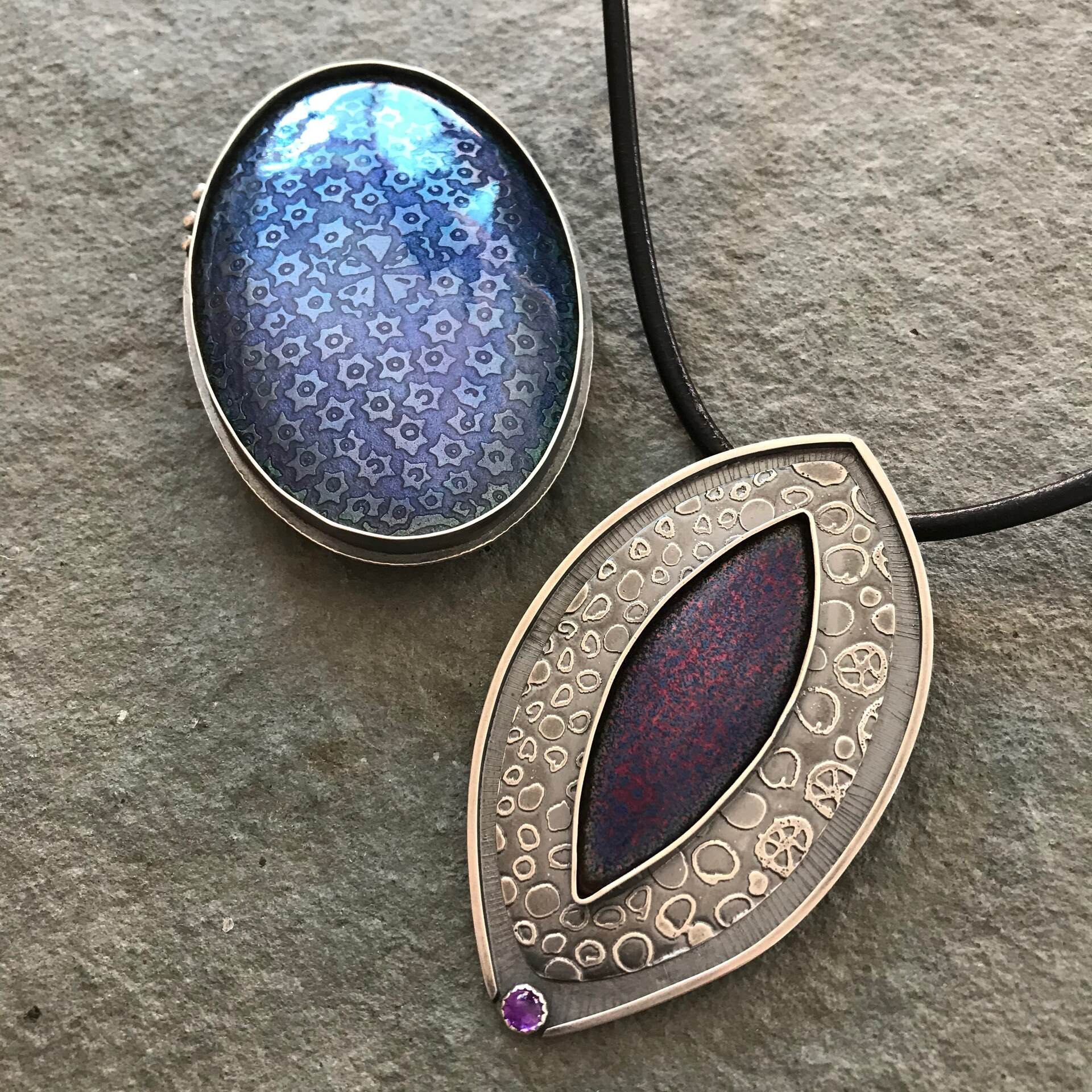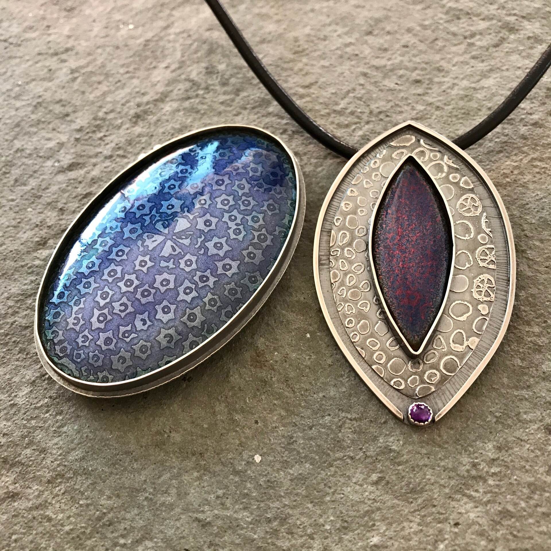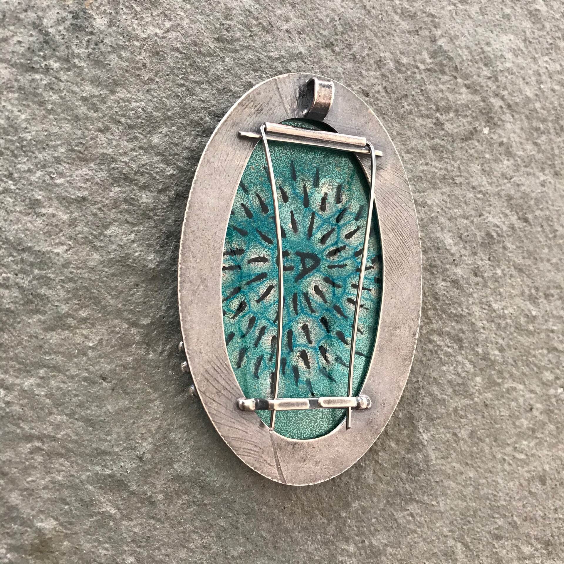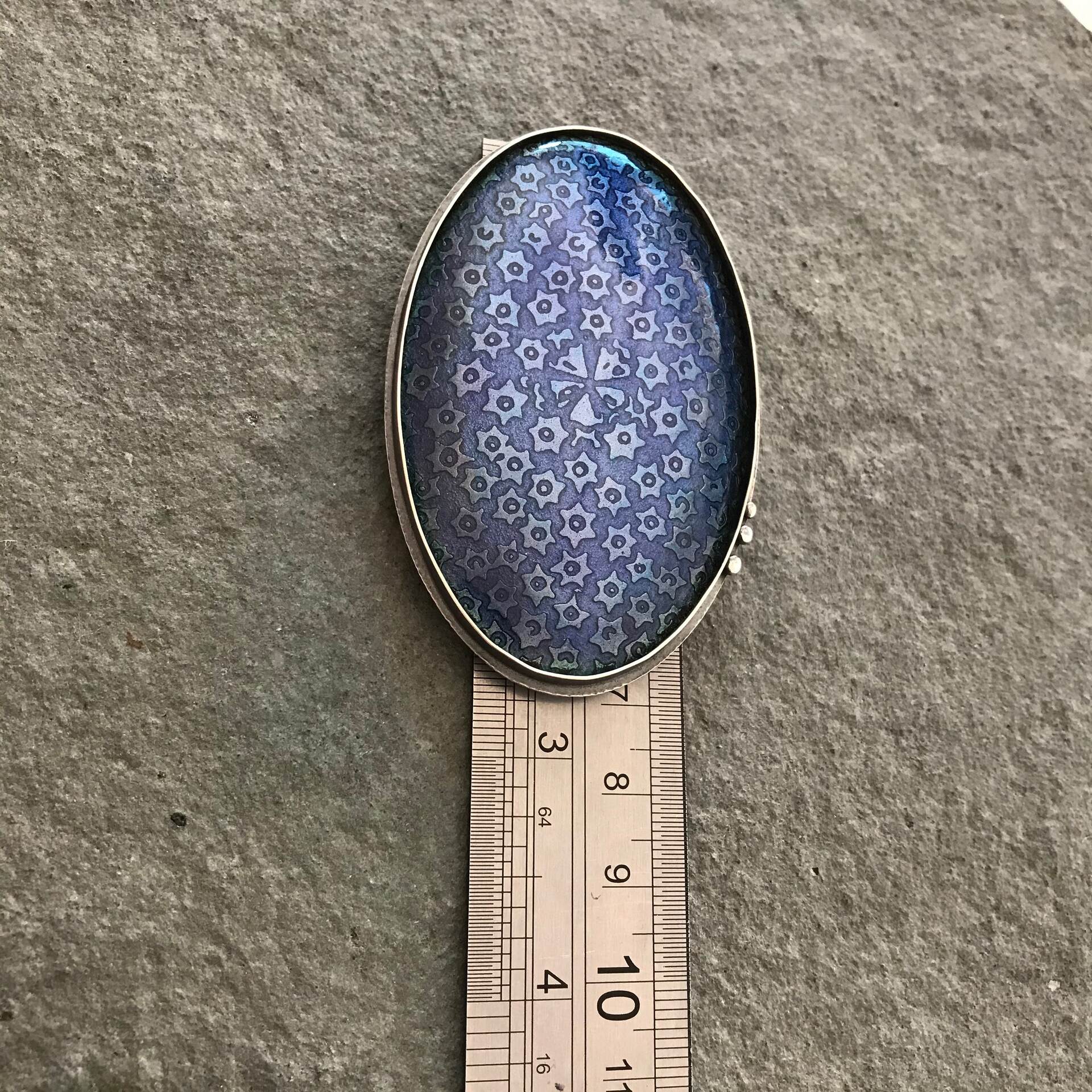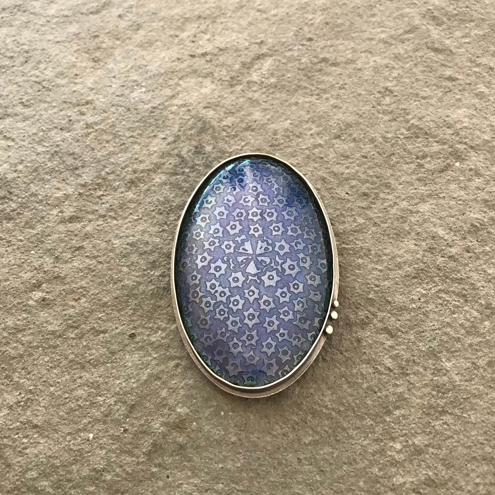Pale Purple Pendant/Brooch starfish textures; Transparent Vitreous enamel on etched copper set in hand fabricated Sterling Silver setting. Leather & sterling neck cable to requirements or sterling silver chain. Invisible bail at back.