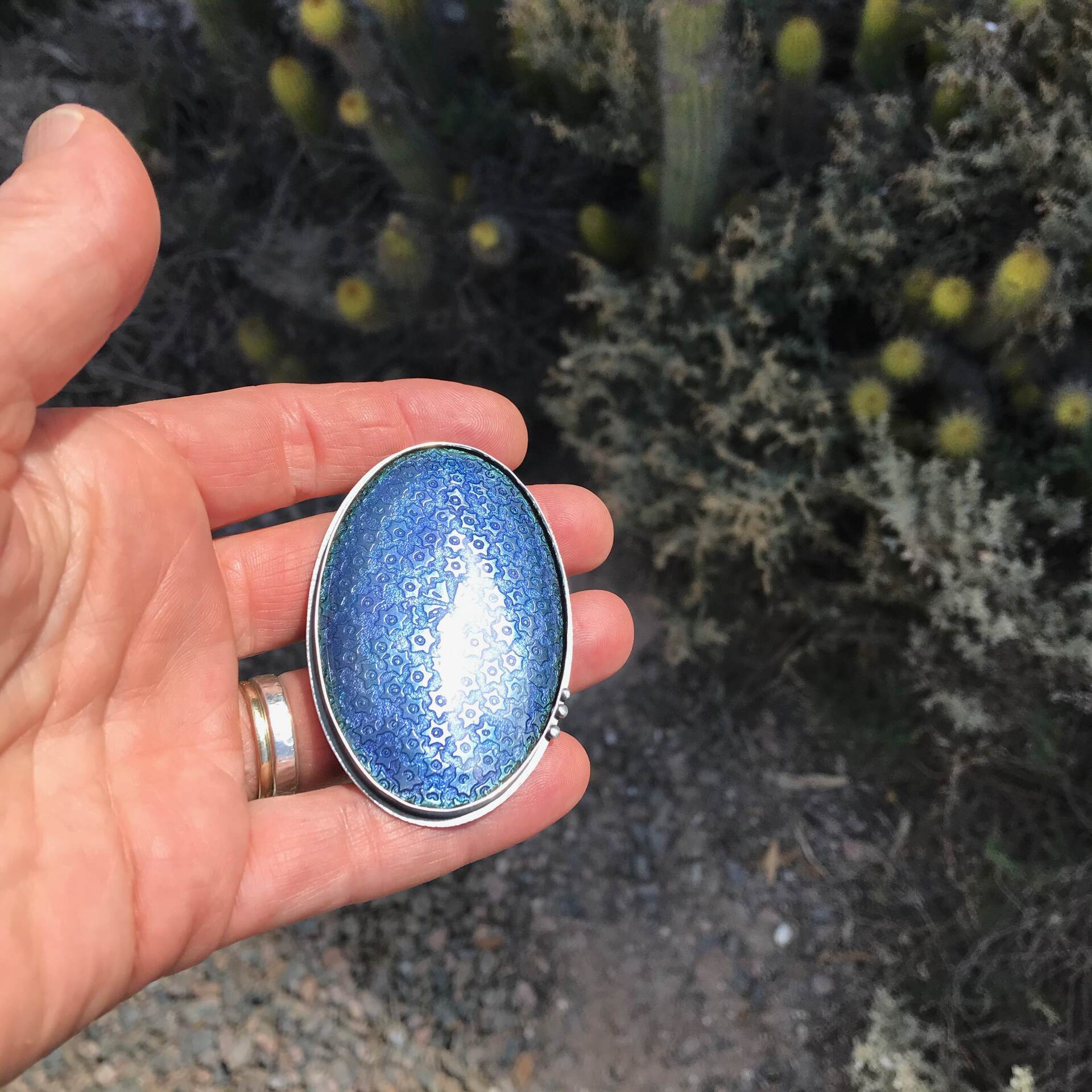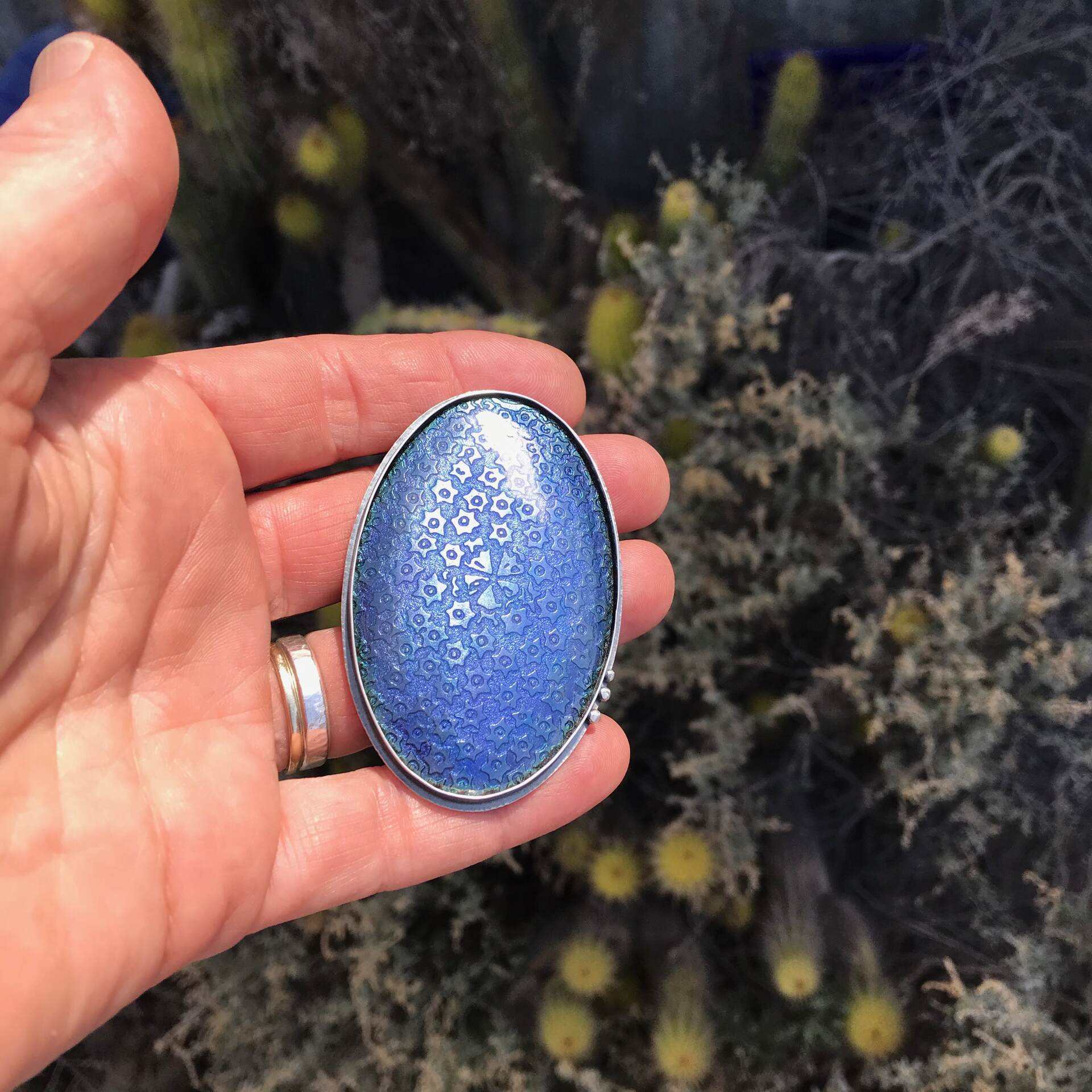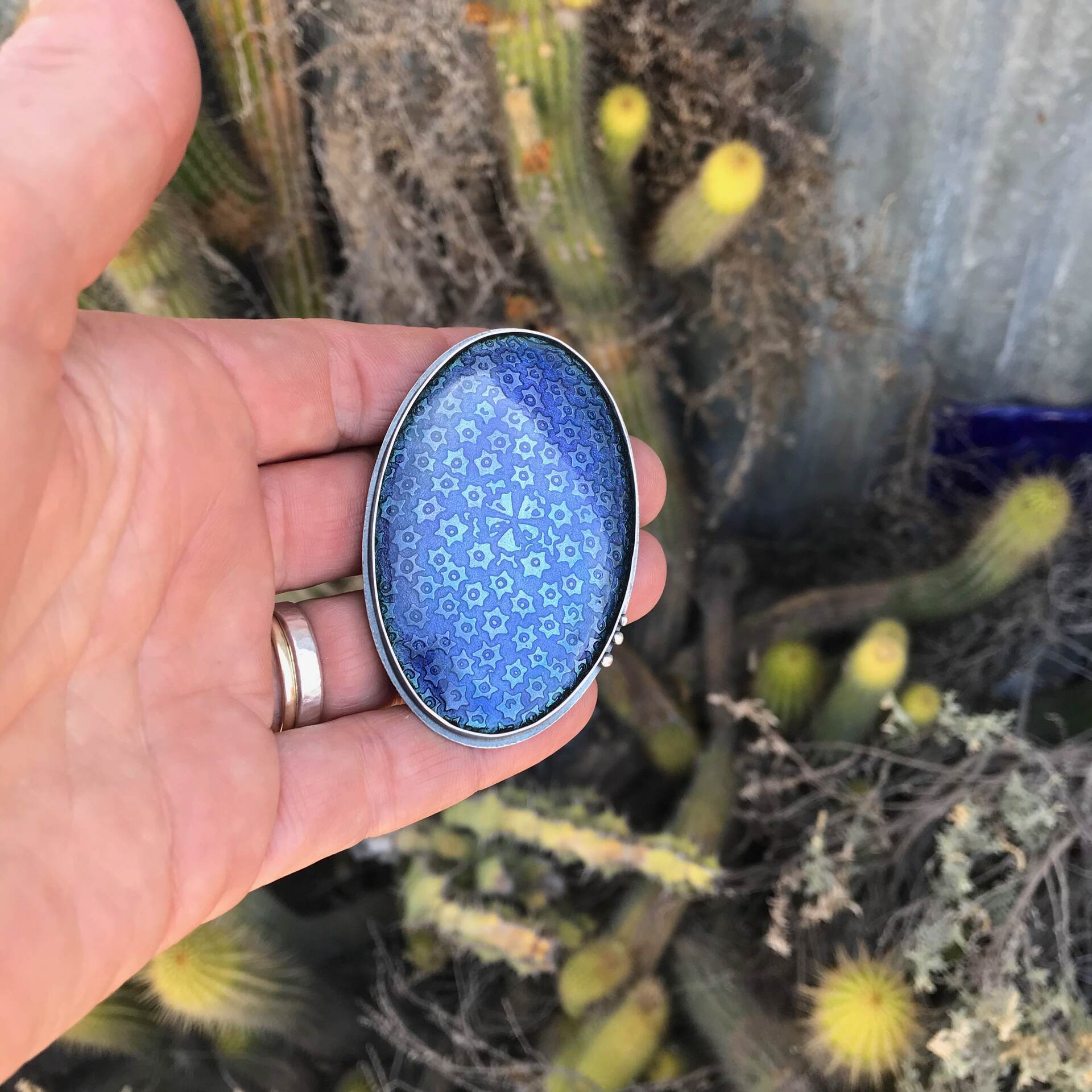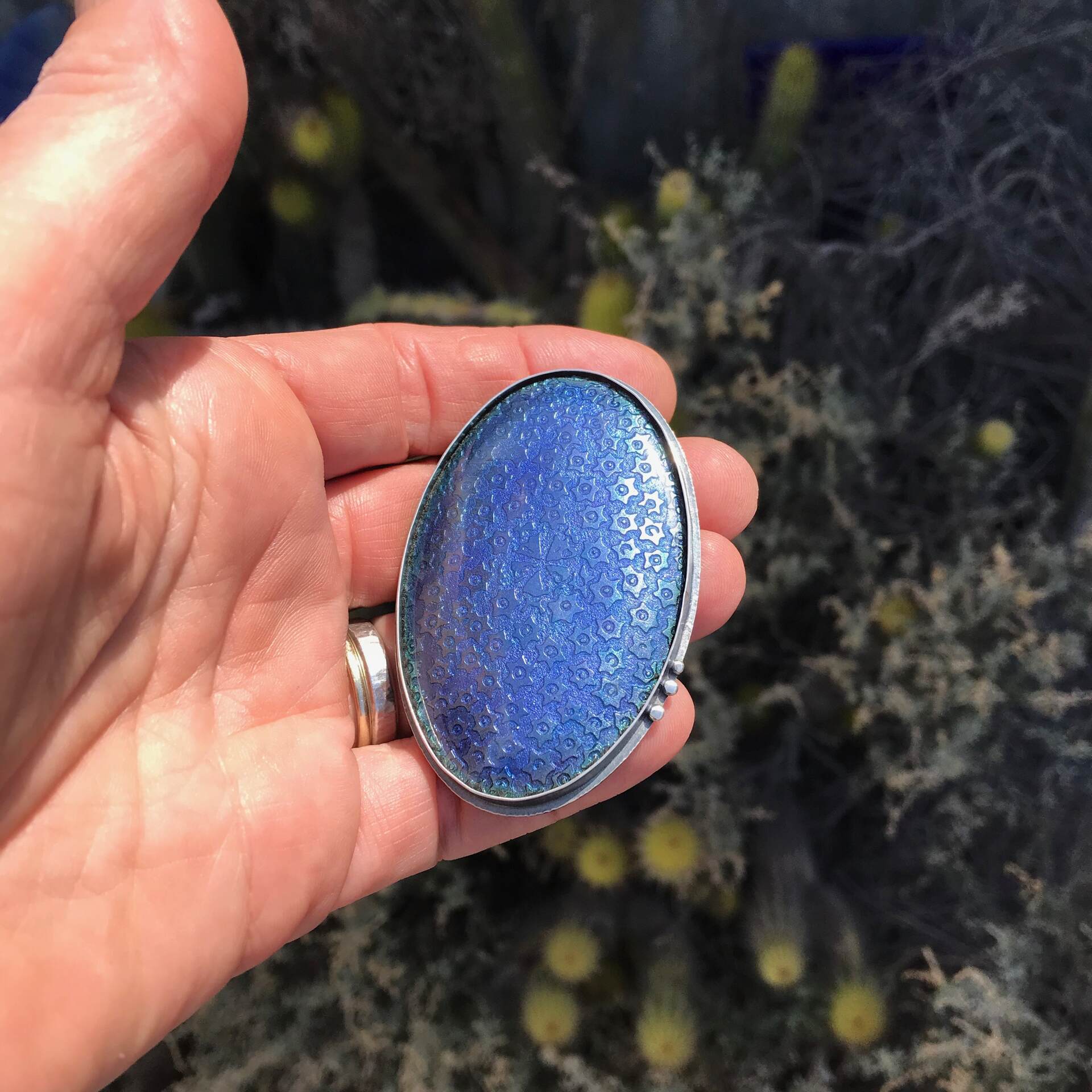 Pale Purple Pendant/Brooch starfish textures; Transparent Vitreous enamel on etched copper set in hand fabricated Sterling Silver setting. Leather & sterling neck cable to requirements or sterling silver chain. Invisible bail at back.