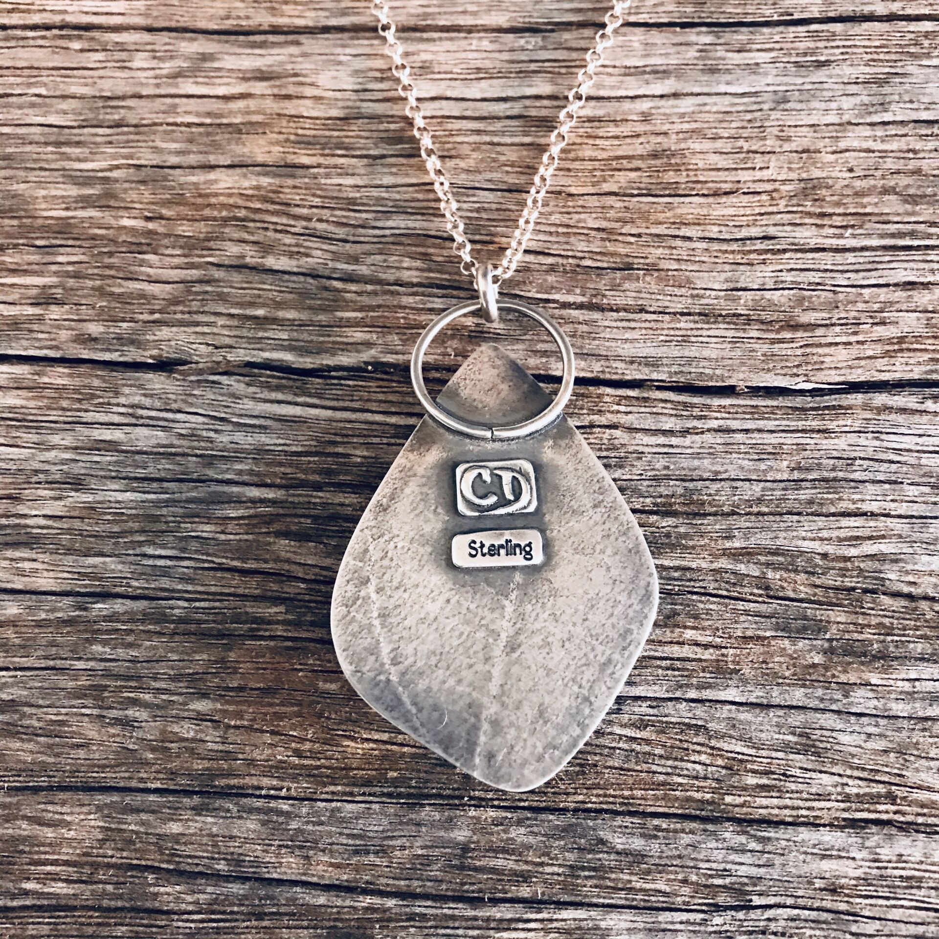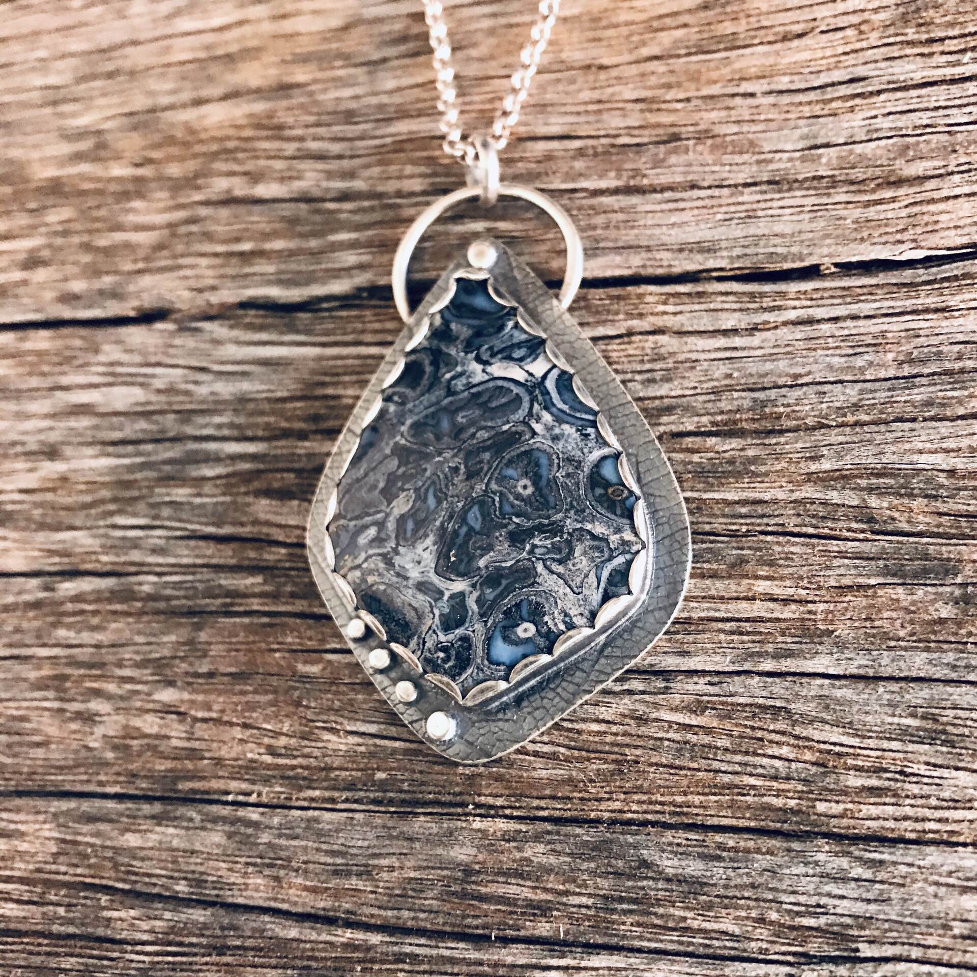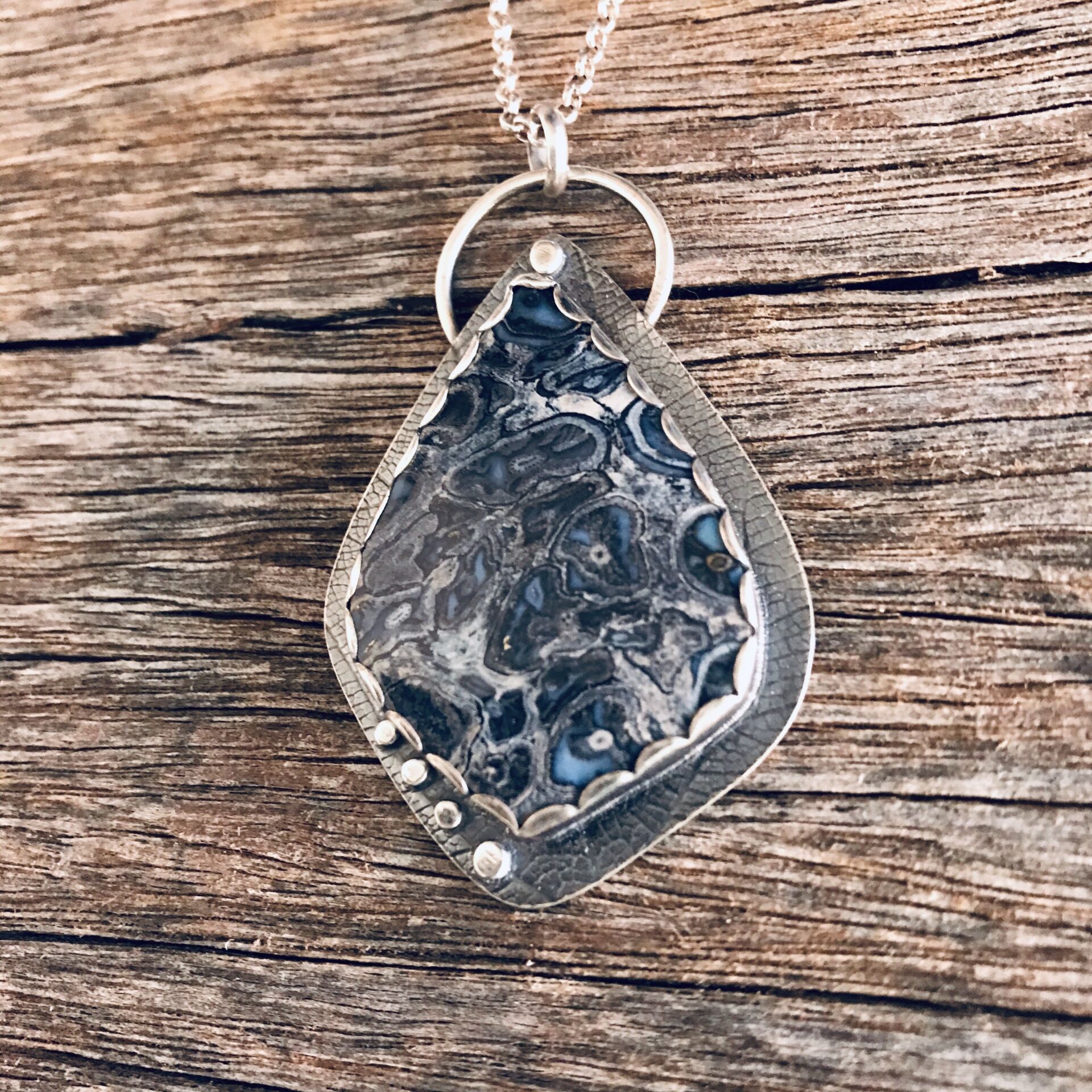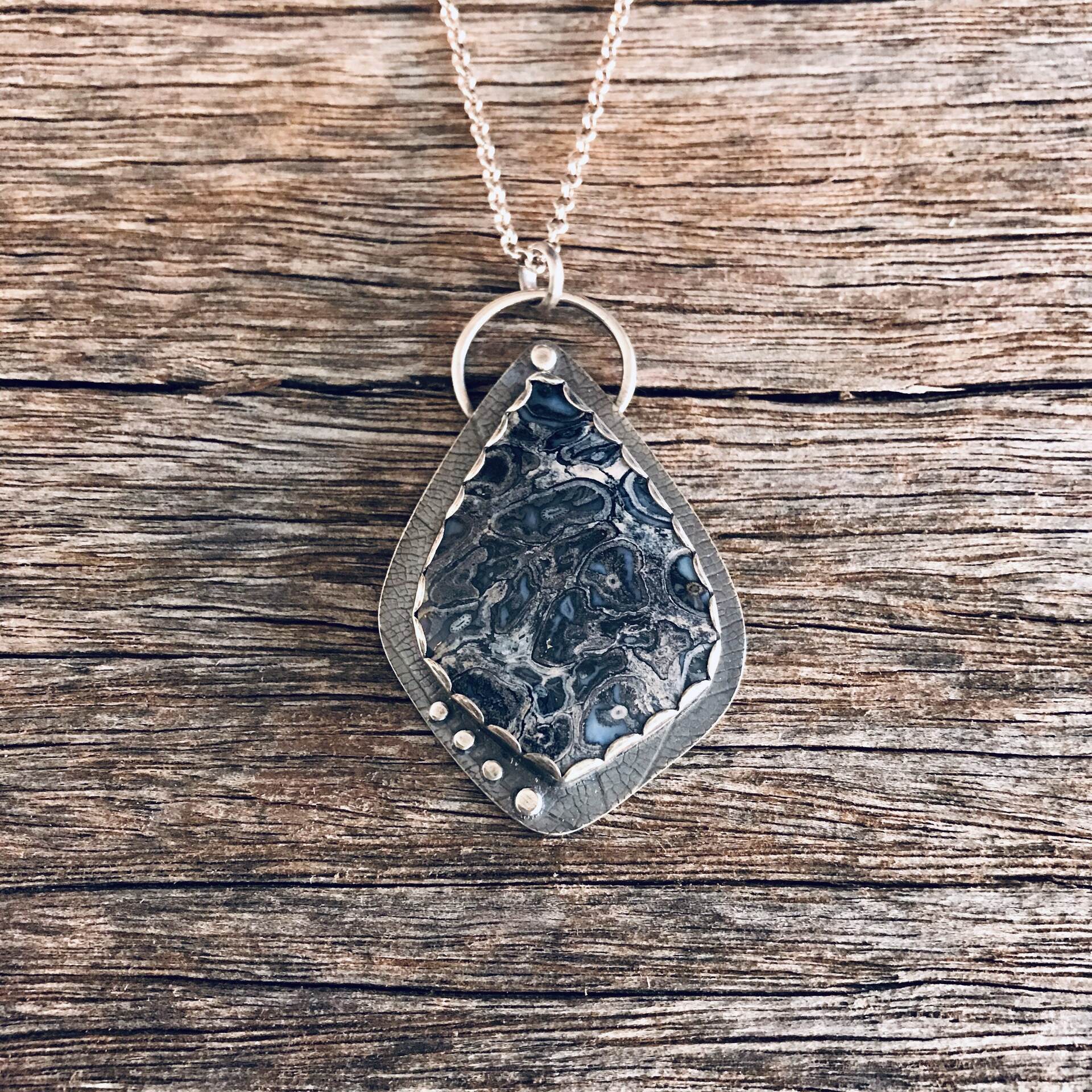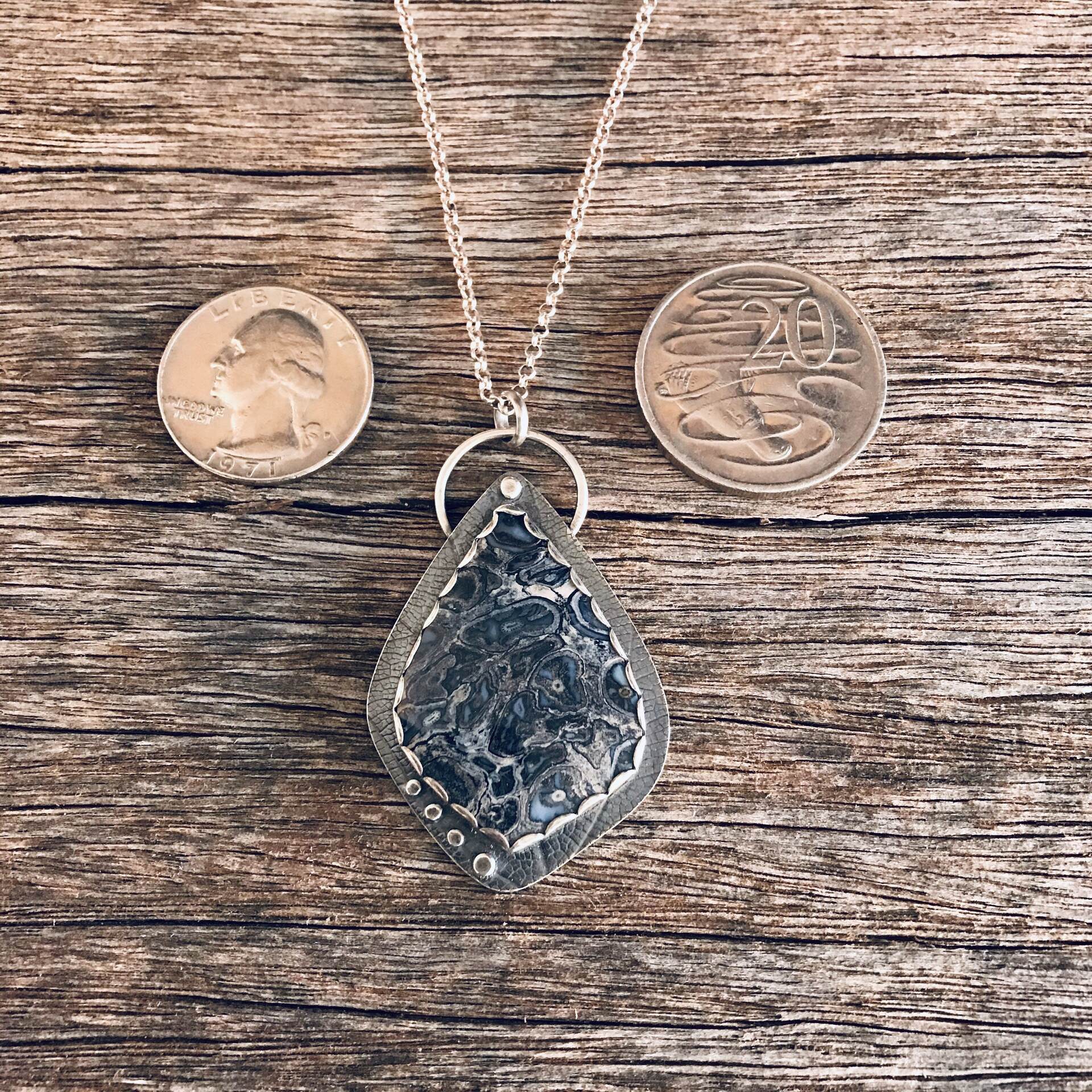 Petrified Palm Root set in hand fabricated Sterling Silver setting. Sterling Silver chain to your requirements. Please mention your preferred chain length with your purchase. This is a gorgeous stone with subtle grey and blue tones. Very unique. Measurement includes a soldered jump ring for the chain.