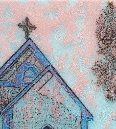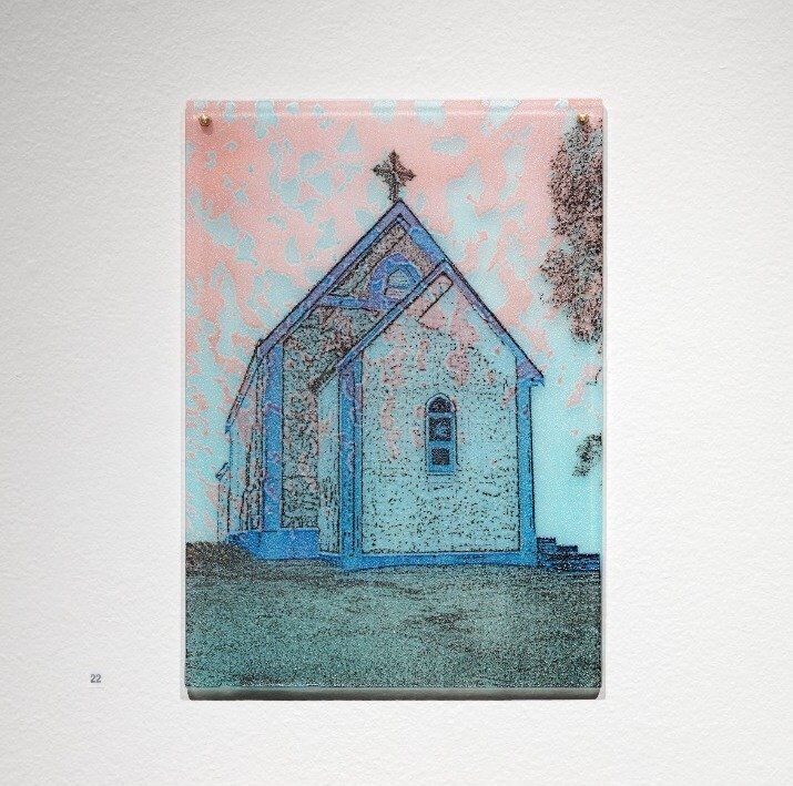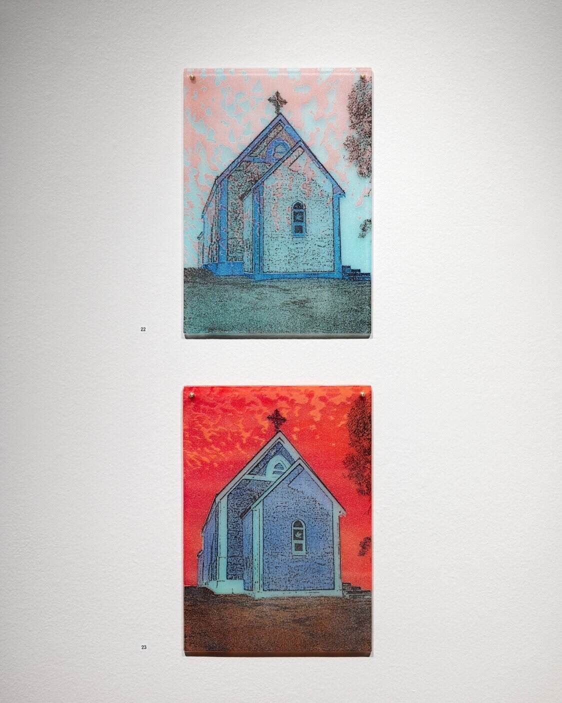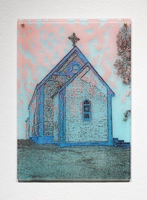 'Place of Worship' - Dawn sky. Glass; kiln-formed, textural printed. These are very textural prints. This is a single piece of glass which measures 287mm W x 407mm H x 5mm thick. Wall fittings included.