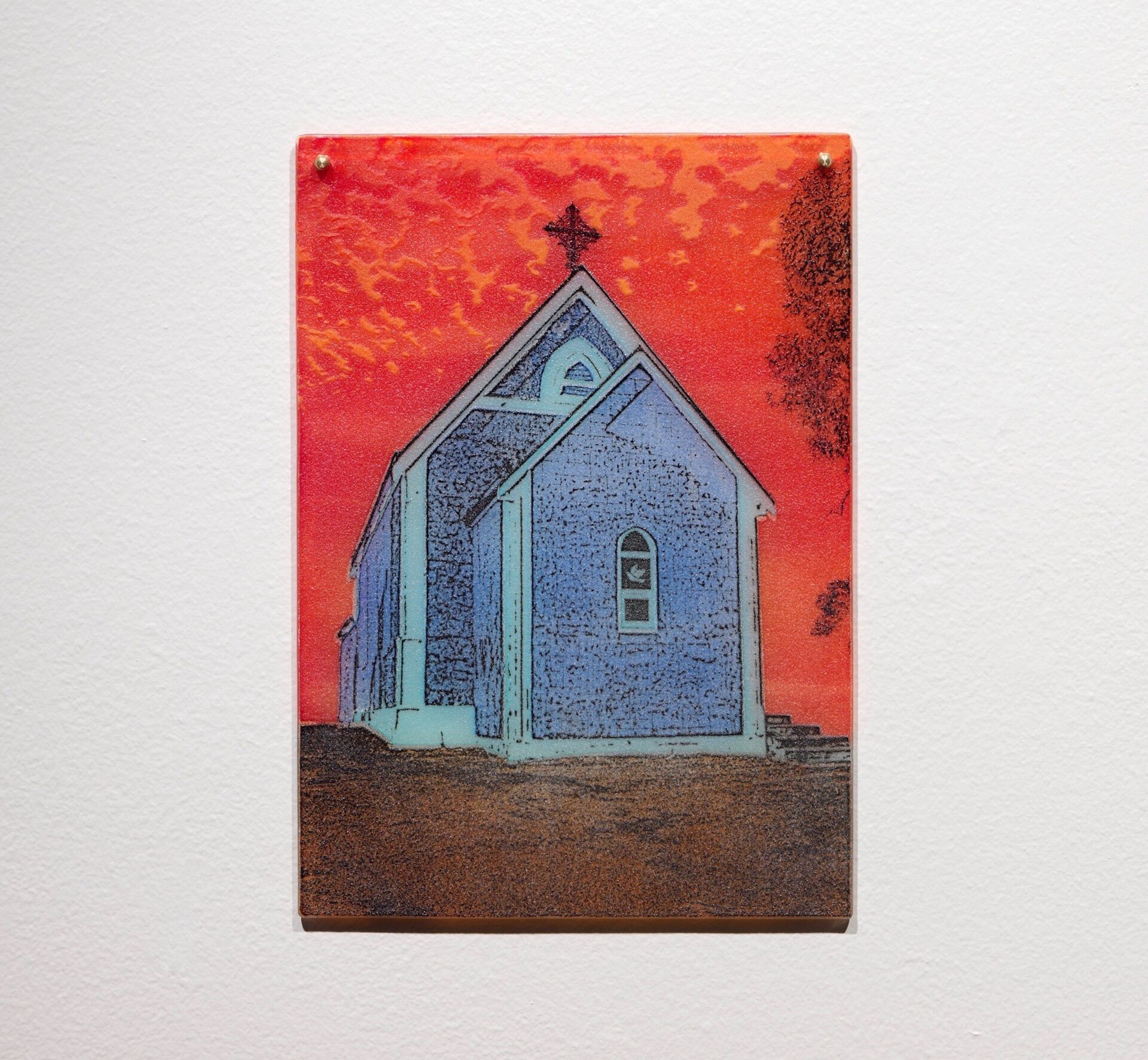 'Place of Worship' - red sky. Glass; kiln-formed, textural printed. These are very textural prints. This is a single piece of glass which measures 287mm W x 407mm H x 5mm thick. Wall fittings included.