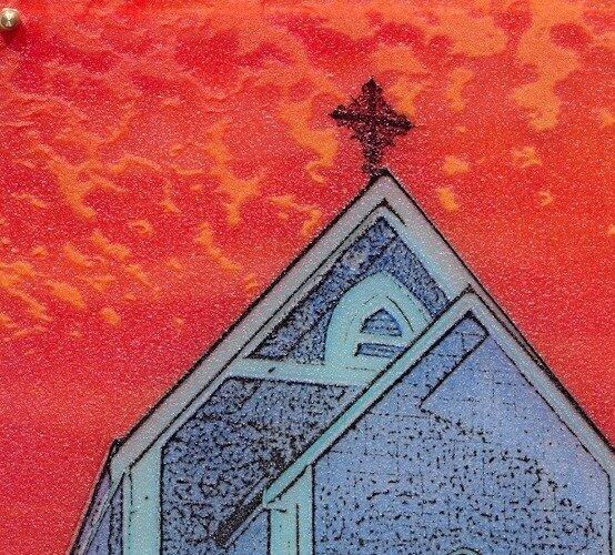 'Place of Worship' - red sky. Glass; kiln-formed, textural printed. These are very textural prints. This is a single piece of glass which measures 287mm W x 407mm H x 5mm thick. Wall fittings included.