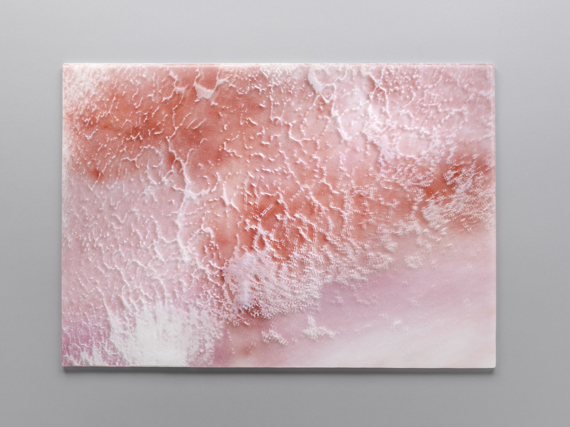 'Salt 3'; Kiln-formed textural print on glass. 1 piece of glass each measuring; 505mm x 710 mm x 8-9mm thick. This is a recent piece from my exhibition Layers. A series of three pieces of very textural glass inspired by the pink salt lake near my home. It can be hung either horizontally of vertically. Wall fittings to hang the glass are included.