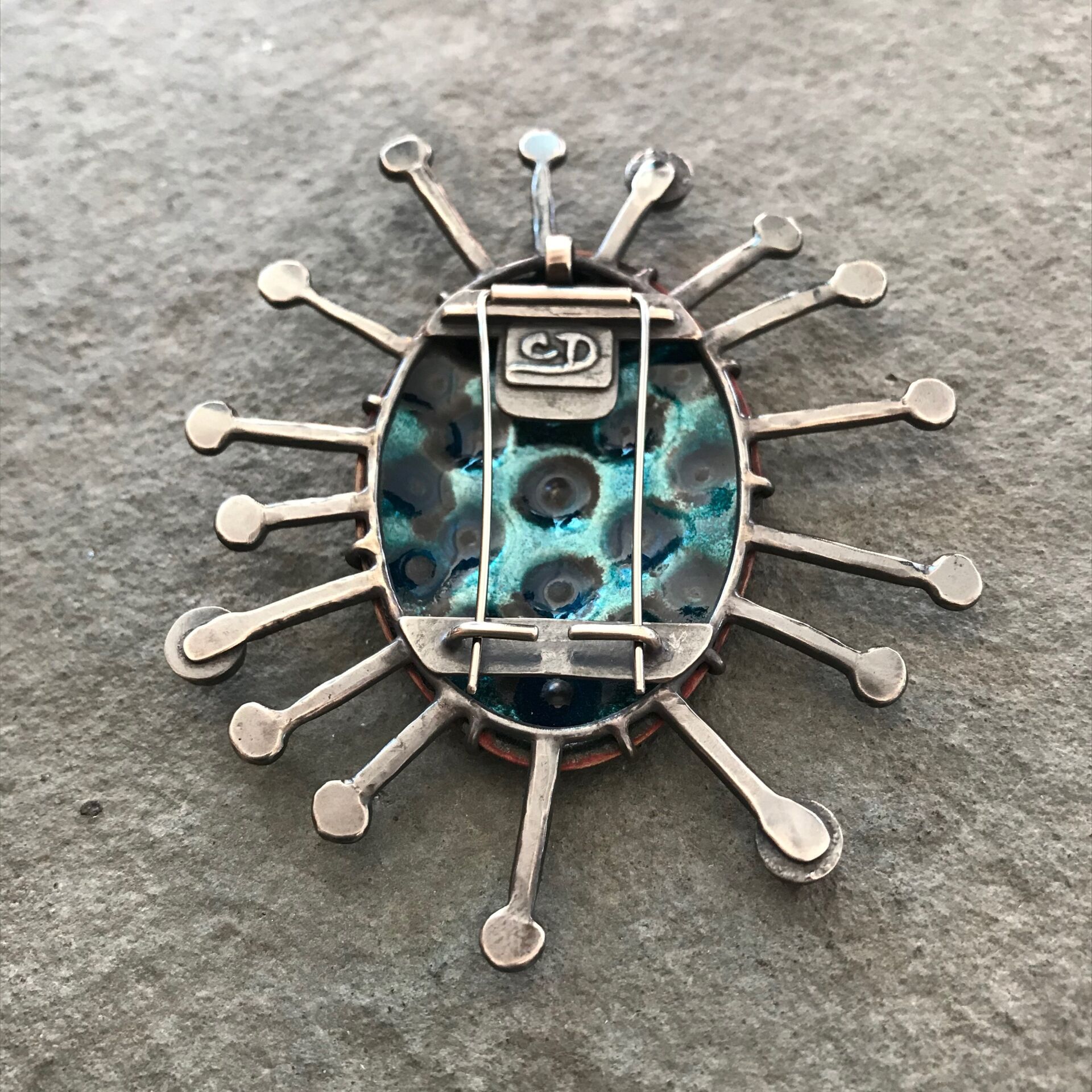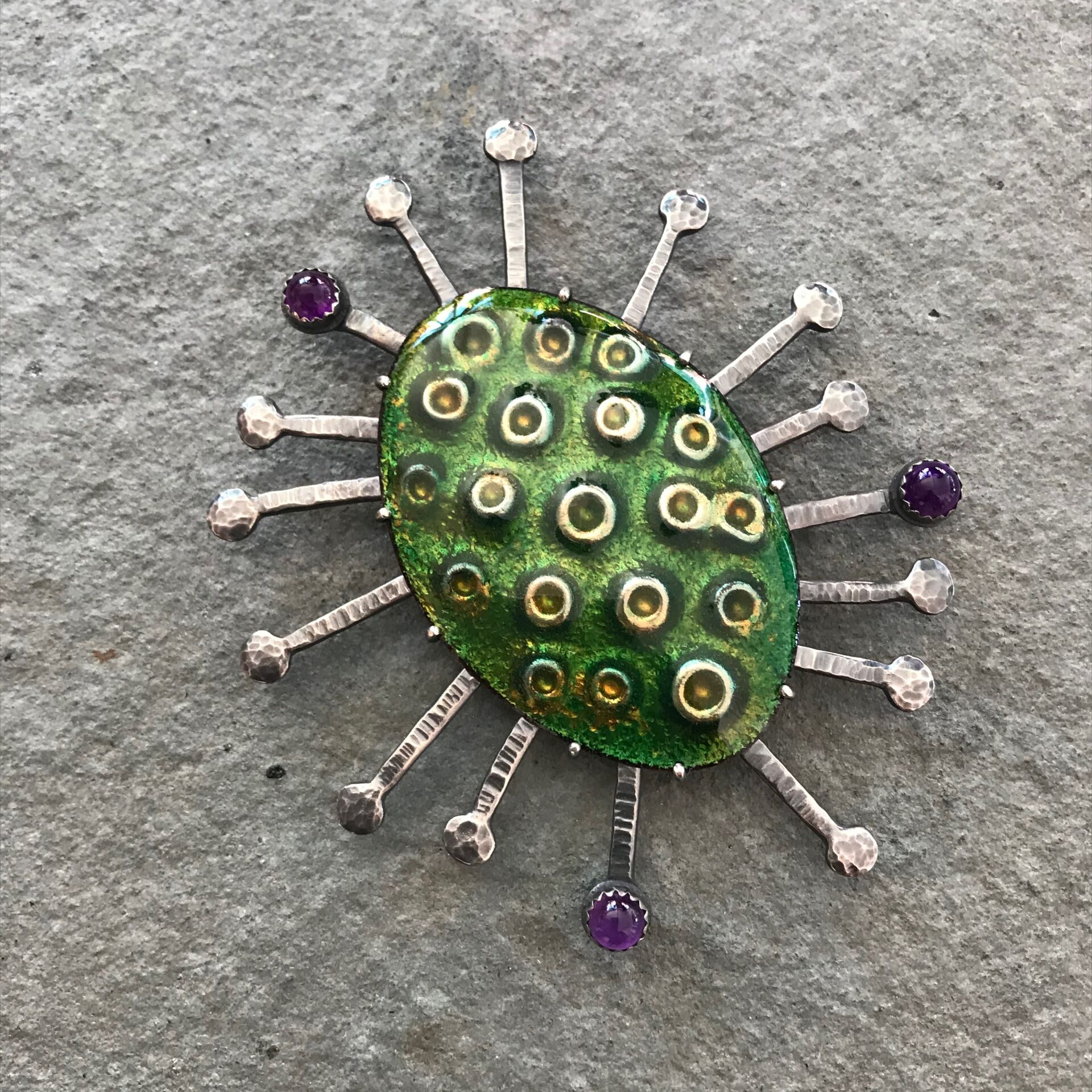 Transparent Vitreous enamel on coper, Amethyst gemstones and sterling silver. Stainless steel pin stems. Leather & sterling neck cable to requirements or sterling silver chain. Invisible bail at back.