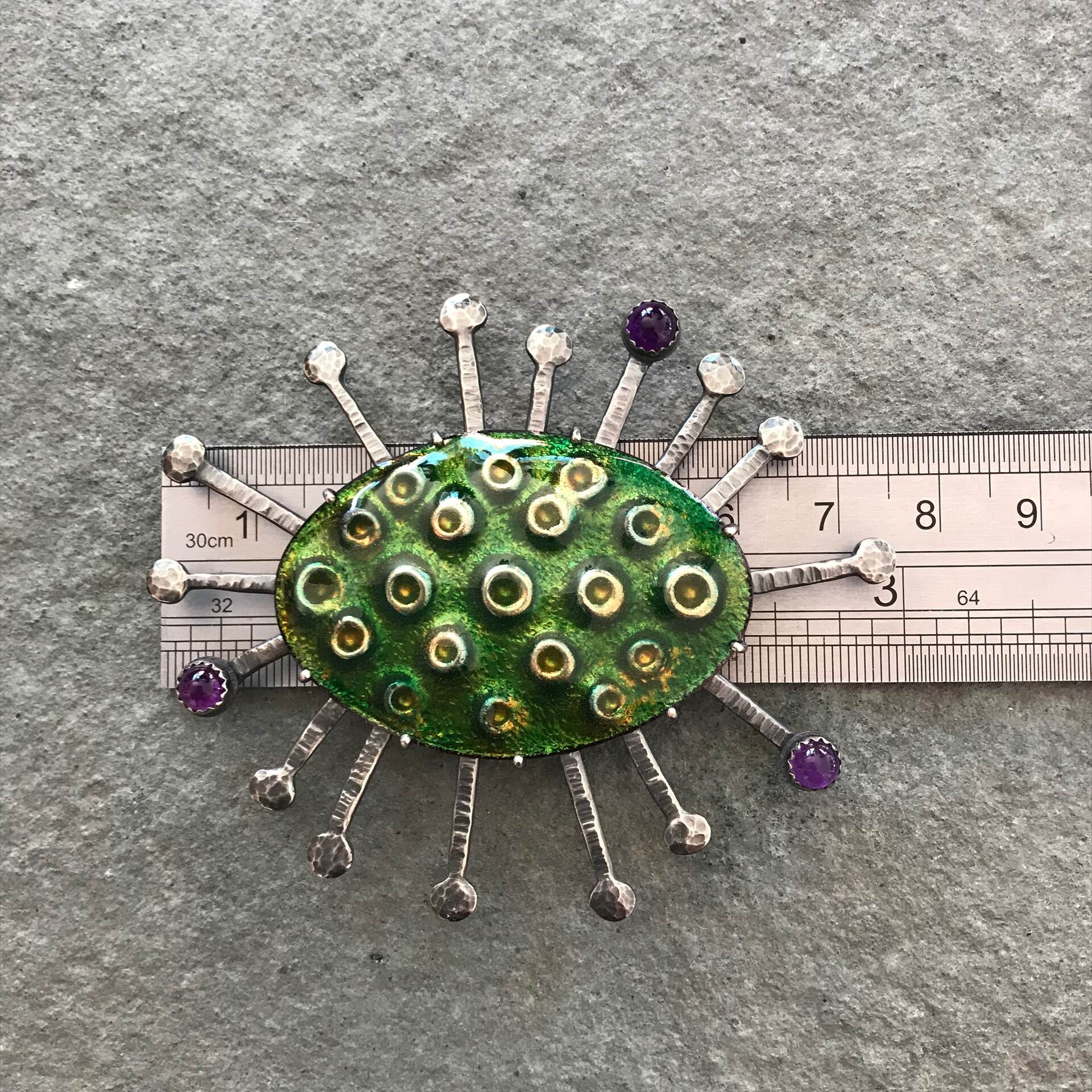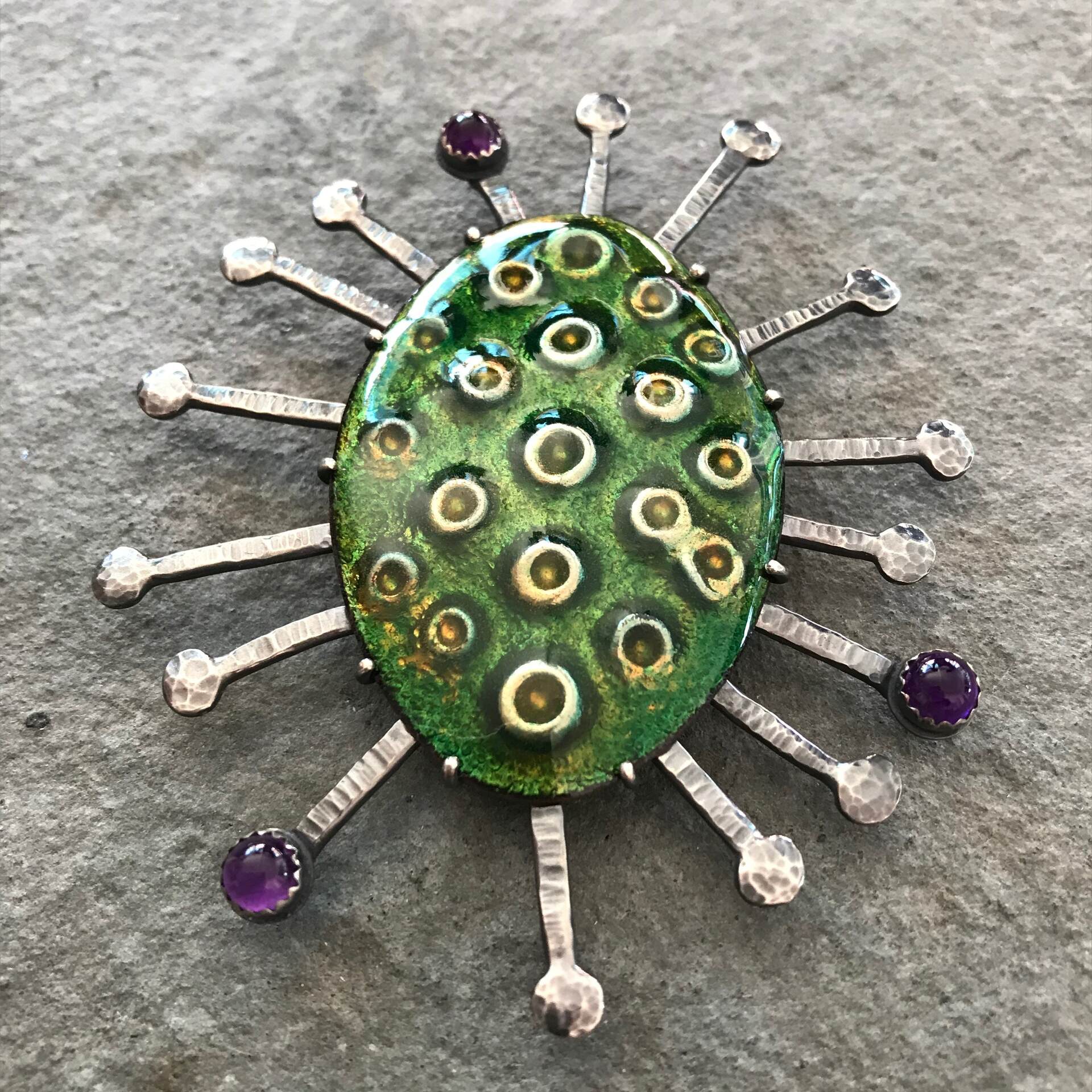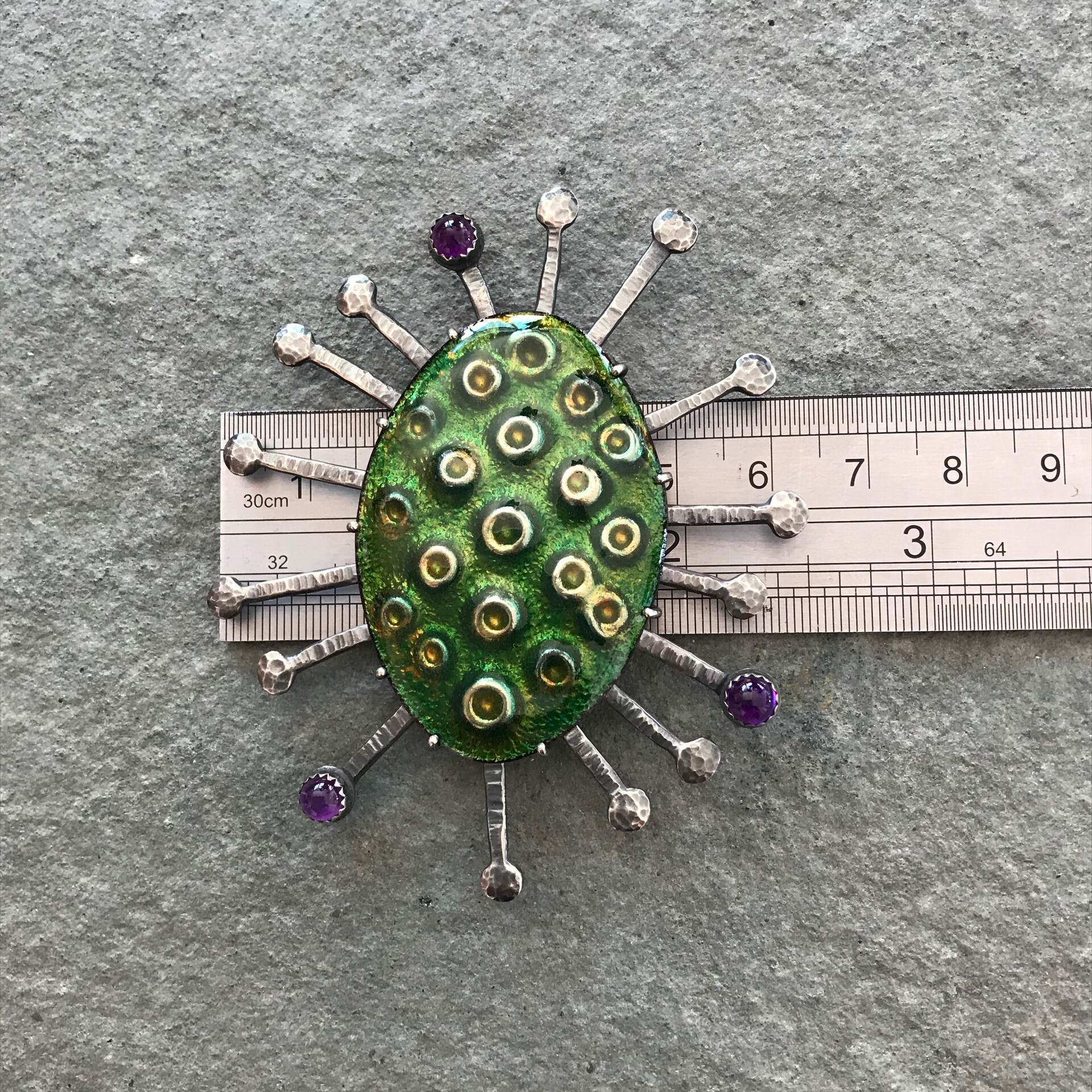 Transparent Vitreous enamel on coper, Amethyst gemstones and sterling silver. Stainless steel pin stems. Leather & sterling neck cable to requirements or sterling silver chain. Invisible bail at back.