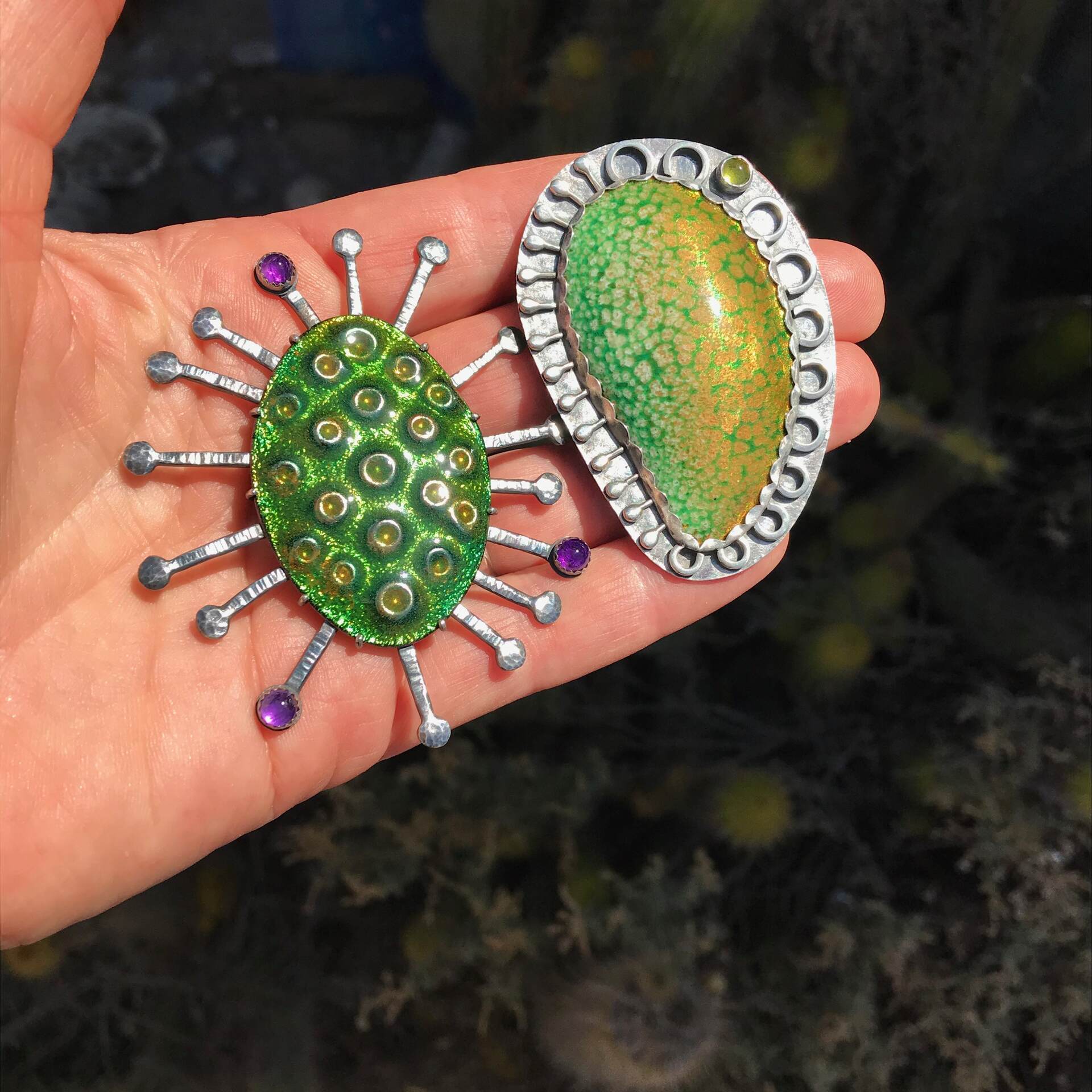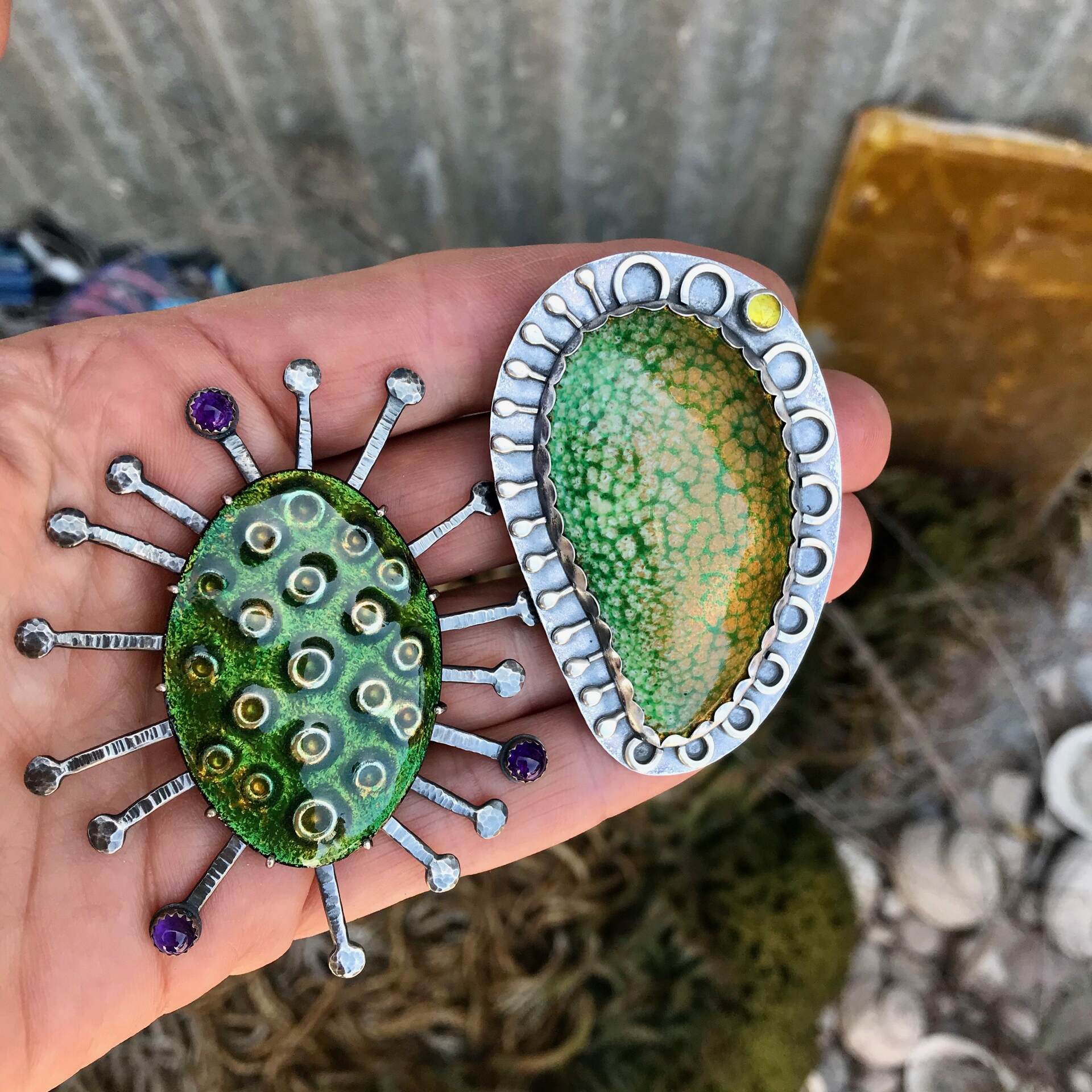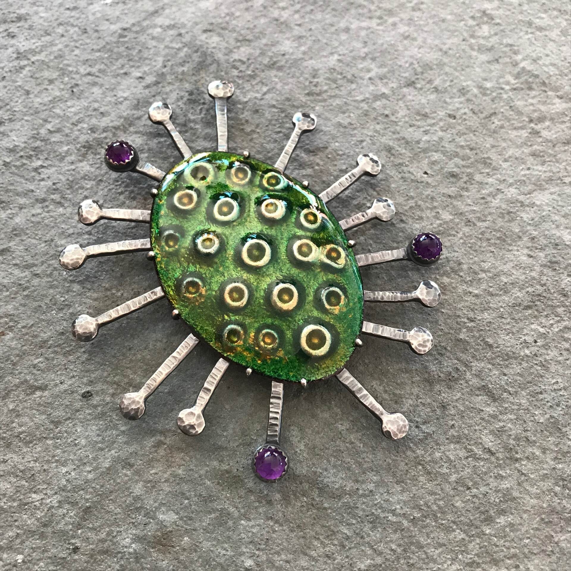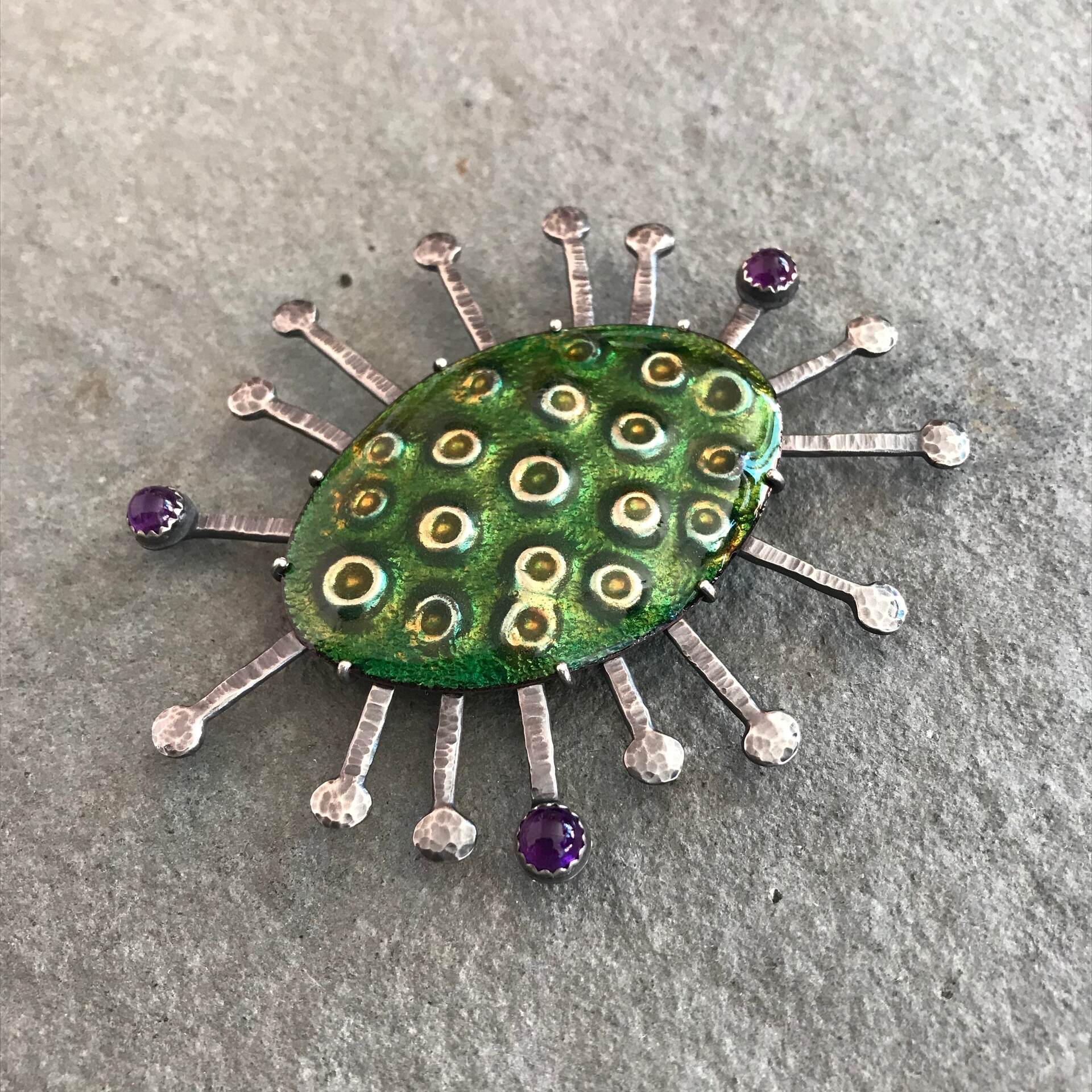 Transparent Vitreous enamel on coper, Amethyst gemstones and sterling silver. Stainless steel pin stems. Leather & sterling neck cable to requirements or sterling silver chain. Invisible bail at back.