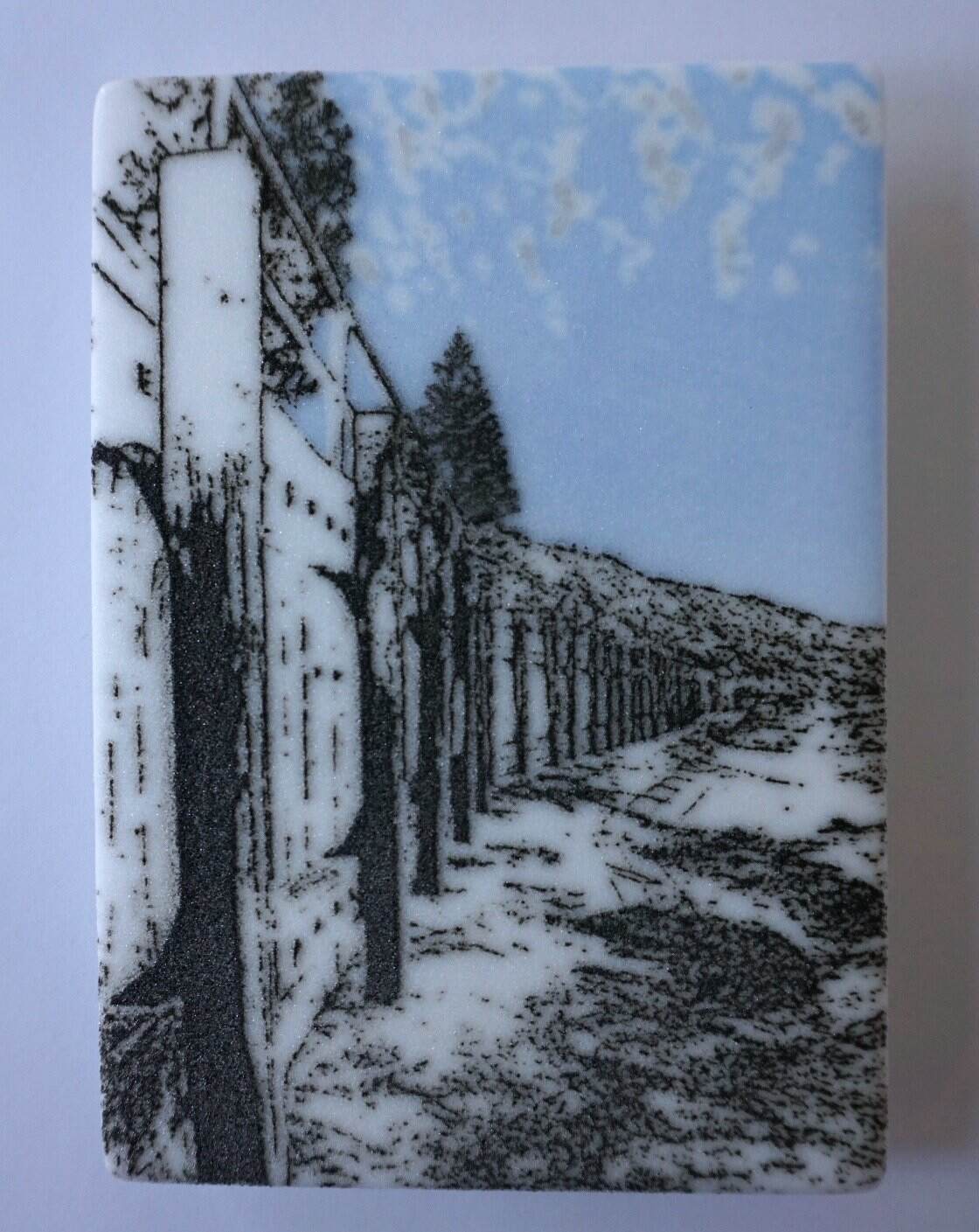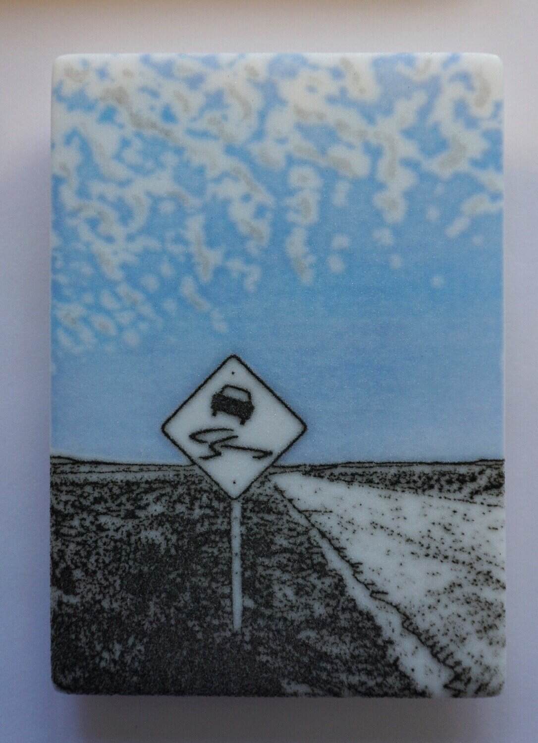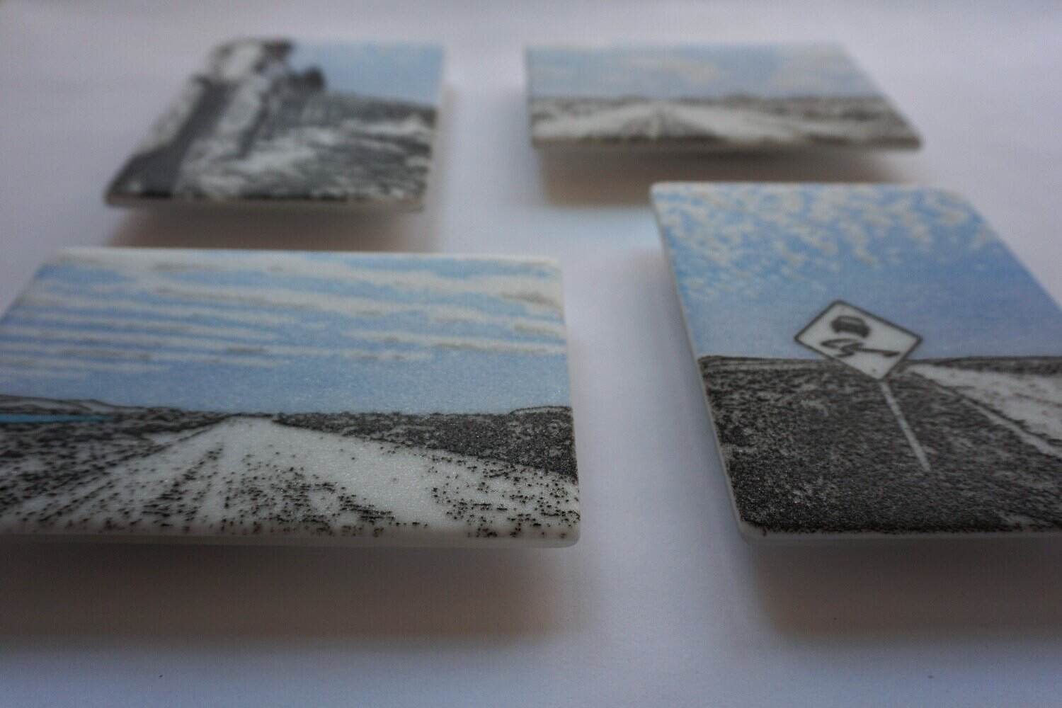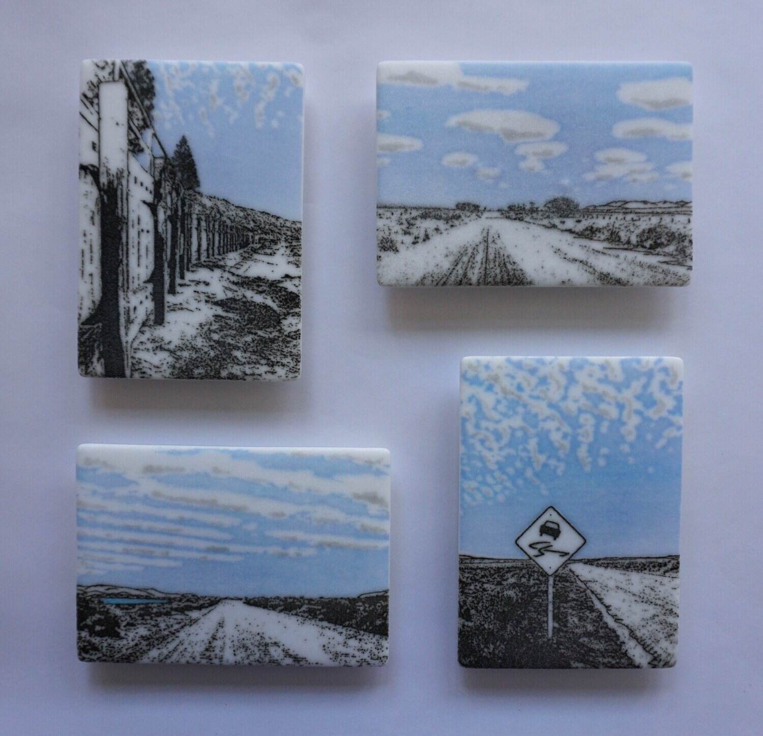 Tale Tales of the Wild West; set of 4. Textural print on glass. These pieces each measure 122mm x 175mm x 6mm thick. They have a velvety/sugary texture. There are fittings on the back to hang them on a wall. Various hanging configurations are possible.