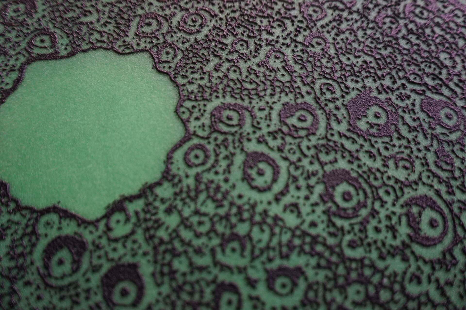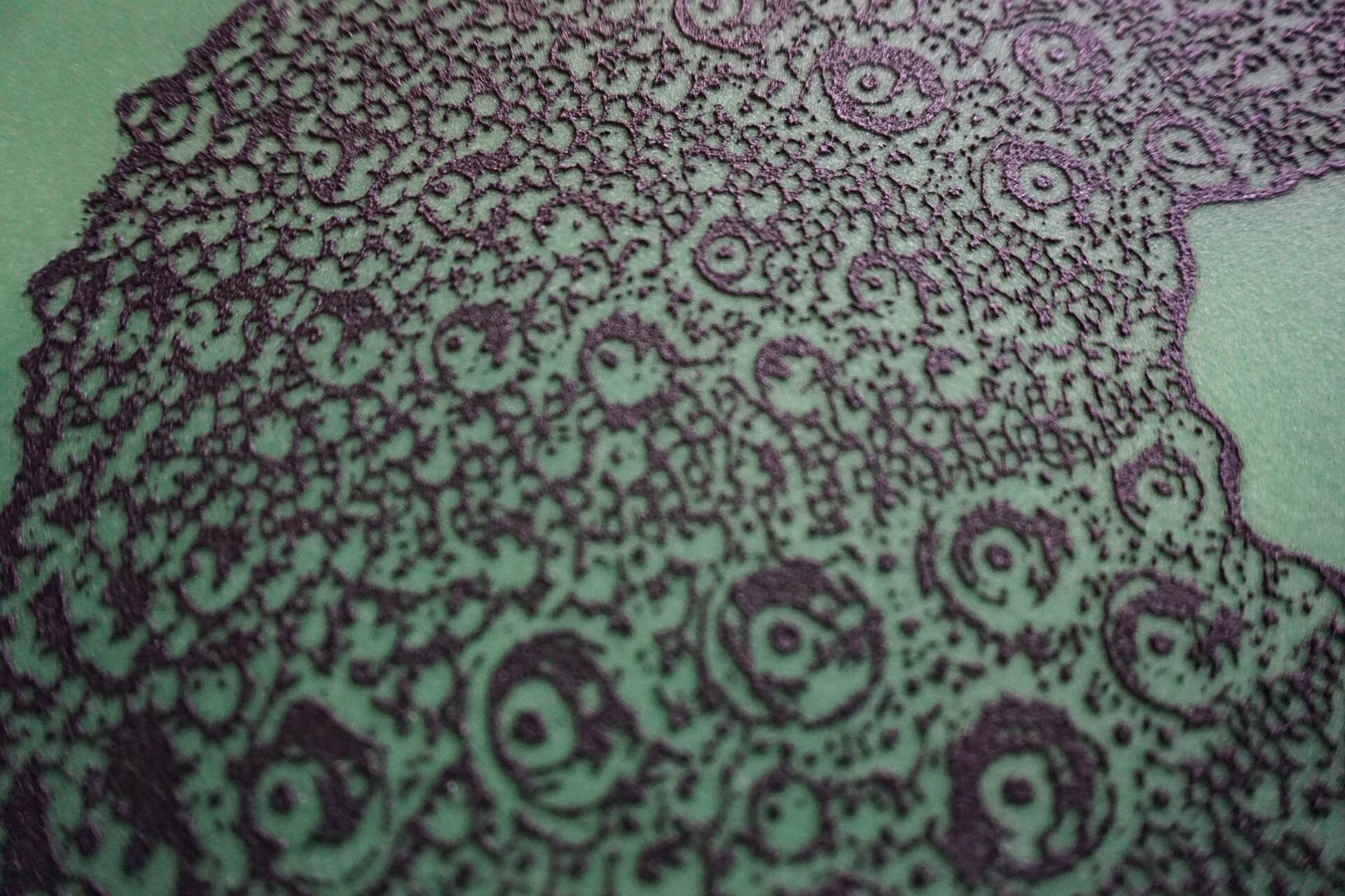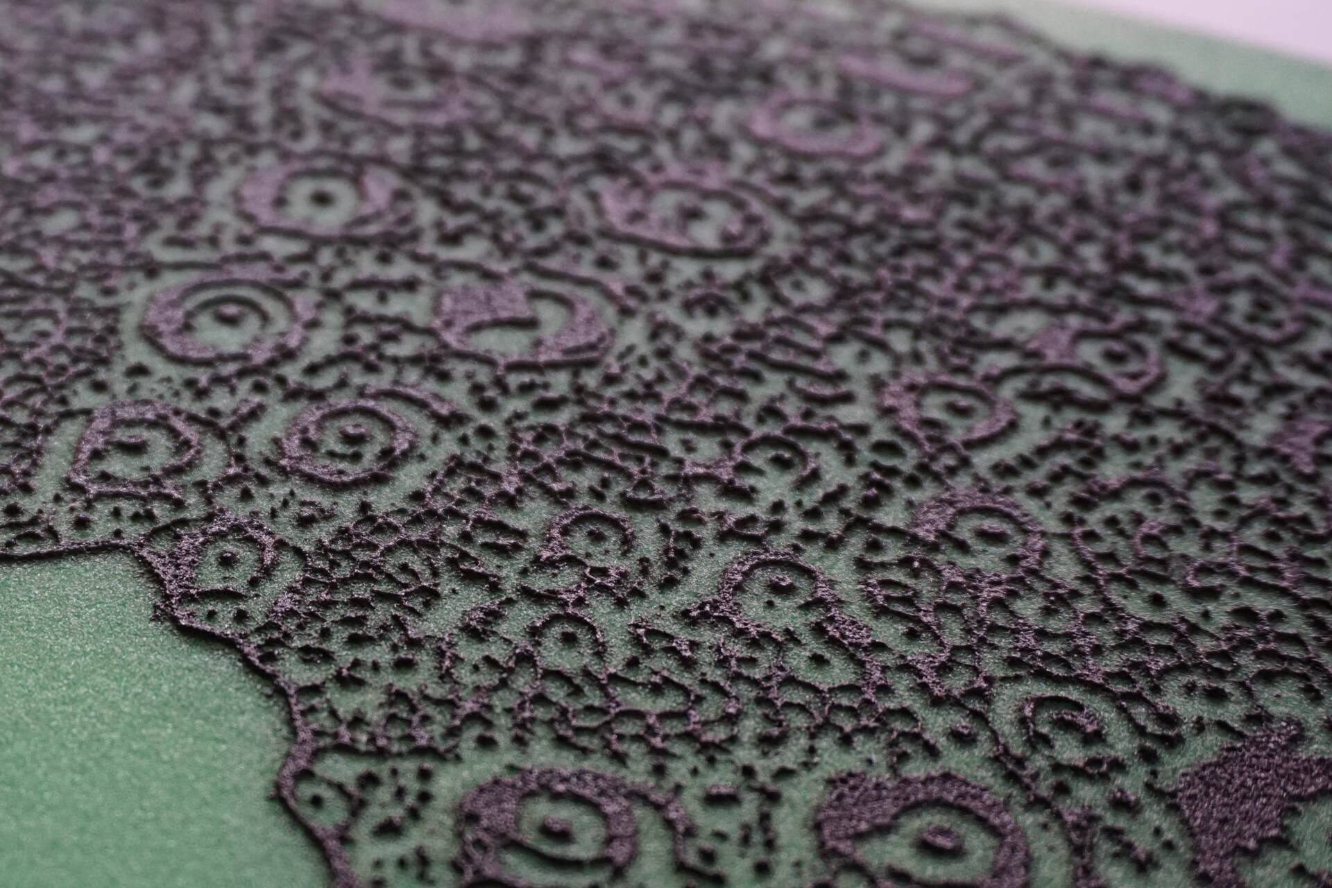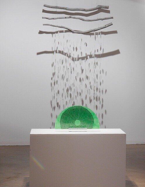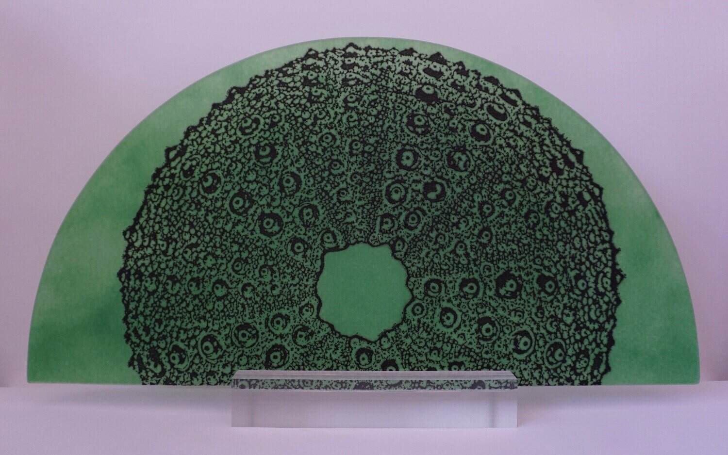 Urchin Lace vessel. This vessel shape is inspired by the bark vessels of indigenous people world wide. It is much more beautiful in person. Kiln-formed textural printed glass. Glass measures 597mm W x 305mm H x7mm approx. Upright Acrylic stand included 50mm high.