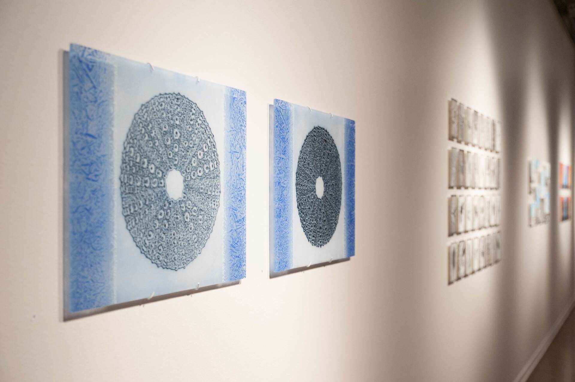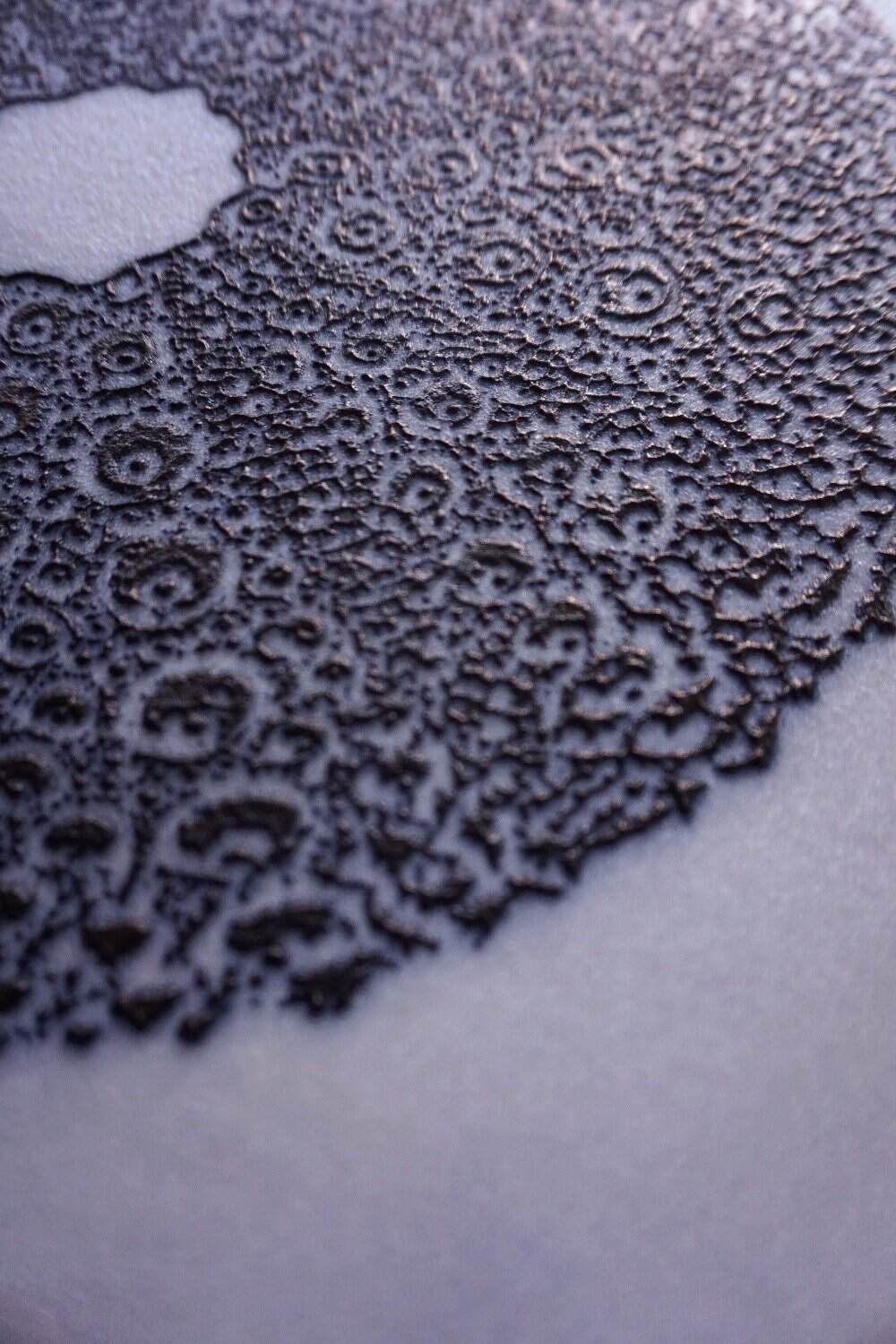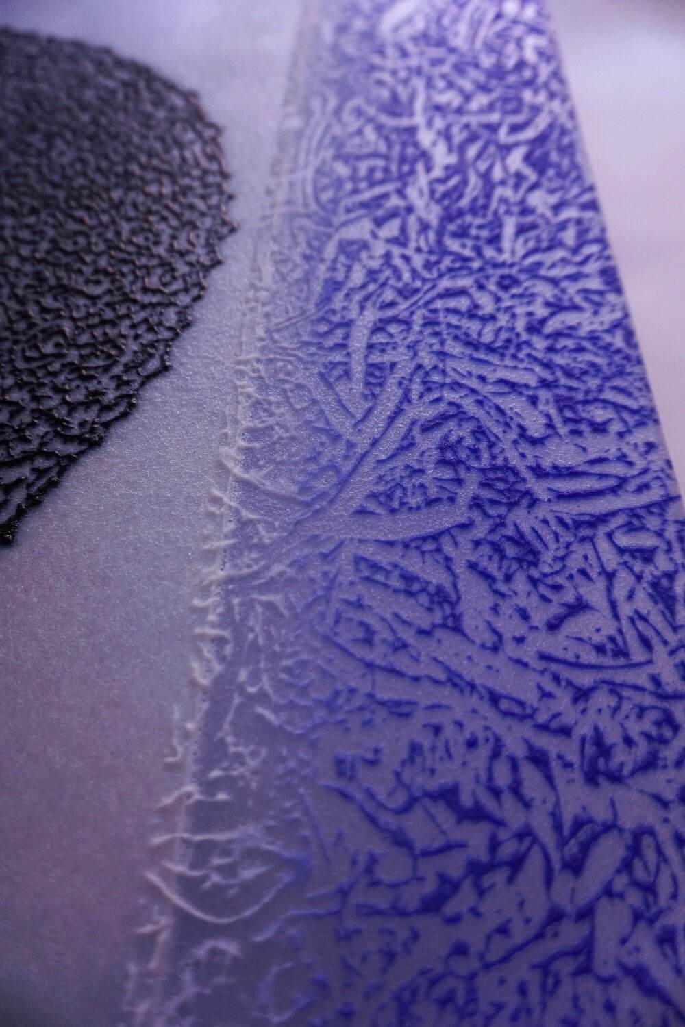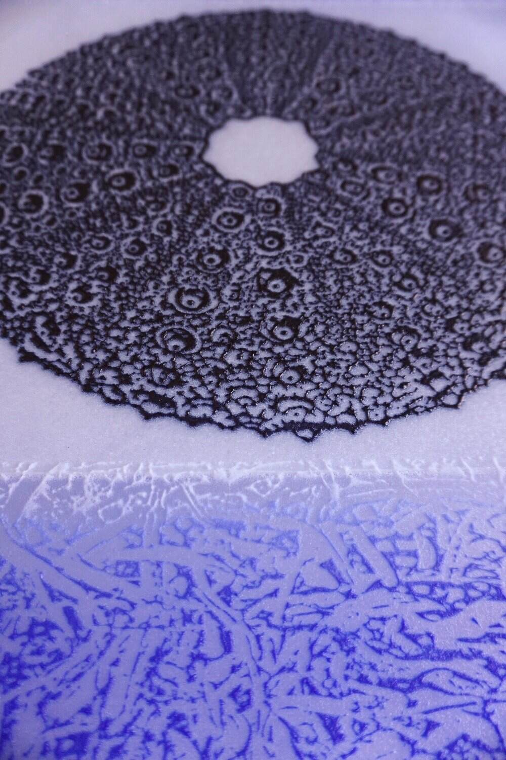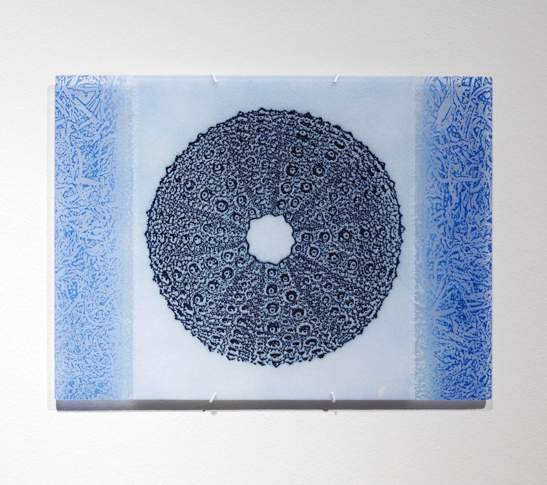 Urchin & Lace wall piece. Kiln-formed textural glass print. 1 piece of glass 450mm x 608mm x 8mm thick. Wall fittings included. This can be hung horizontally or vertically. This is the darker piece from the set of 2.