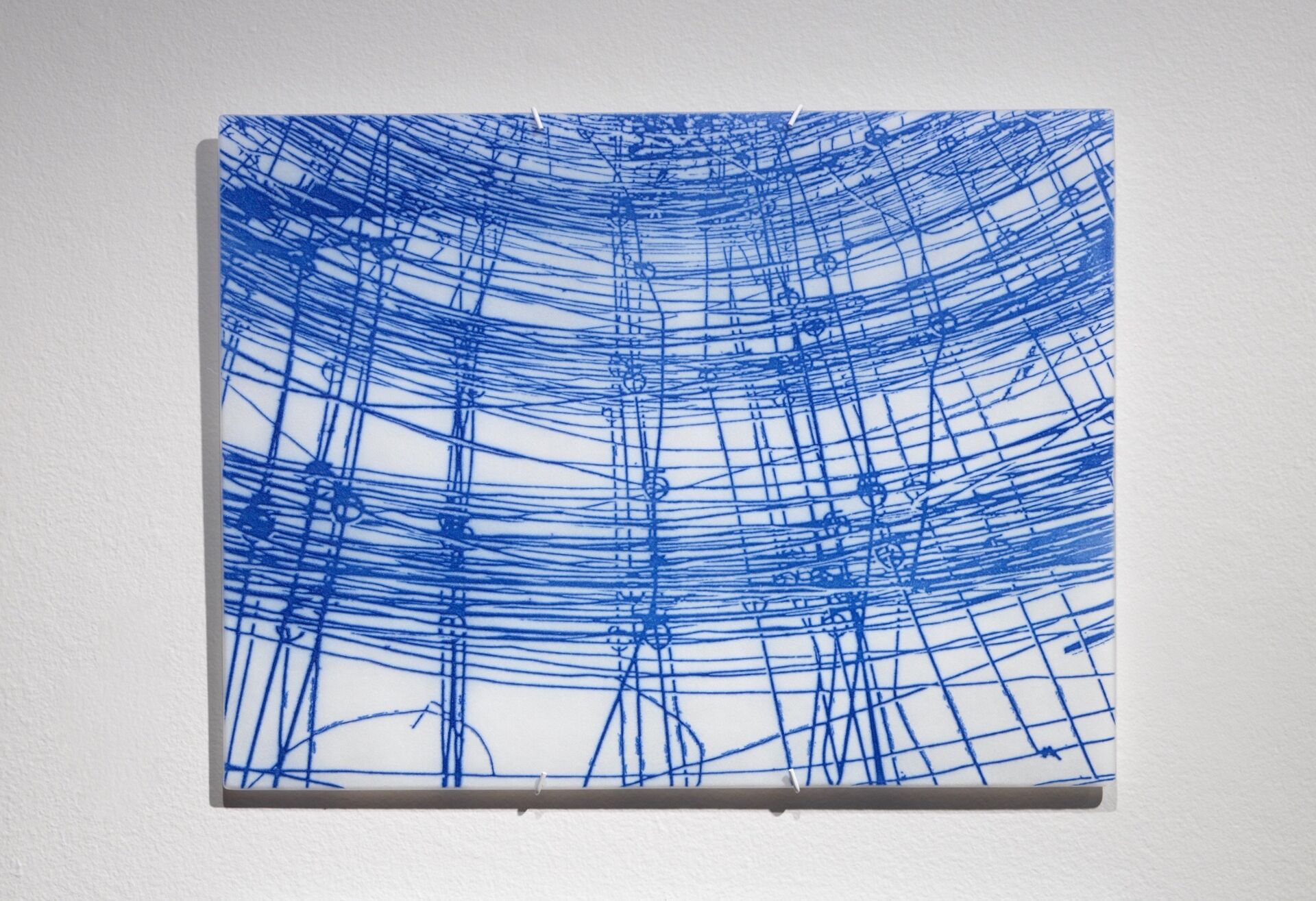 Wire 2; Glass...kiln-formed, textural prints. 1 piece of glass measuring 435mm H x 580mm W x 8mm thick each. Wall fittings included. This is the white & blue piece from the set. It can be hung horizontally or vertically.