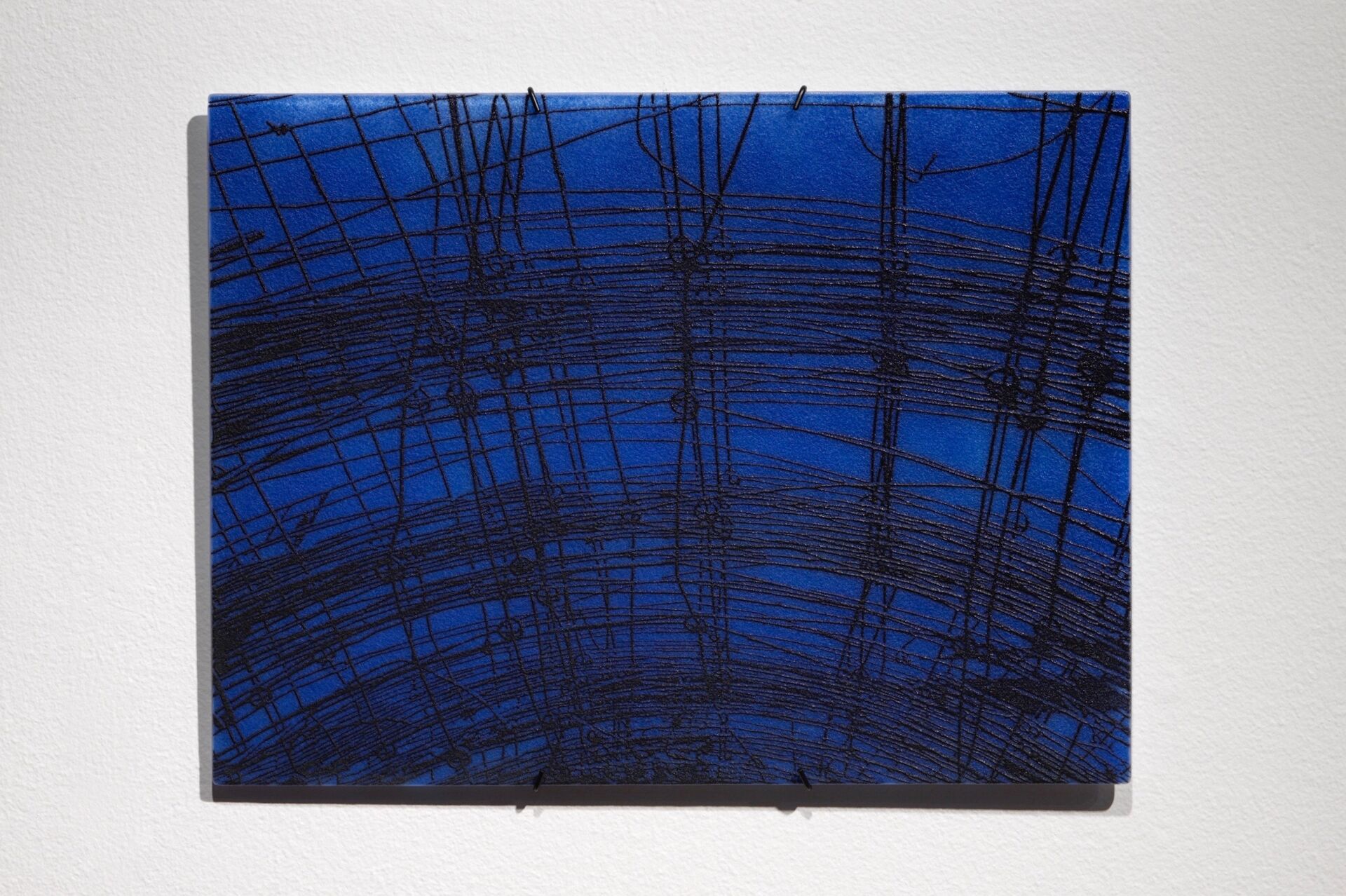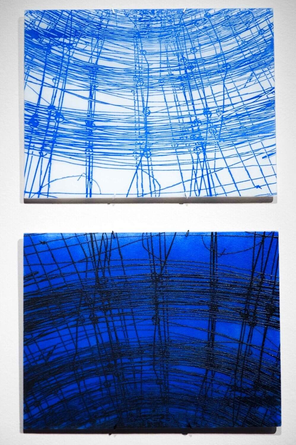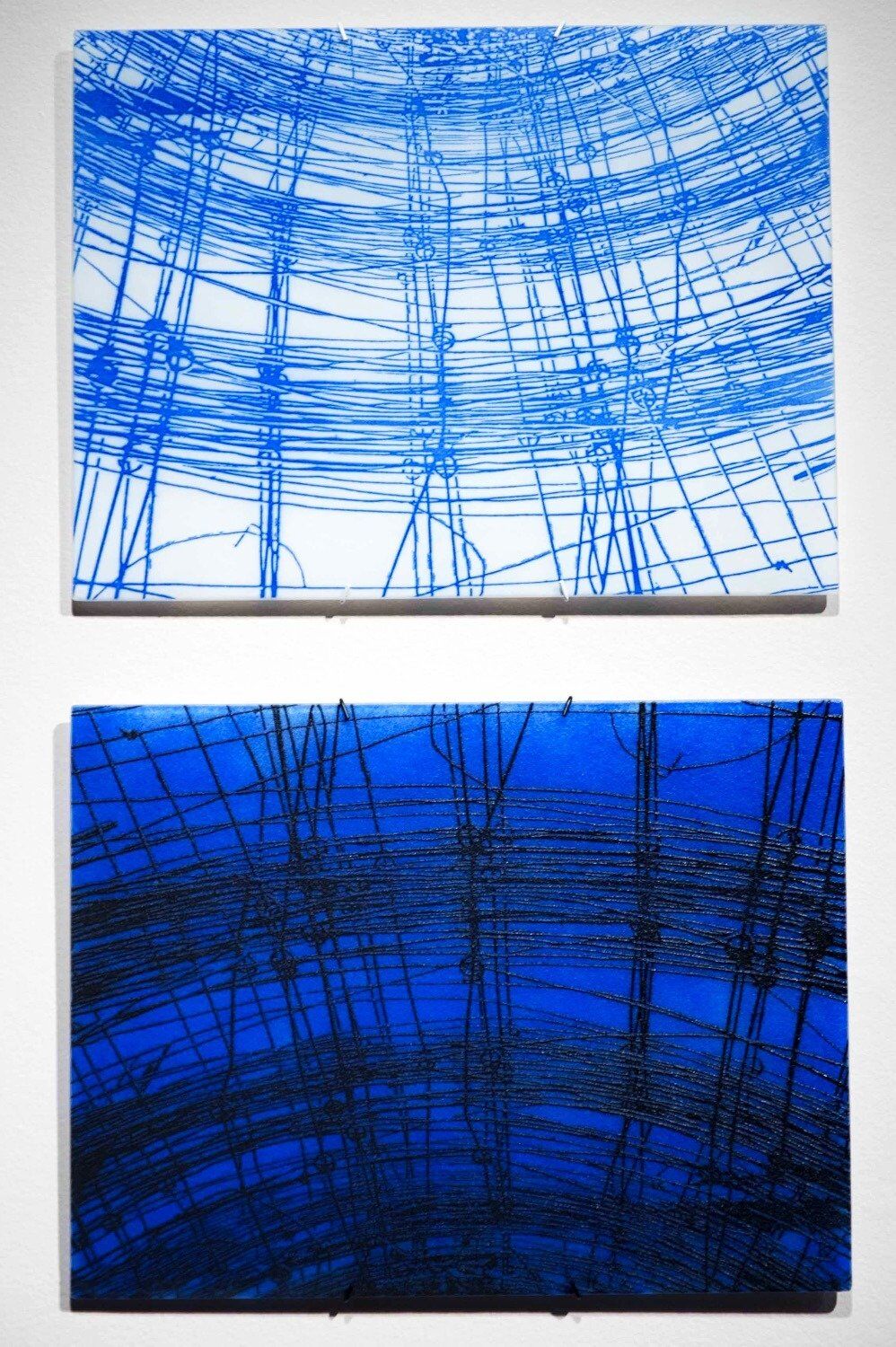Wire 2; Glass...kiln-formed, textural prints. 2 pieces of glass measuring 435mm H x 580mm W x 8mm thick each. Wall fittings included. They look good as a set but also are great individually. These can be hung horizontally or vertically.
